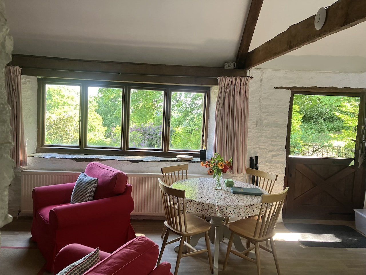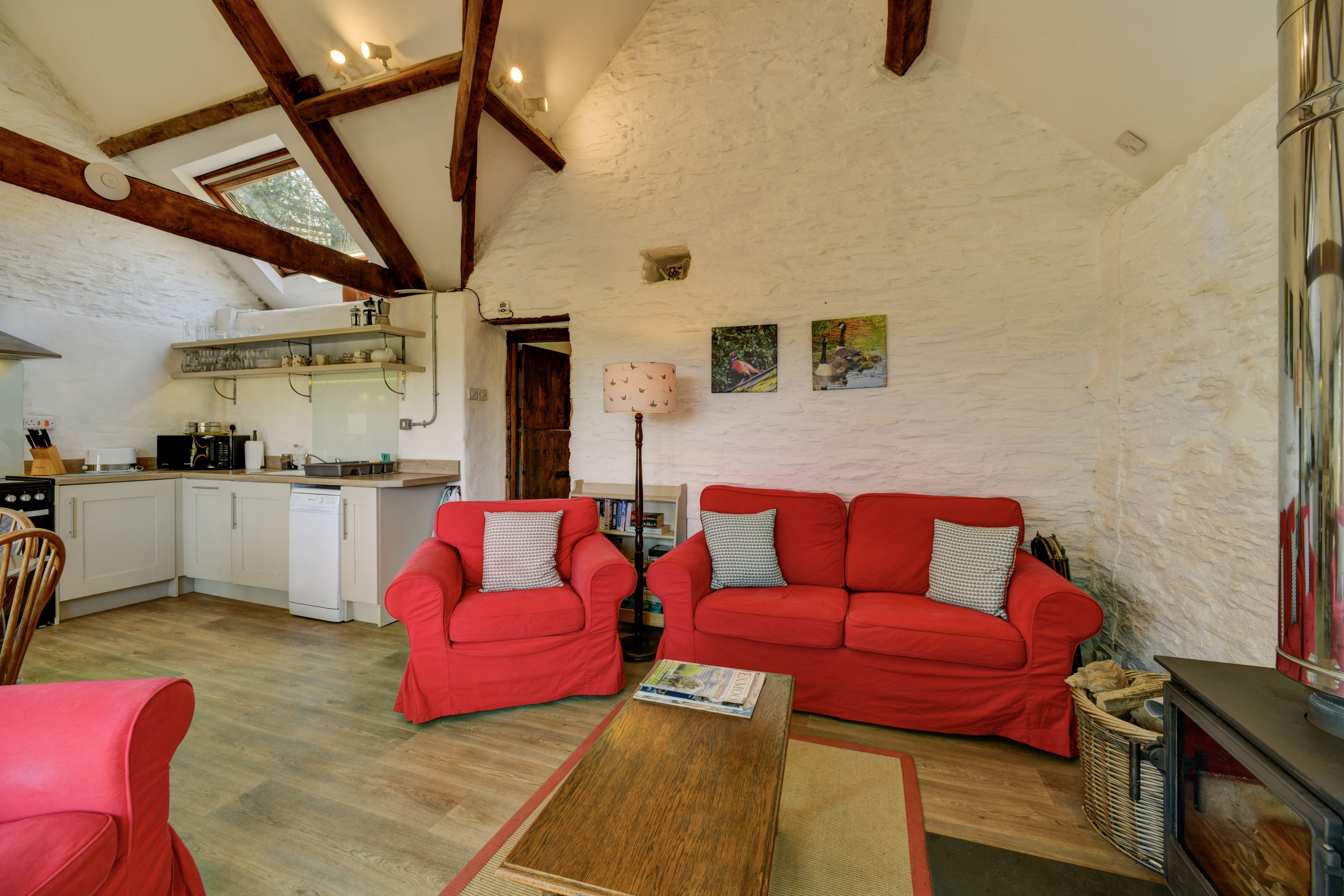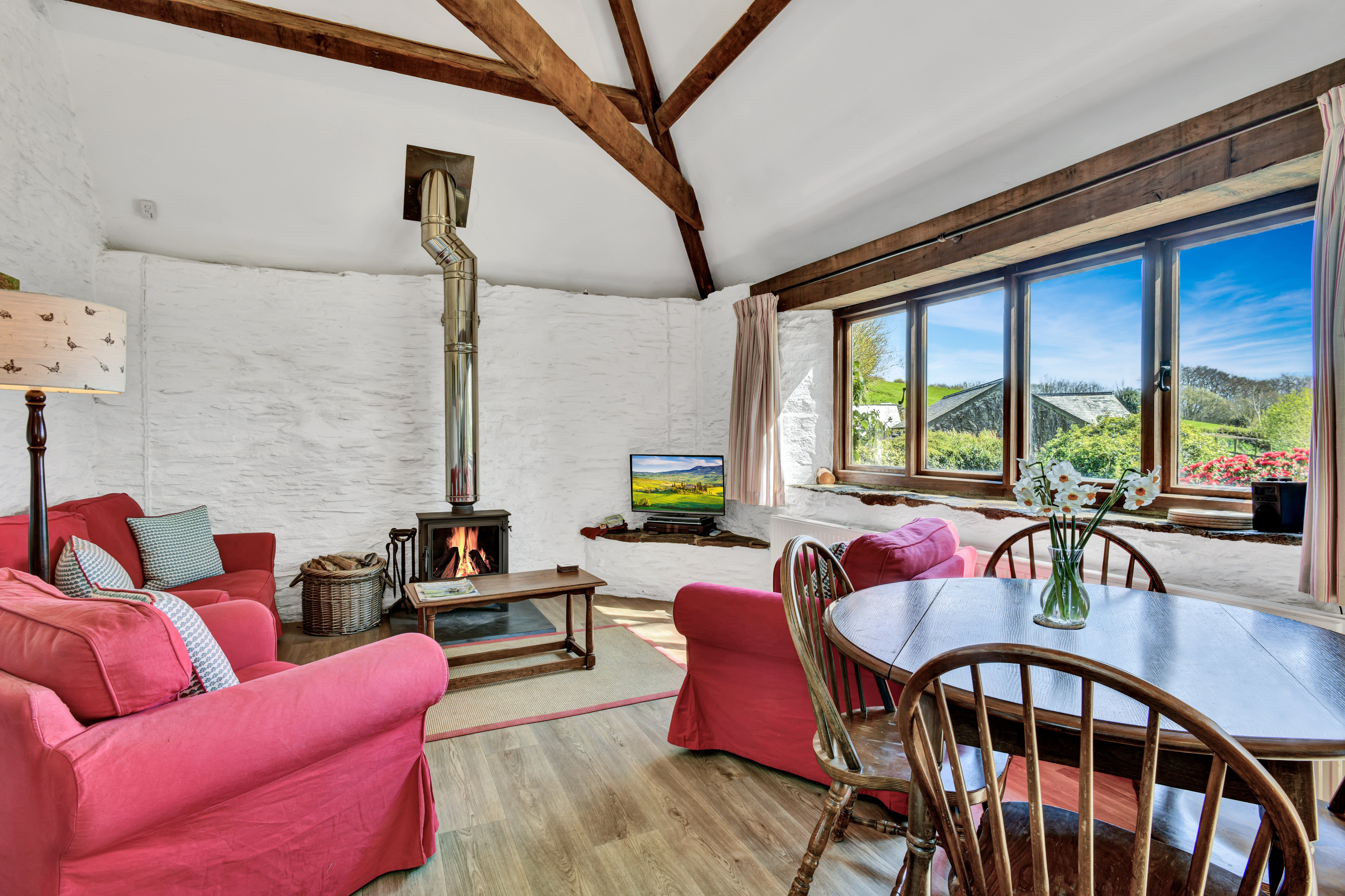 Open plan kitchen and sitting room with vaulted ceilings, original oak beams, television/DVD player/DAB radio, and large window looking out over duck pond and farmland beyond