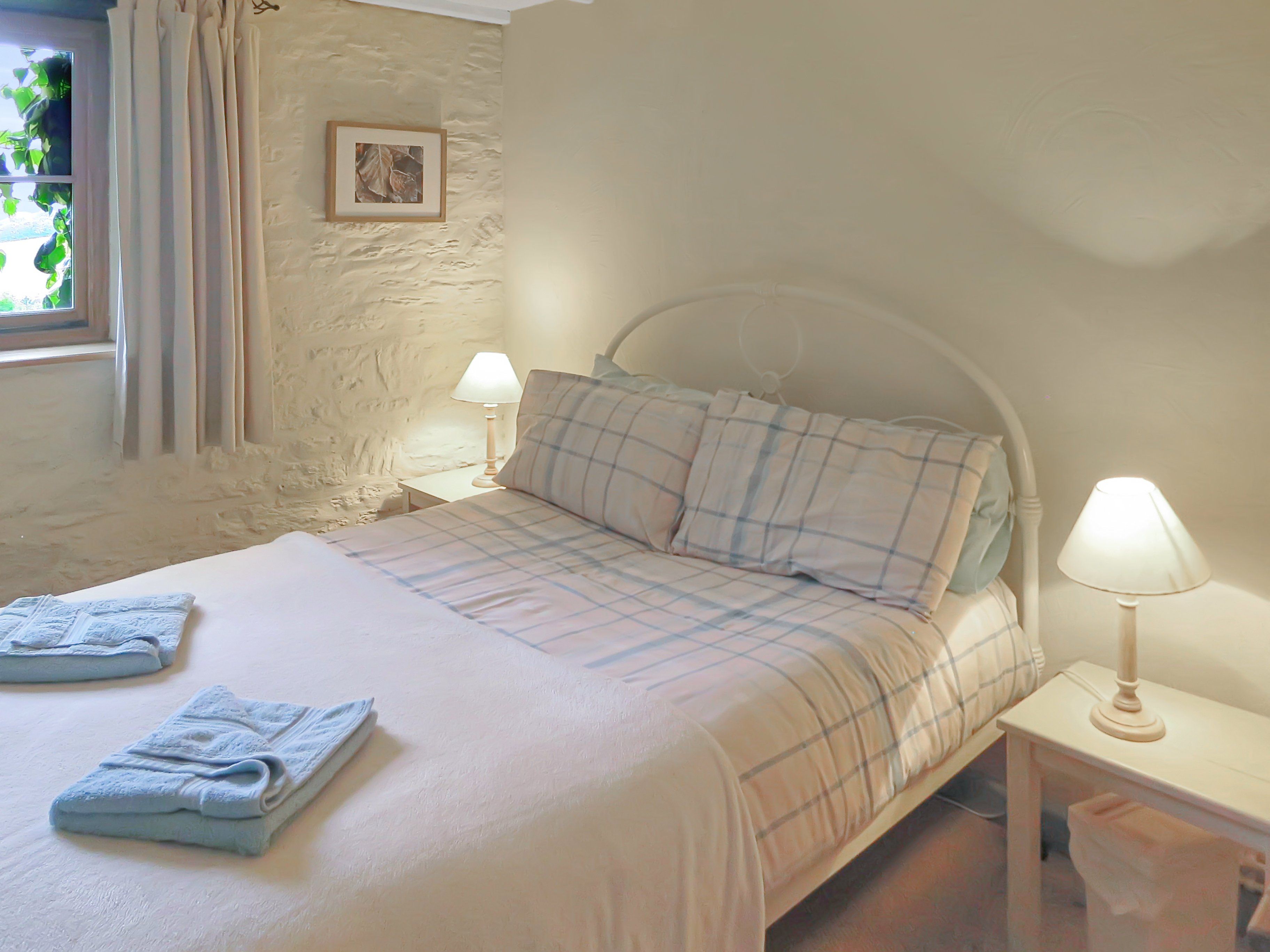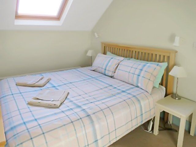 A narrow staircase leads up from the utility area to a second sitting area which overlooks the downstairs living room. There is a desk available here. This area leads through to a double bedroom (King-size bed) with en-suite bathroom (bath, toilet and hand basin). This bedroom also has an external door, with wider, outside steps down to the garden.