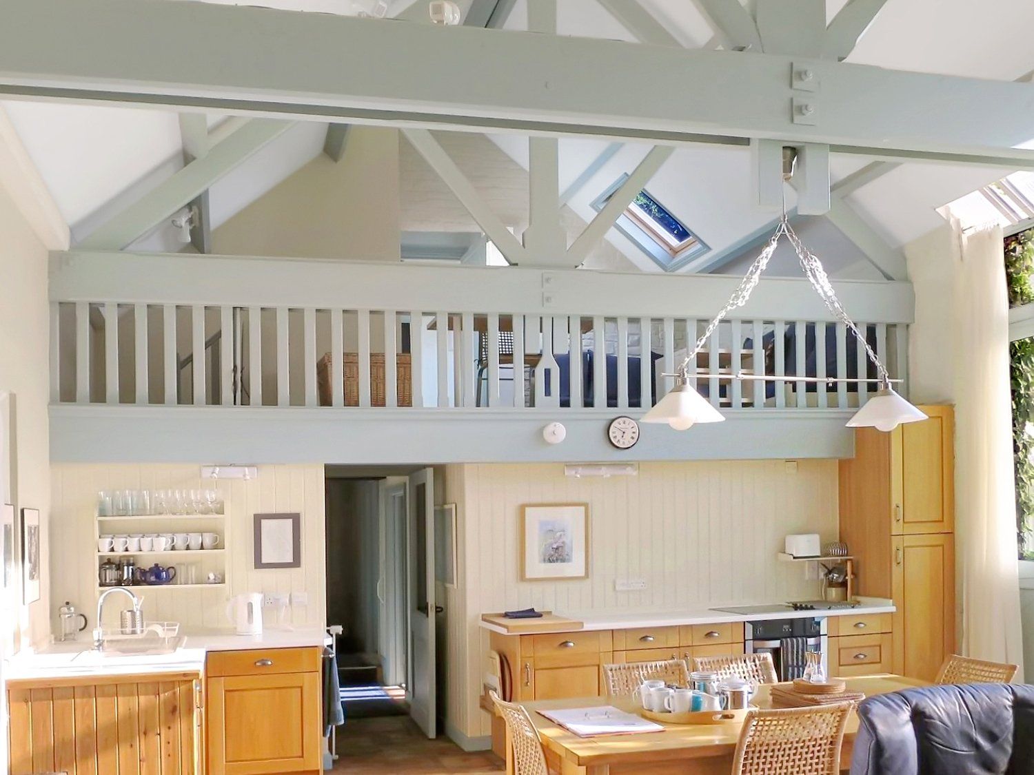 Oak-fitted kitchen fully equipped with kettle, electric oven/induction hob, larder fridge, freezer, microwave, and toaster