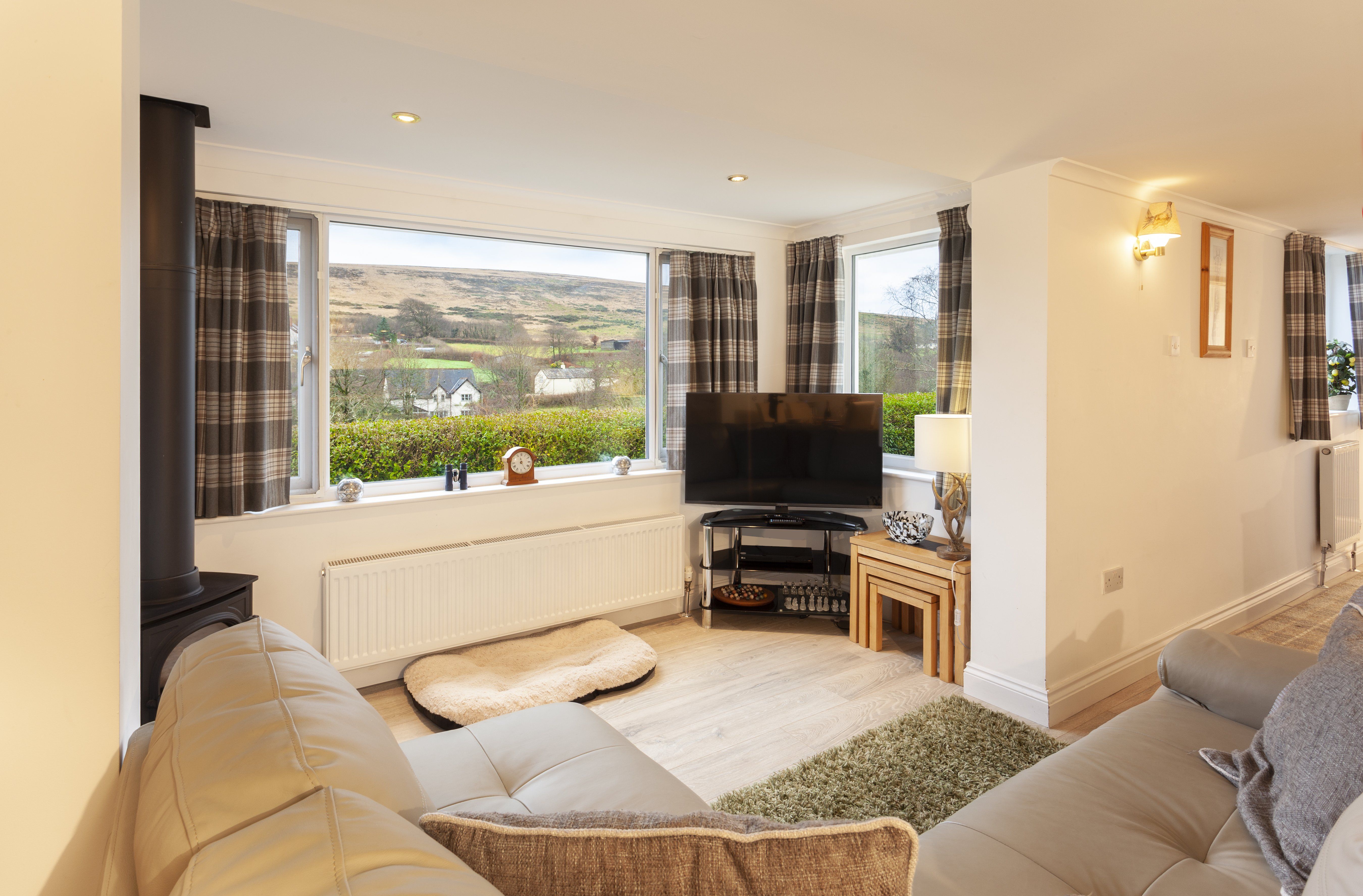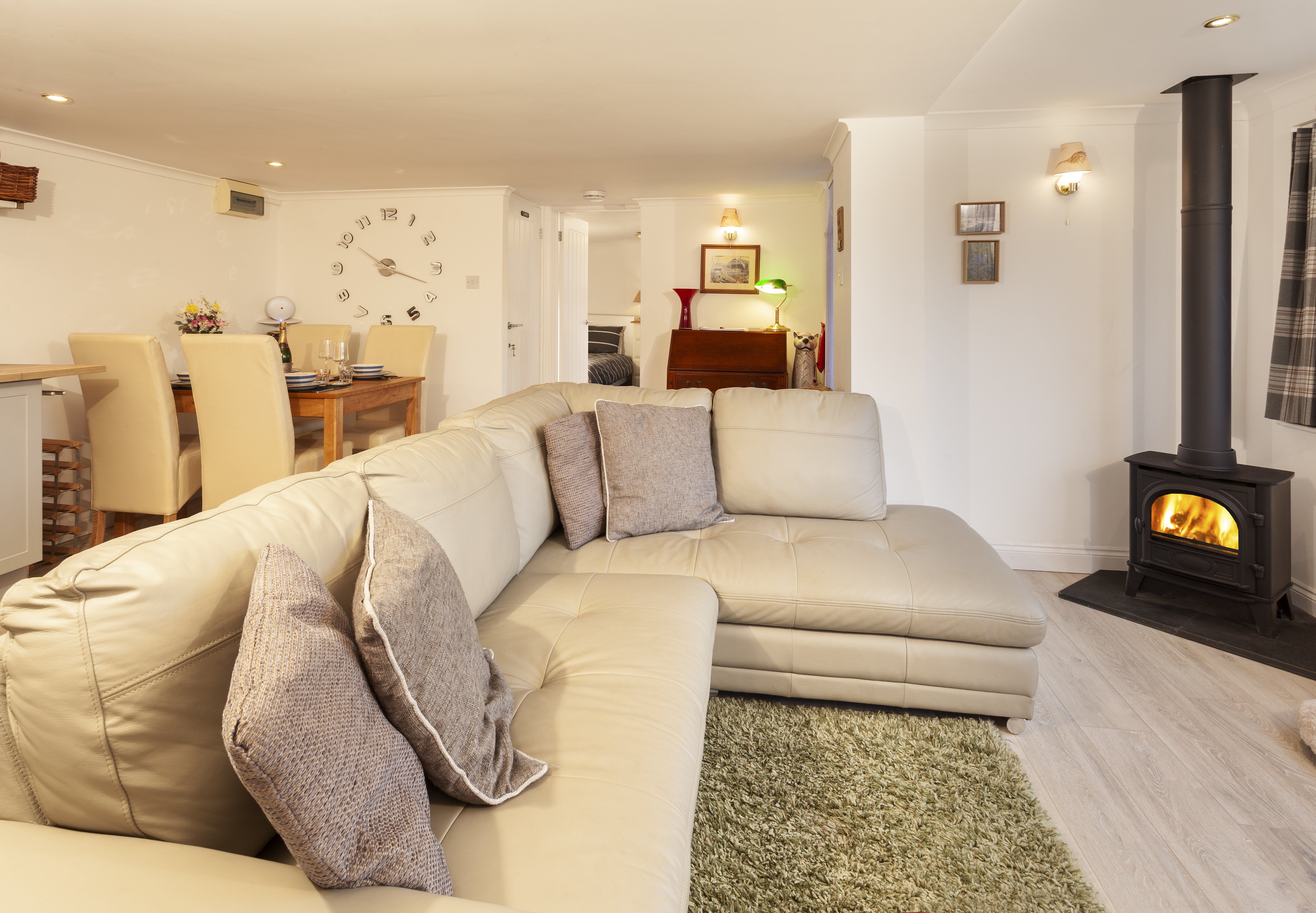 Entry is via the porch, with heating, making it an ideal area for drying off wet outdoor coats and boots, then into the open-plan living area with a comfortable leather corner sofa, Smart TV and DVD player. There is a gas 'log burner' style fire for cosy evenings in. The kitchen is well equipped for dining in and the dining area will comfortably seat four. The kitchen includes an under-counter fridge with freezer compartment, dishwasher, microwave, and electric oven plus hob. Other equipment includes toaster, kettle, a variety of cookware, kitchen utensils, cutlery, crockery and glasses. The utility cupboard houses the washing machine and some cleaning equipment.