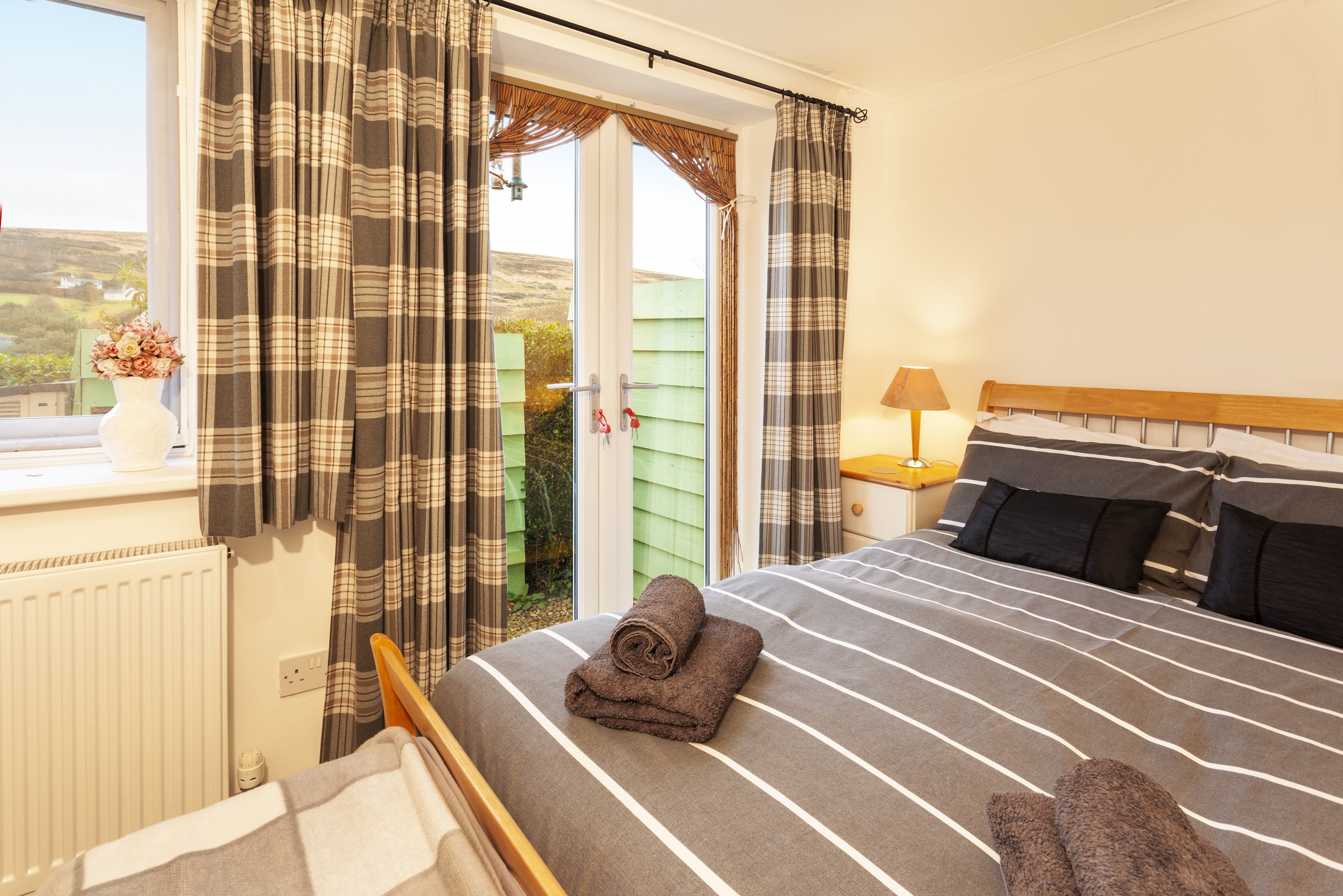 The twin bedroom is off the living area and has a Smart TV and built in wardrobe, where the hoover is stored. A hallway leads to a family bathroom with toilet, hand basin, and bath with overhead shower. The double bedroom has French doors leading out to a secure gravelled picnic area, with which includes an outdoor sofa, table, chairs and parasols and a bird feeding station. There is also a separate toilet with hand basin directly outside the main double bedroom. Both bedrooms have a TV.