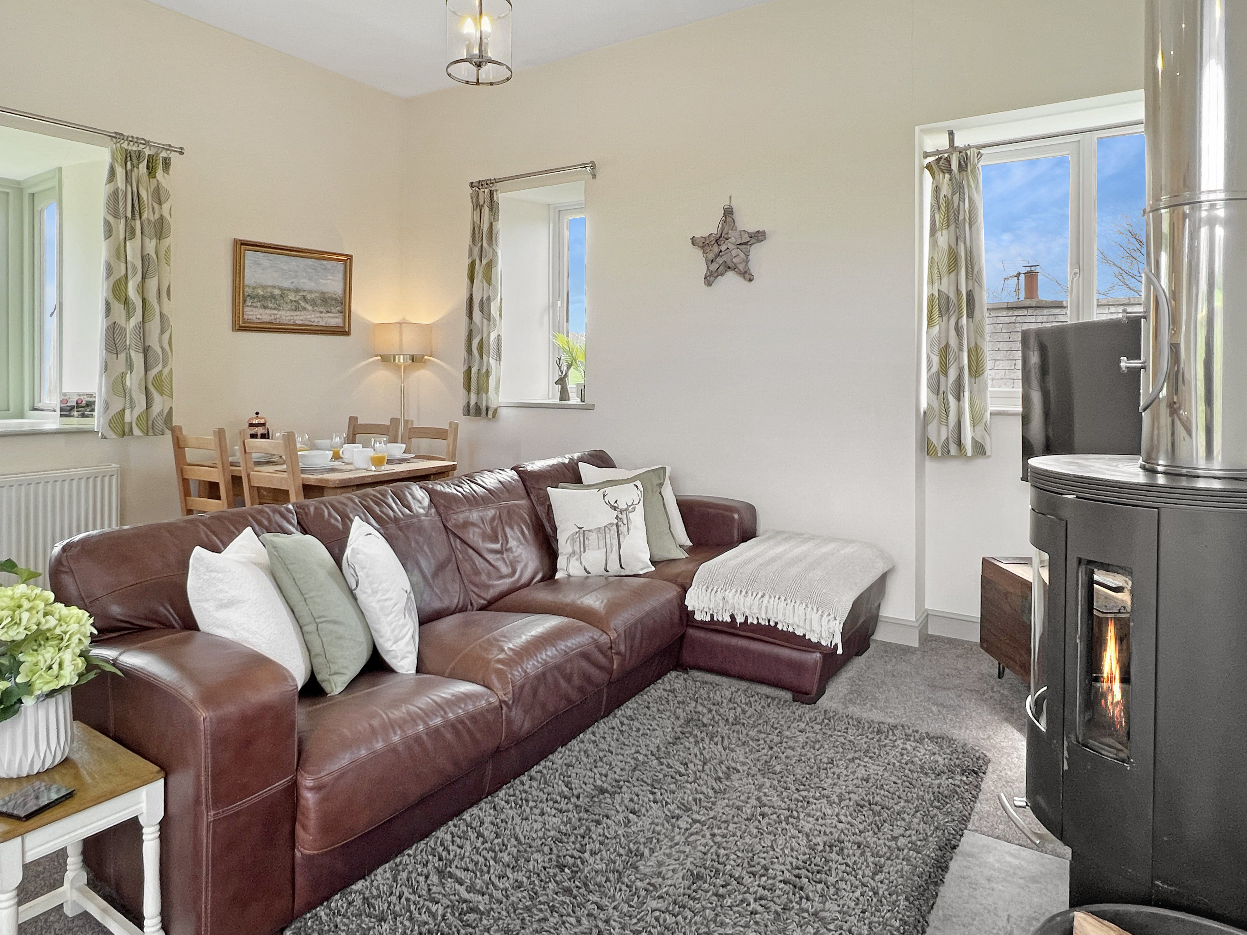 A 50" Smart television is provided in the living room with a cosy log fire.
