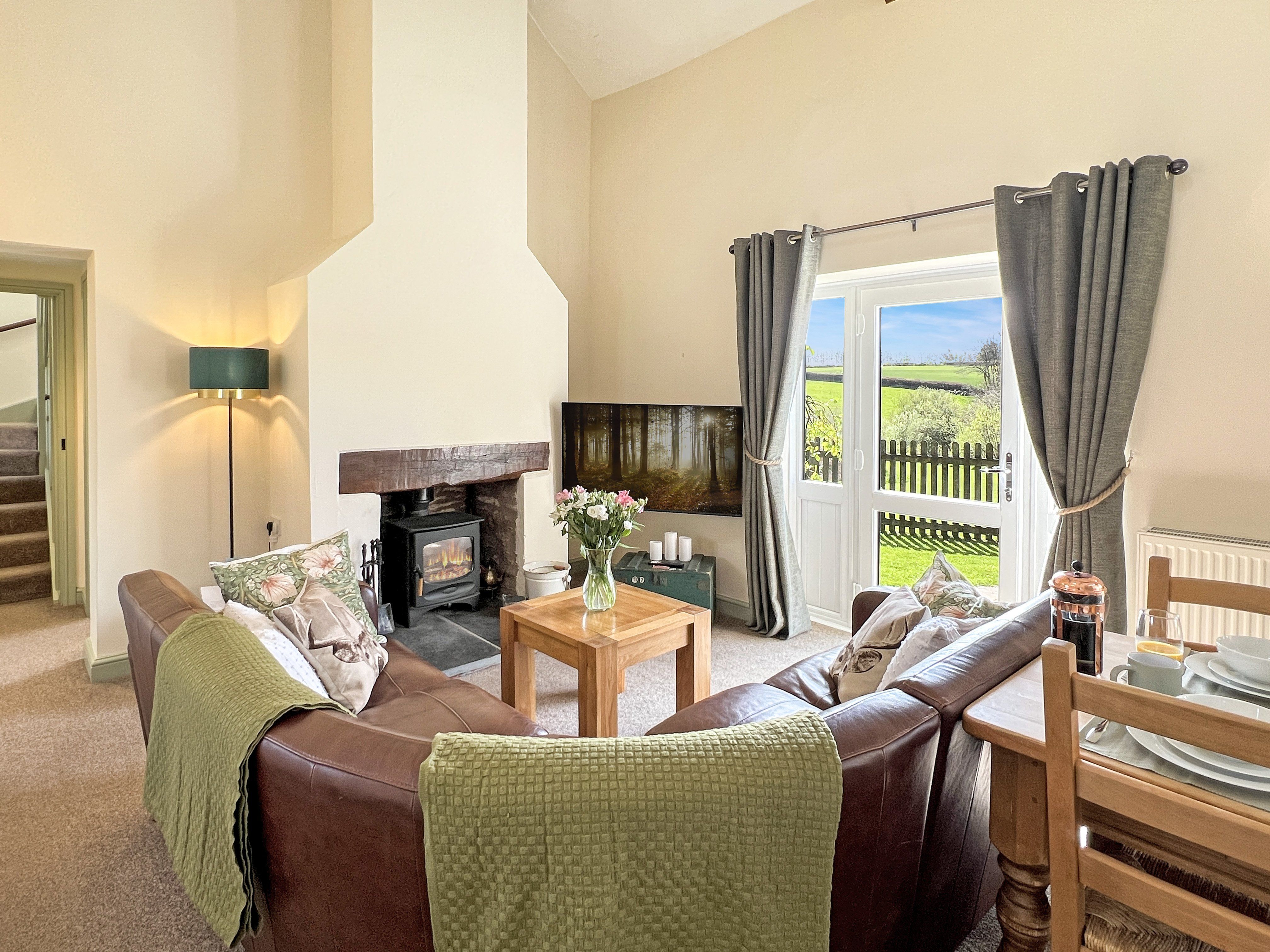 The lounge/diner is stylishly furnished and welcoming, with comfortable seating, a Smart TV, DVD player, and a cosy wood burner—perfect for unwinding after a day out. The dining area offers a great spot for relaxed meals.