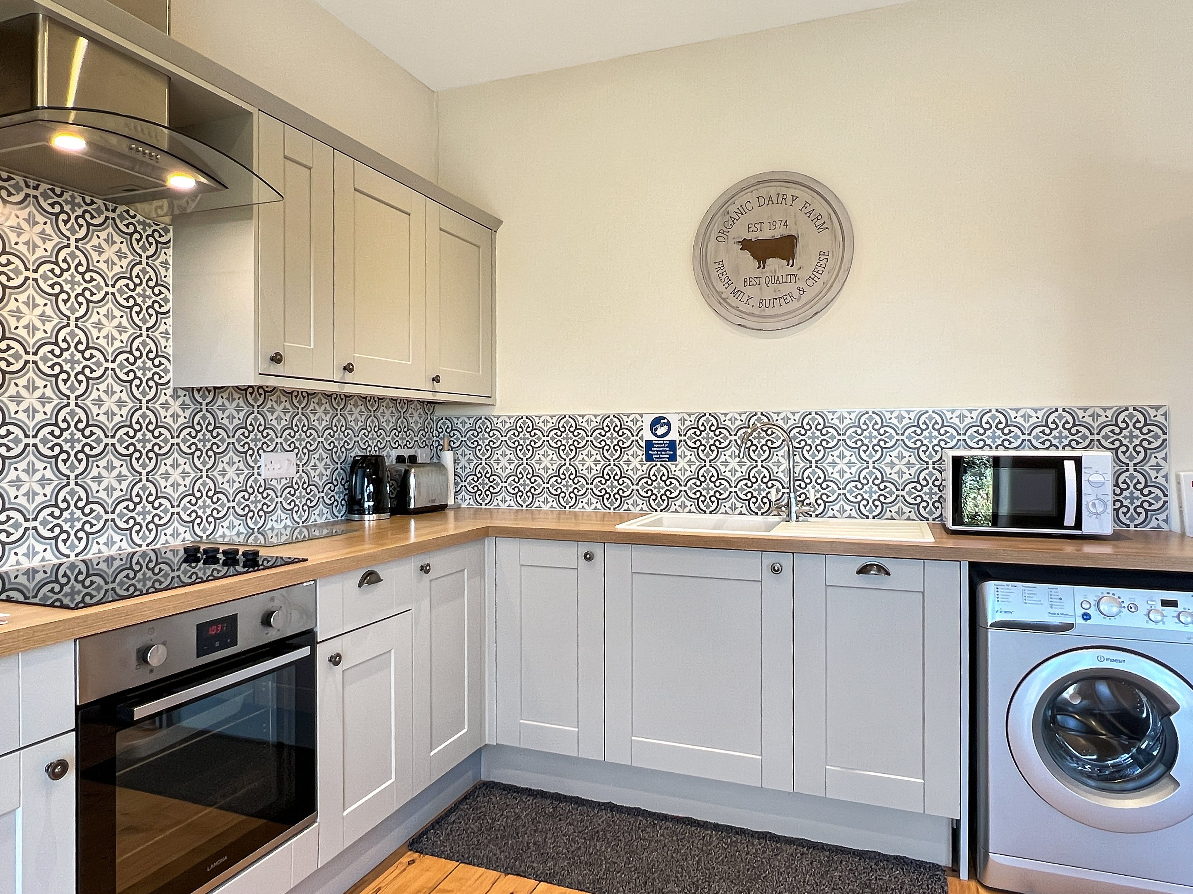 Facilities The kitchen is well equipped with electric oven and hob, under-counter fridge with a small freezer compartment and washing machine. Other kitchen items include microwave, toaster, kettle, cafetiere, a variety of cookware, kitchen utensils, cutlery, crockery and glasses. Two tea towels will be provided.