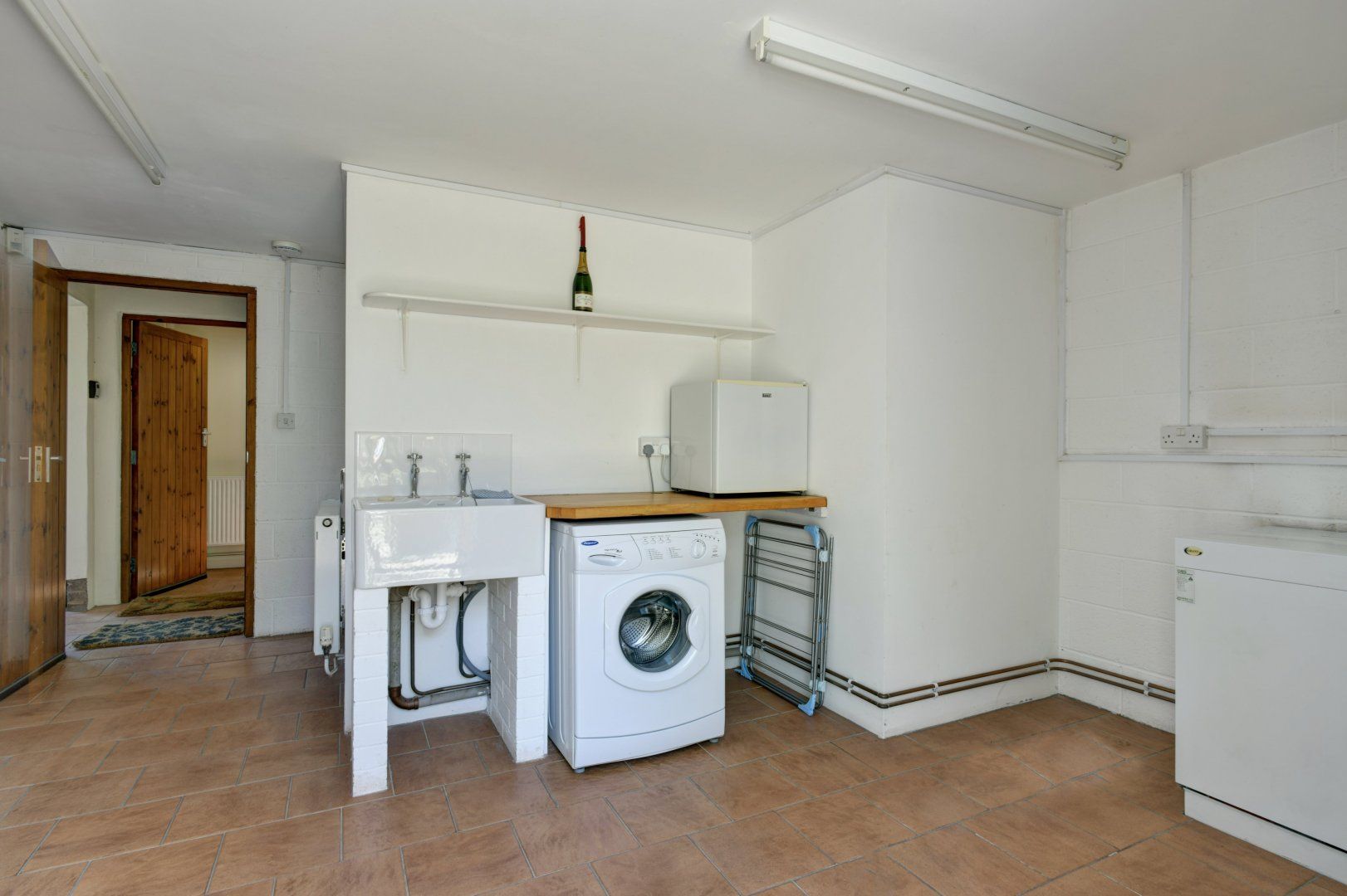 Fully fitted first floor kitchen well equipped with electric oven and ceramic hob, fridge, freezer, microwave, toaster, kettle, variety of kitchen utensils, cutlery, crockery, and glasses, plus washing machine