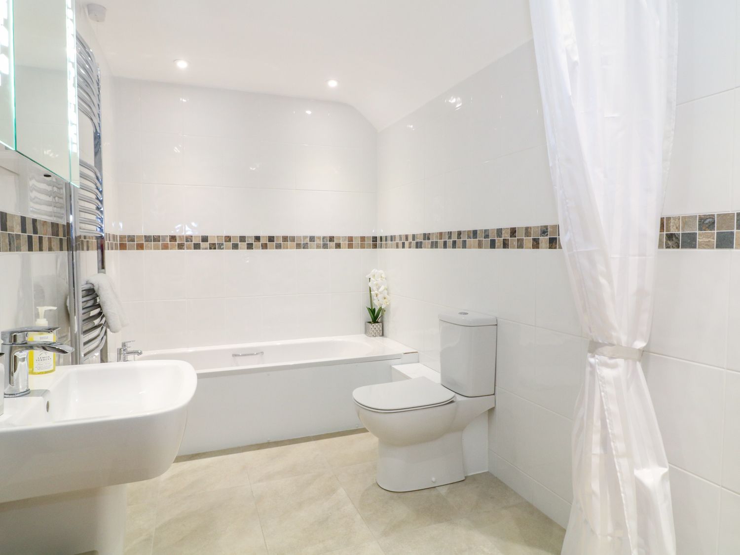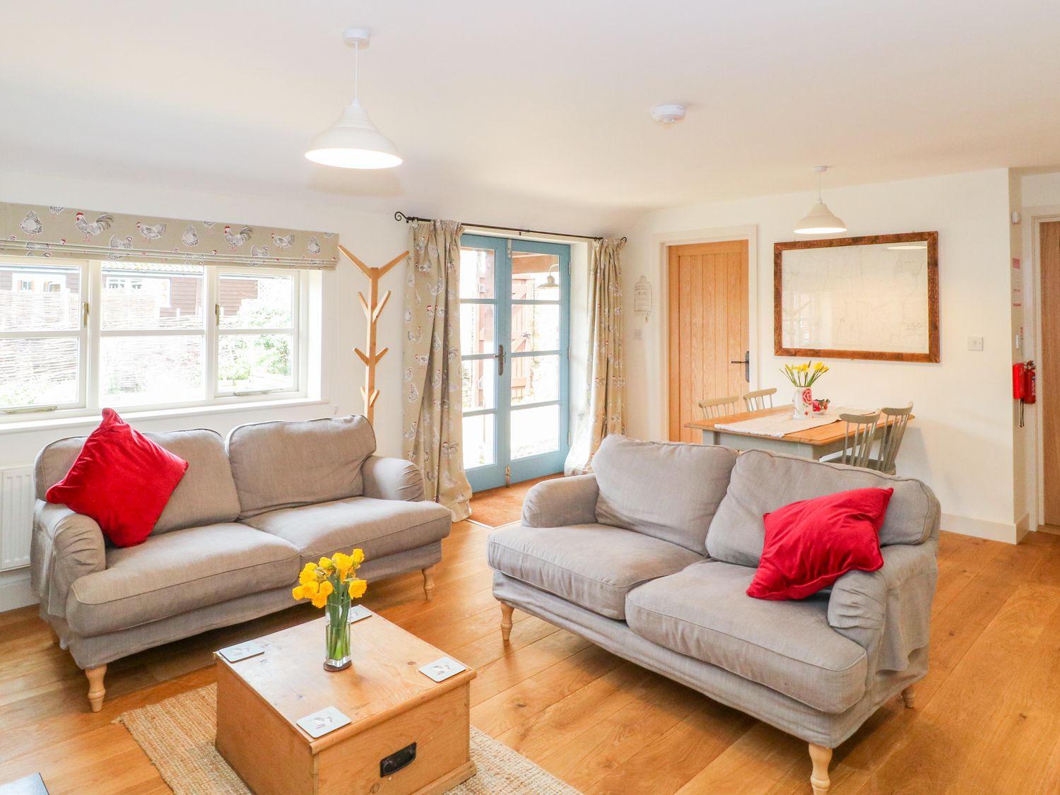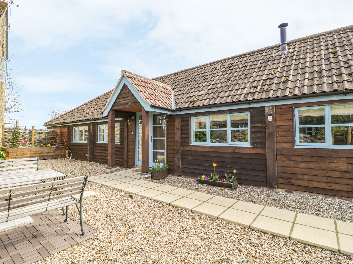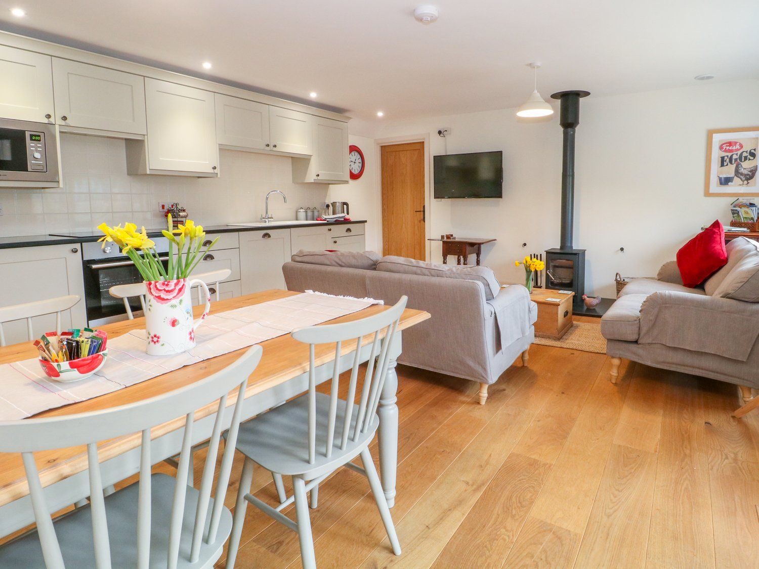 Accomodation Details All ground floor. Two bedrooms: 1 x king-size double with TV, 1 x twin with TV. Bathroom with bath, separate walk-in shower and shower chair available on request, basin and WC. Open-plan living room with kitchen, dining area and sitting area with woodburning stove.