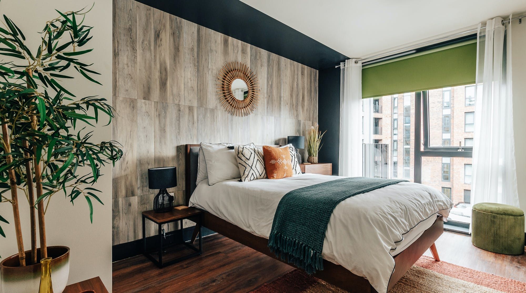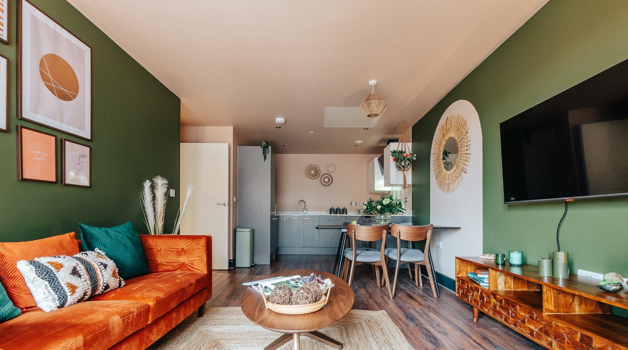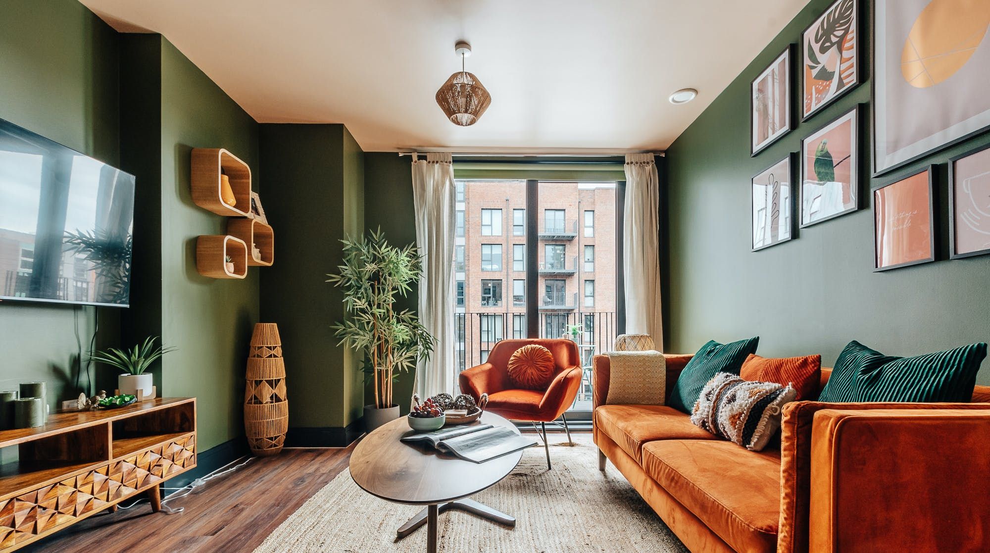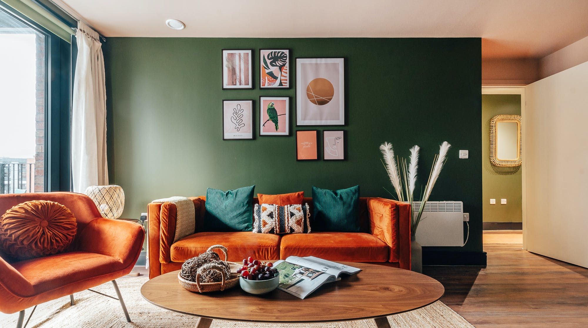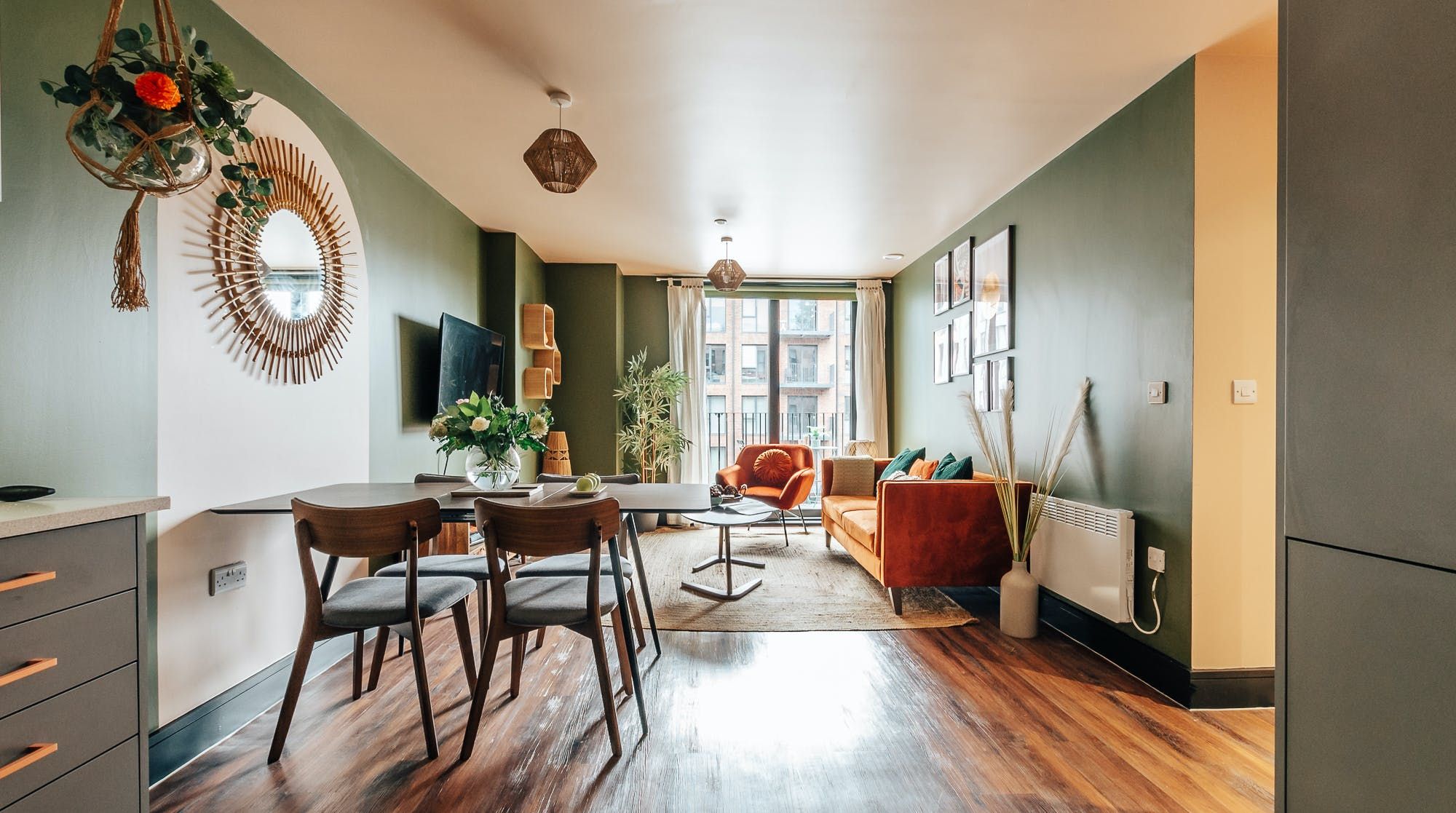 This quirky flat in Sheffield has urban cool written all over it. Lush greens, bold oranges, leafy plants and bamboo accents give the place a natural, bohemian flair. We think it's as cosy as it is stylish, making it an excellent base to come home to after a busy day. The private balcony is the icing on the cake – it's the perfect spot to sip morning coffees and evening cocktails as the sun goes down. Everything you need for a relaxed stay is taken care of – there are two stylish bathrooms so nobody needs to wait in line, Netflix on the smart TV if you want to chill at home and a desk if you need to do a bit of work. Cooking is anything but a chore in the sleek kitchen, which has plenty of dinnerware for when you're in the mood to rustle up a meal. Java junkies will also be pleased to see both a Nespresso machine and a cafetiere. Best of all, the location is pretty much perfect. Set in vibrant Kelham Island, there's a wealth of independent eateries, bars, music venues and pubs within walking distance. Plus, the city centre is just a twenty-minute stroll away – trust us, you'll never be short on things to do here.