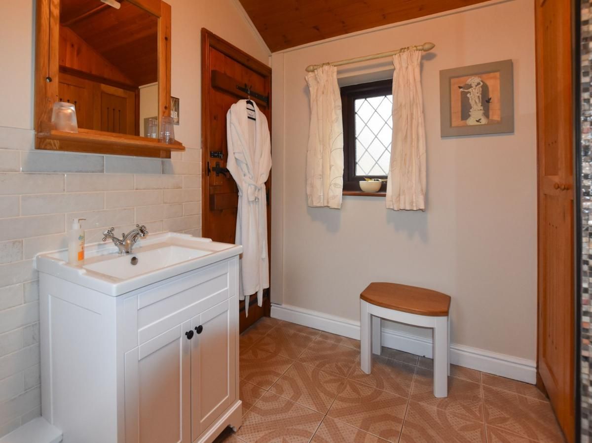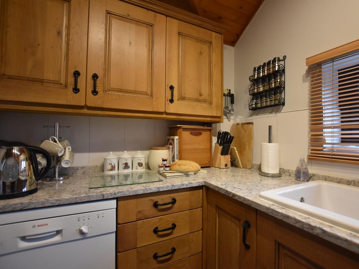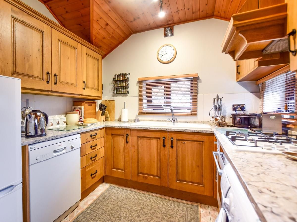 Upon entering, you’ll find the cosy lounge/diner with a beamed ceiling and a wood burner-effect gas fire, providing a warming ambience on cooler days. There’s an array of books on the shelf, a Smart TV with Sky, and comfortable seating.