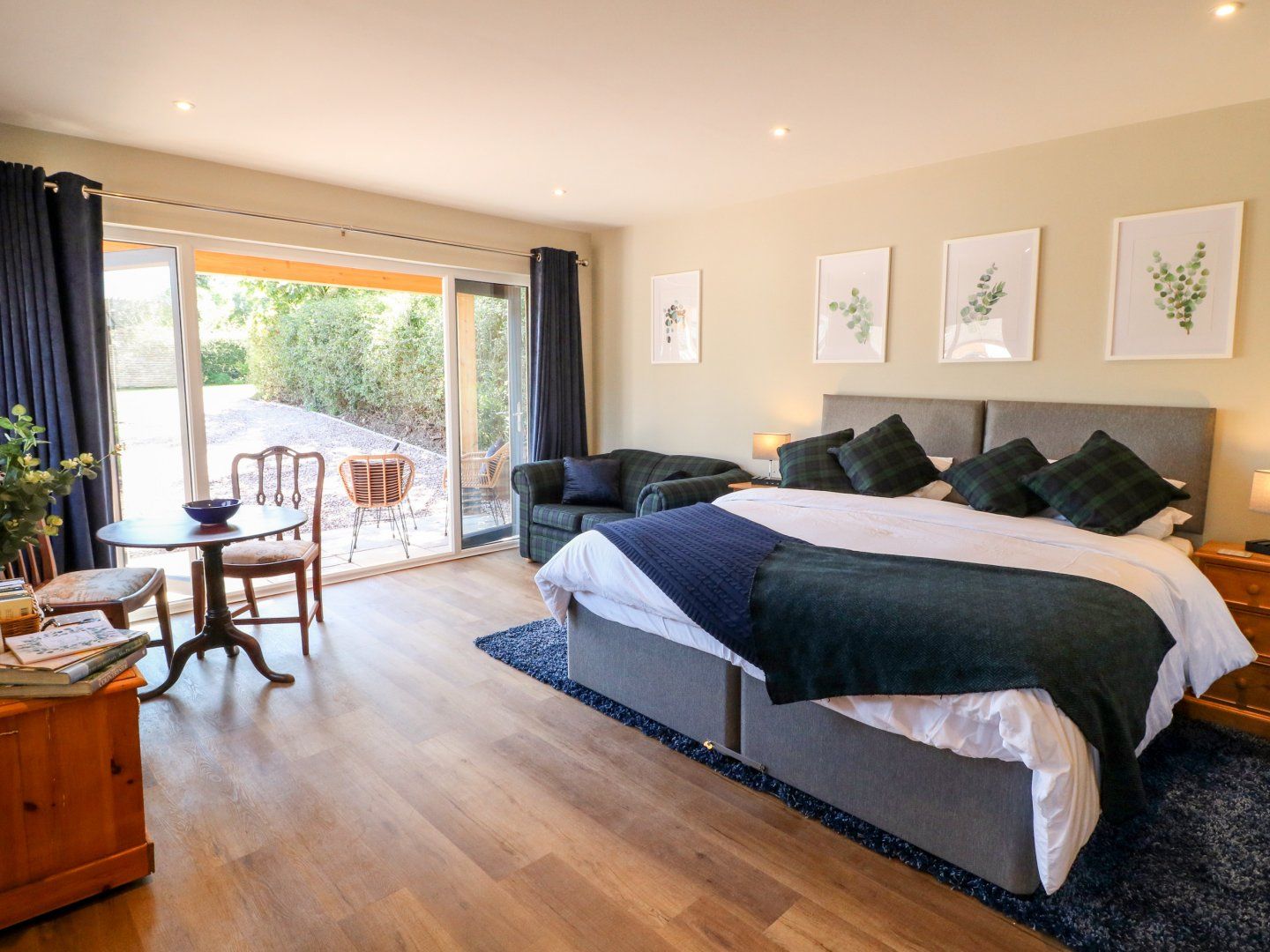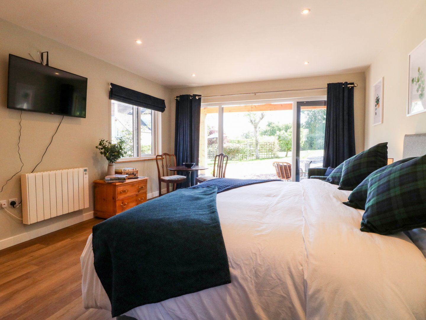 Single-storey. Studio style layout with super-king-size bed (zip/link, can be twin on request), dining area and sitting area with Smart TV. Shower room with walk-in shower, basin, heated towel rail and WC. Kitchen