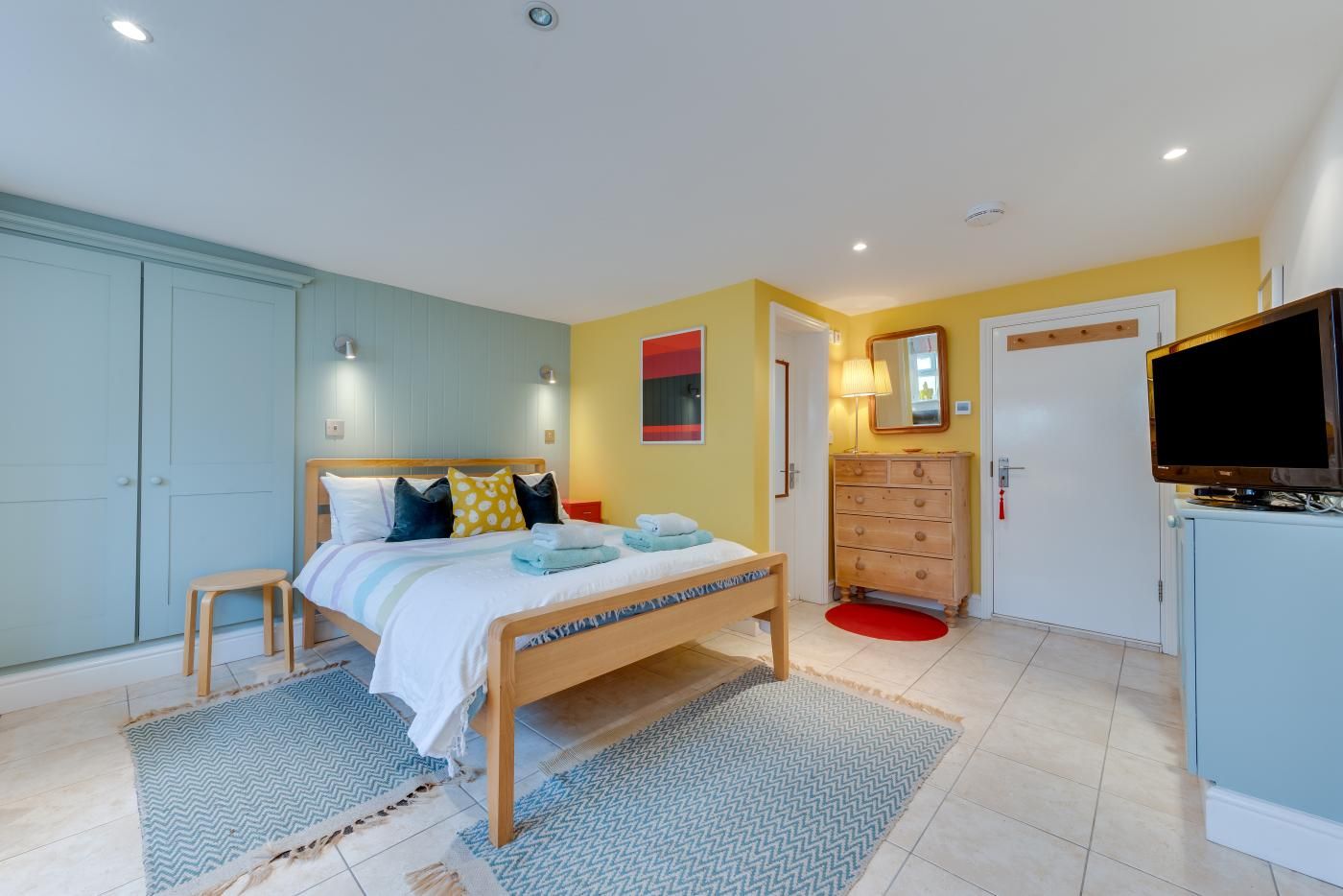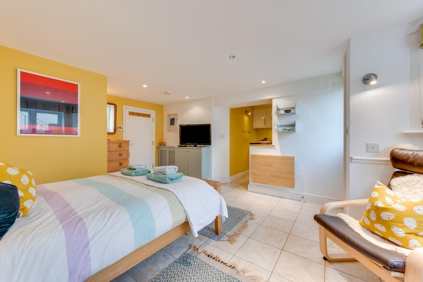 The property itself is a lower ground-floor studio apartment, offering a bright and vibrant open-plan living and sleeping area, thoughtfully decorated to create an inviting atmosphere. The double bed beckons for a restful night's sleep, while the compact yet well-equipped kitchen area provides everything you need for a self-catering holiday, including a breakfast bar.