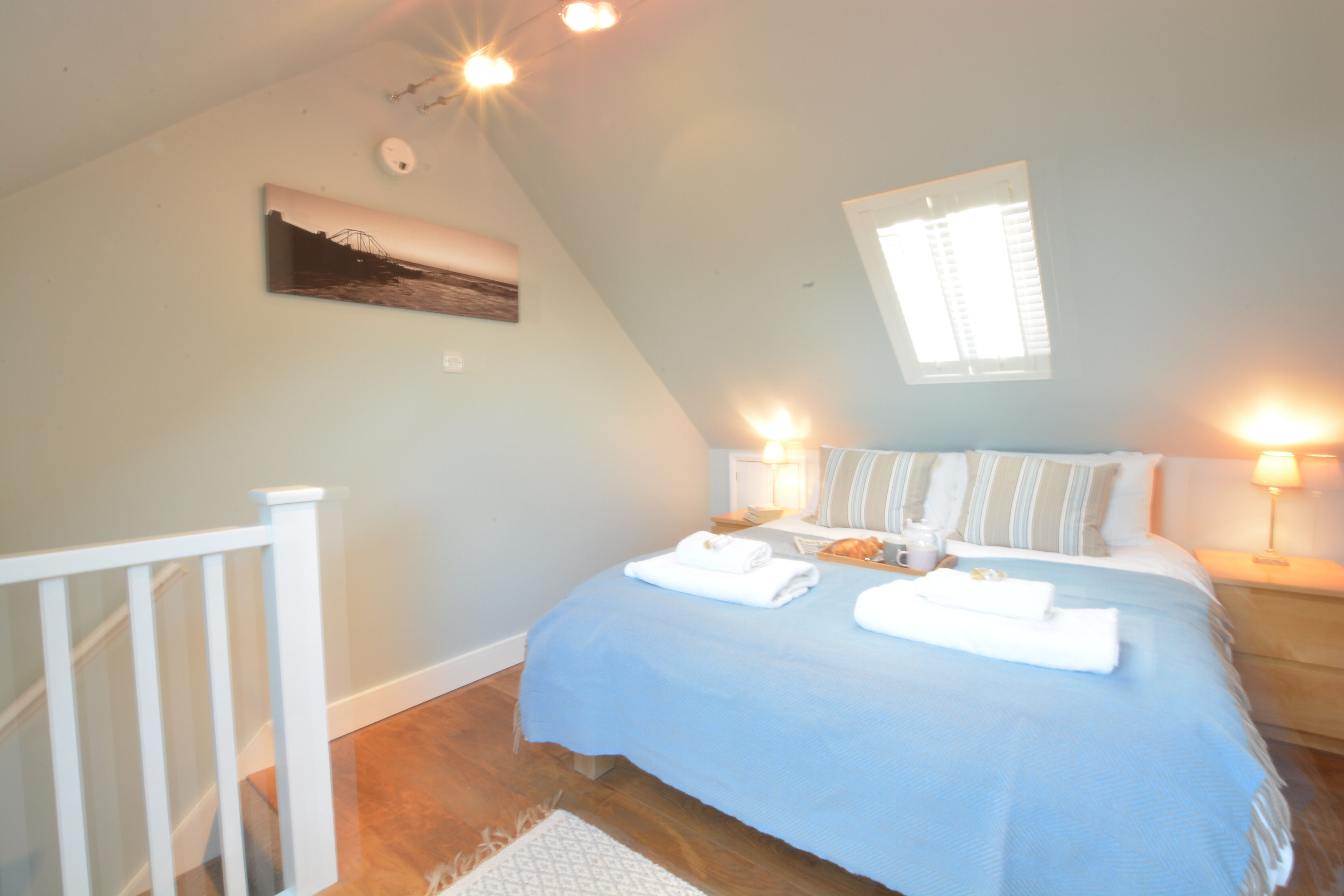 Three bedrooms: 1 x double, 1 x children’s bunk, 1 x second-floor king-size with en-suite walk-in shower, basin and WC. Lower-ground-floor kitchen. Open-plan living space with dining area and sitting area with woodburning stove