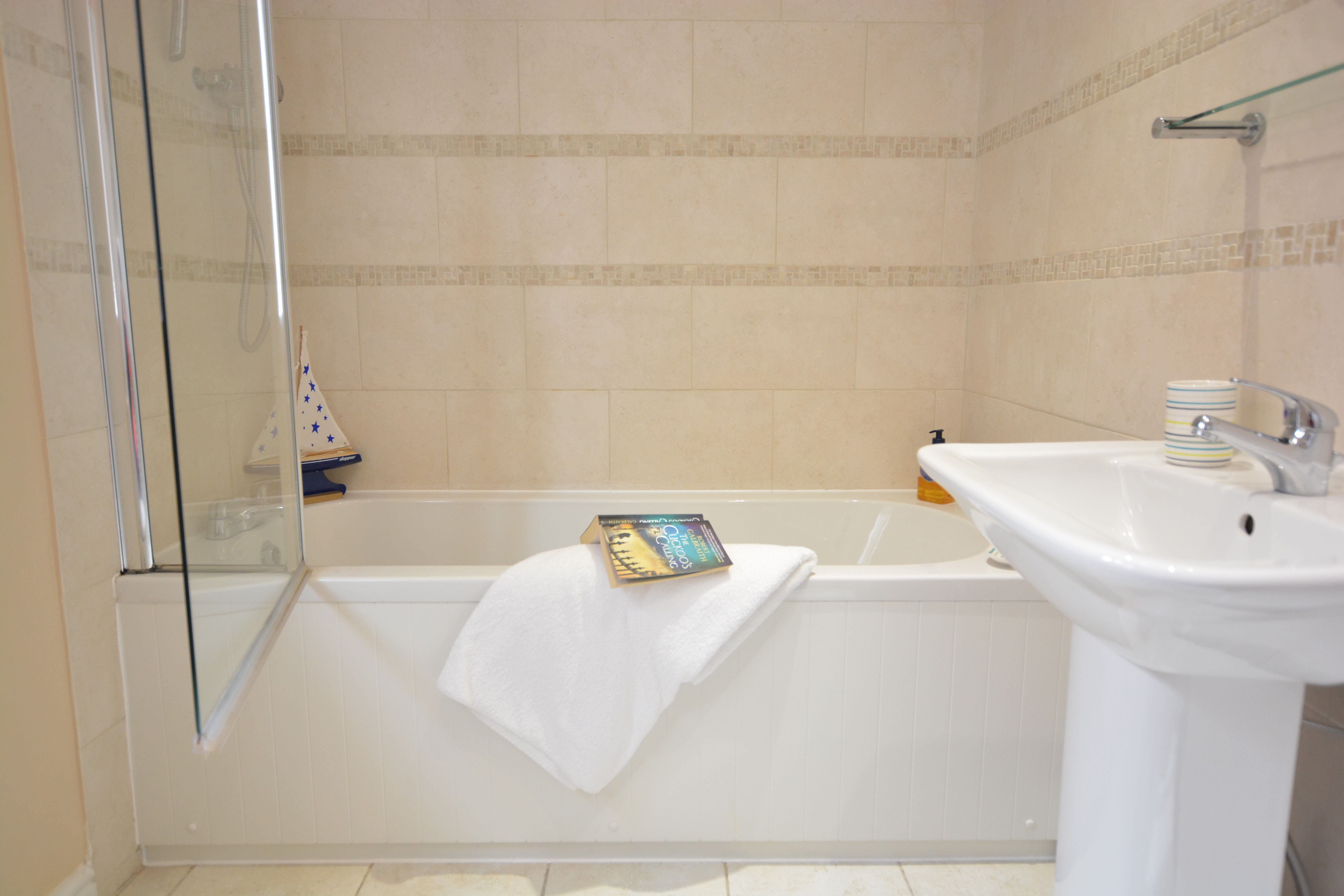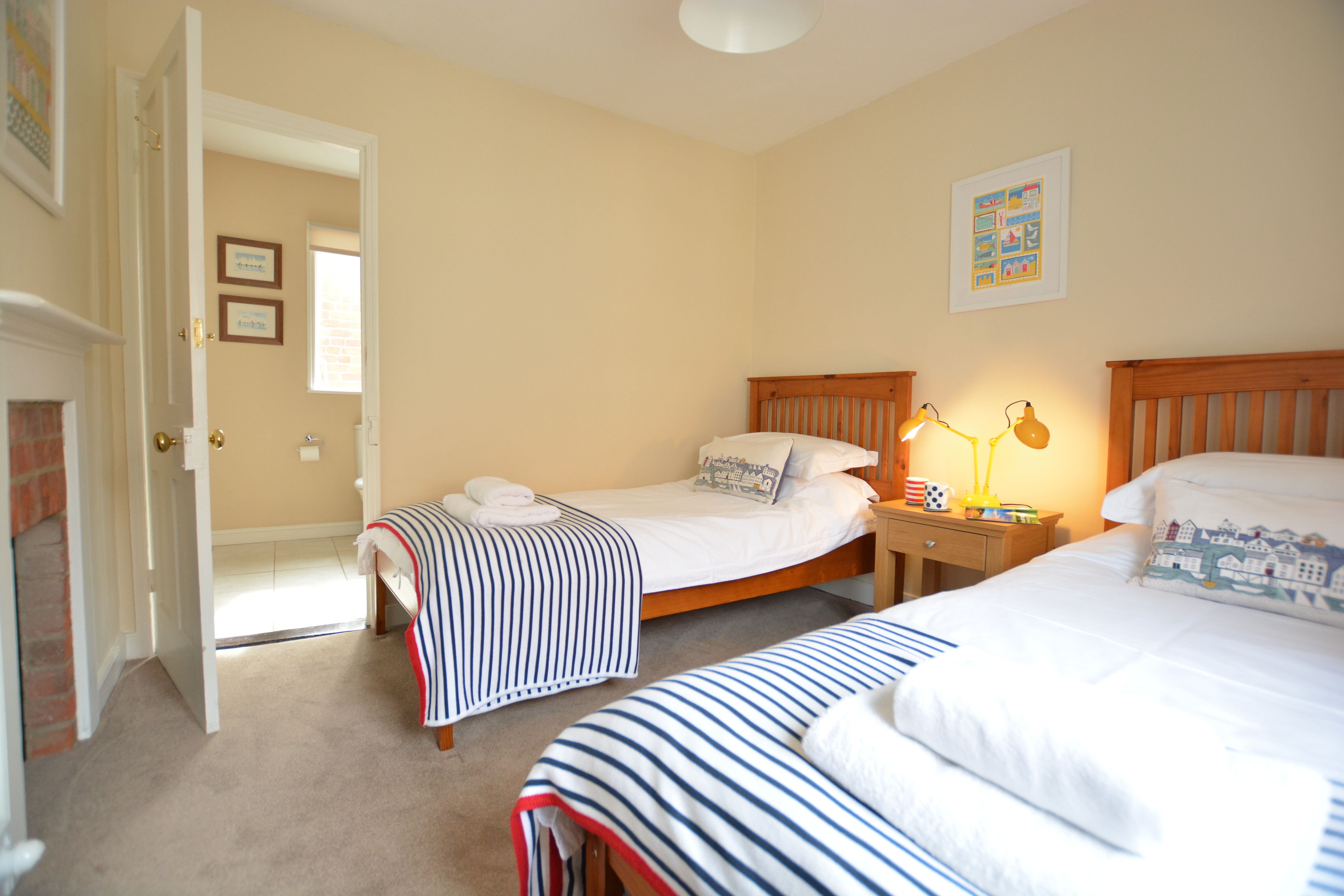 Two bedrooms: 1 x king-size, 1 x twin. Bathroom with bath, shower over, basin, heated towel rail and WC. Kitchen/diner. Sitting room with woodburning stove
