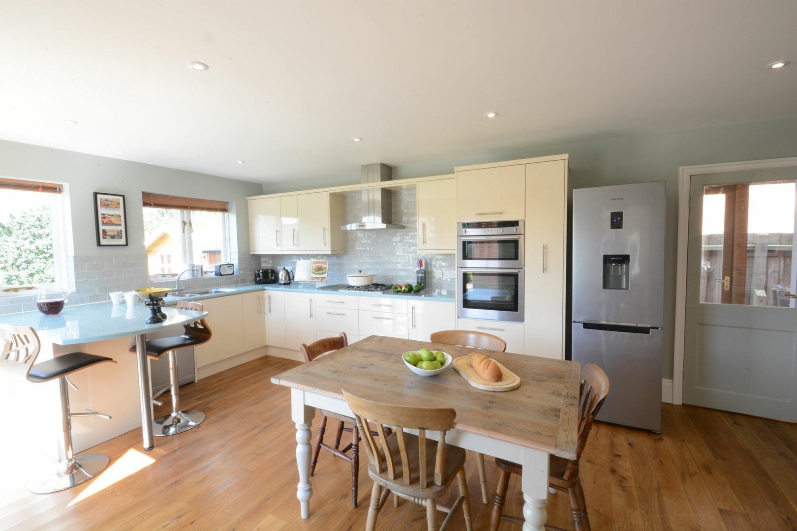 Five bedrooms: 1 x ground-floor double, 1 x super-king-size with en-suite with roll-top bath, walk-in shower, basin, heated towel rail and WC, 1 x super-king-size (zip/link, can be twin on request) with en-suite with walk-in shower, basin, heated towel rail and WC, 1 x king-size with en-suite with walk-in shower, basin, heated towel rail and WC, 1 x twin (zip/link, can be super-king-size on request). Bathroom with bath, shower over, basin and WC. Ground-floor bathroom with walk-in shower, basin and WC. Open-plan living space with kitchen, dining area and sitting area with woodburning stove