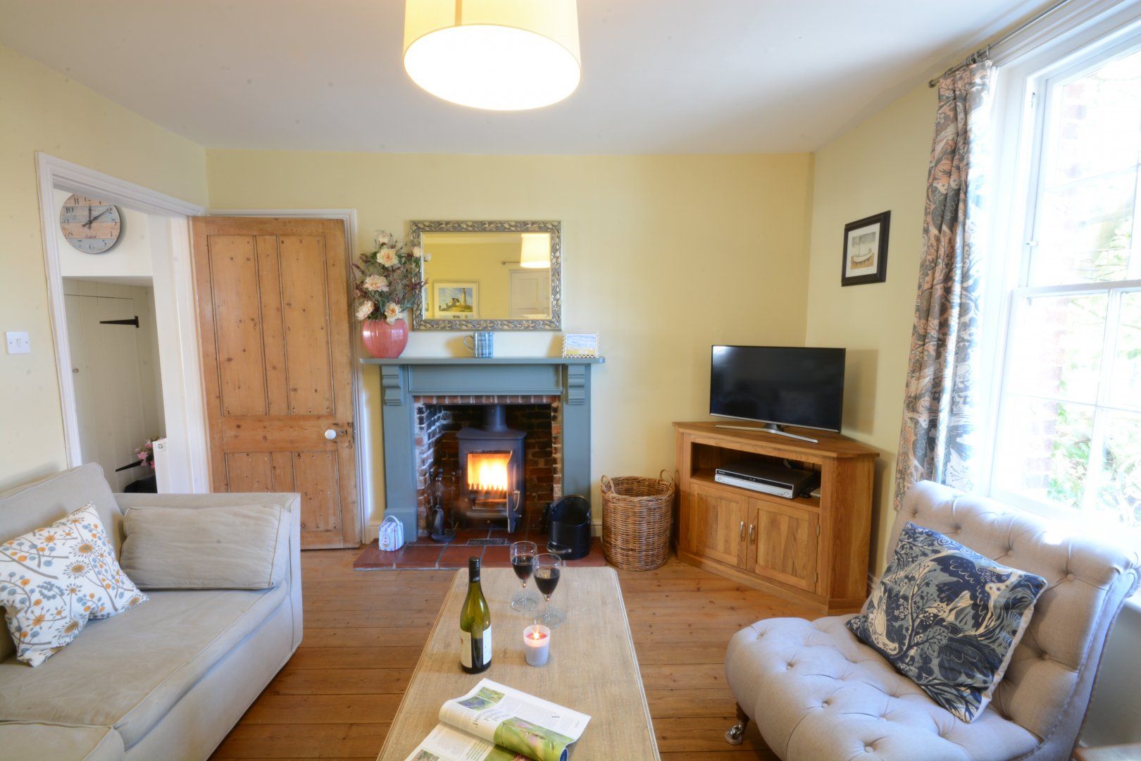 Amenities Gas central heating with woodburning stove. Range cooker with gas oven, grill and hob, microwave, fridge, freezer, washing machine, dishwasher. TV with FreeSat, WiFi. Bed linen and towels inc. in rent. Travel cot available on request. Off-road parking for 1 car. Patio gardens to front and rear, patio furniture, barbecue. One well-behaved dog welcome downstairs. Note: If you wish to bring a dog please inform us at time of booking. Sorry, no smoking. Shop 0.4 miles, pub 0.2 miles. Note: If you wish a travel cot and highchair to be available please request at time of booking. Note: Sorry, no unaccompanied teenagers.