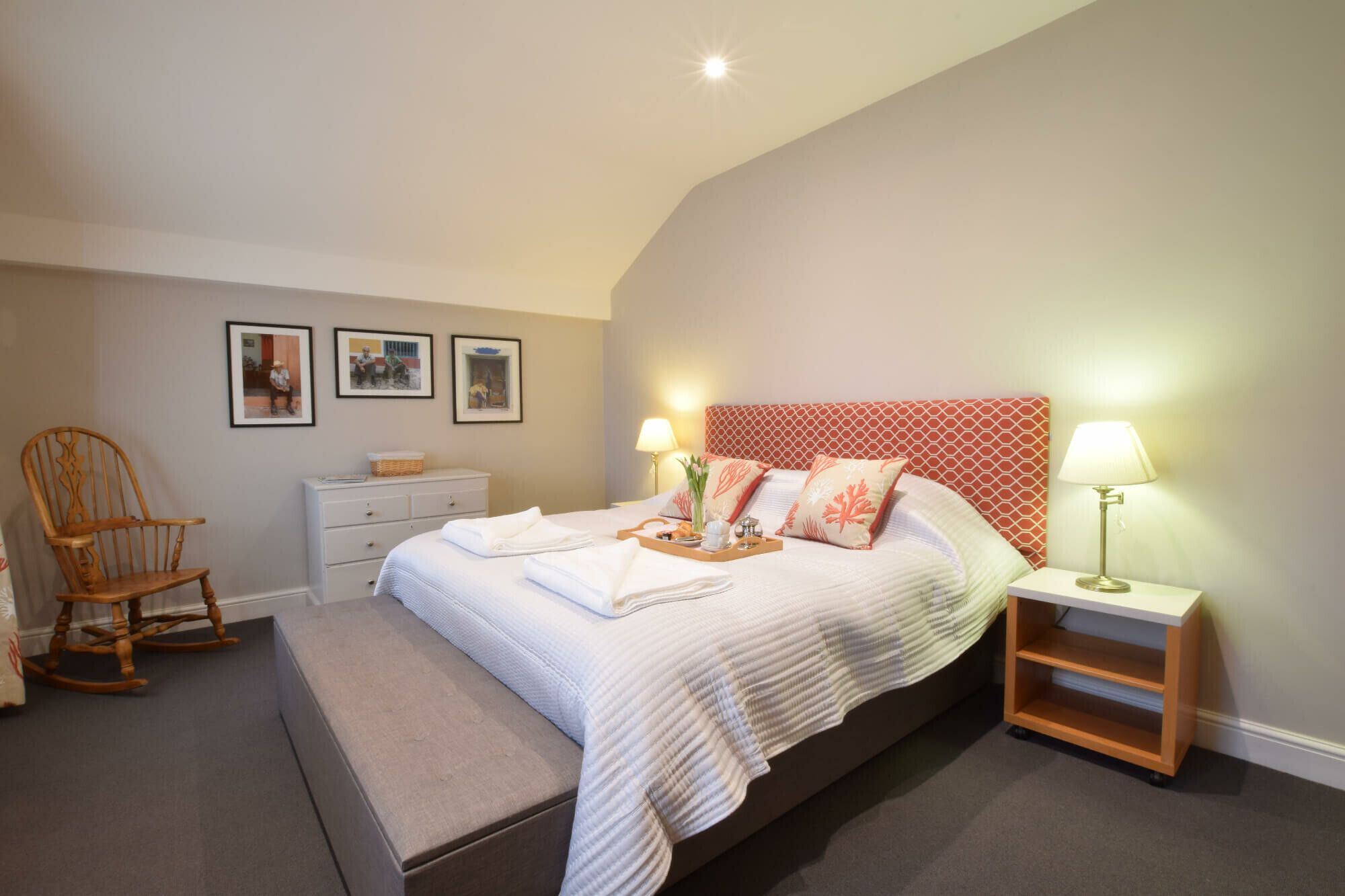 First-floor duplex apartment set over first and second floor. Four second-floor bedrooms: 1 x super-king-size with zip-link(can be set up as a twin on request) with dressing room and en-suite with bath, hand-held shower, walk-in shower, basin, heated towel rail and WC, 2 x super-king-size with zip-link (can be set up as a twin on request) with en-suite with walk-in shower, basin and WC, 1 x king-size with en-suite with walk-in shower, basin and WC. First-floor Kitchen-diner. First-floor sitting room with electric fire stove