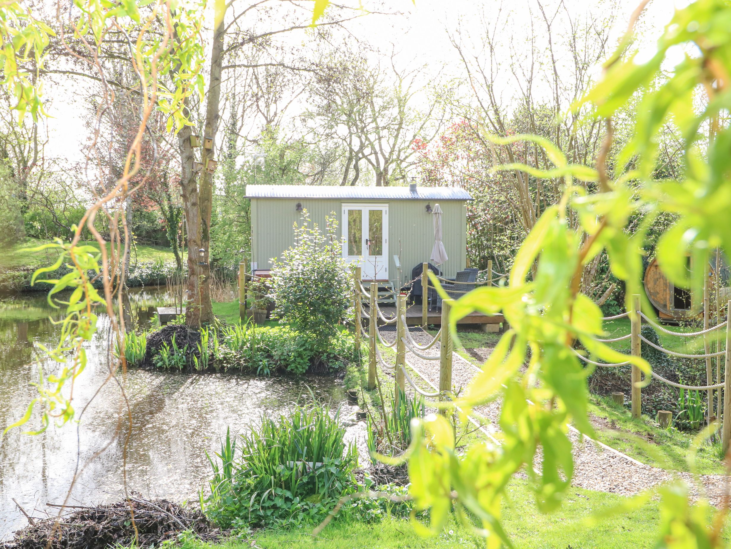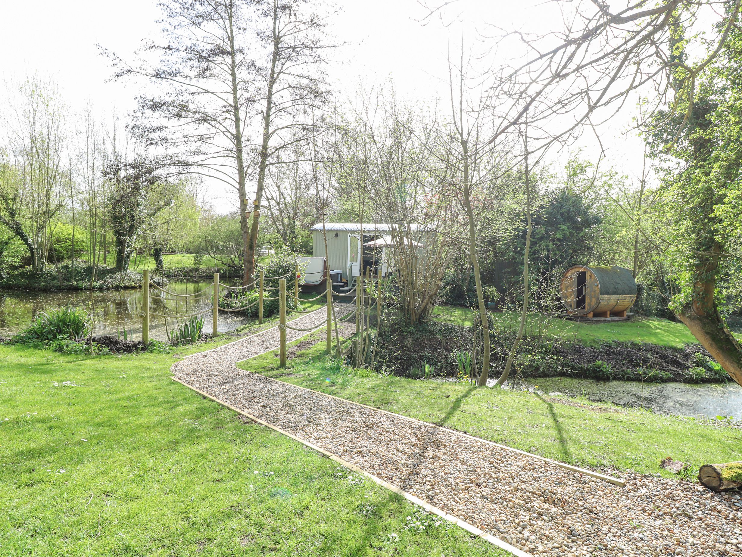 Holiday home Damsel Shepherds Hut has a studio-style layout with a double cabin bed, kitchen equipped with a hob, microwave, fridge with ice box, kettle and toaster, a dining area and sitting area with woodburning stove and TV. There's a shower room with a walk-in shower, basin, heated towel rail and WC. Electric heating, WiFi, fuel, power and starter pack for woodburning stove, bed linen and towels are included in the rent. Outside there's a public car park and a non-enclosed garden with lawned area, patio, hot tub, barbecue, fire pit, furniture and sauna. Sorry, no pets and no smoking. Nearest shop 0.5 and pub in 0.5 miles, lake in 0.1 miles. Damsel Shepherds Hut makes a perfect romantic escape. Note: There are steps up to the property. Note: Check-in is from 4pm, check-out by 10am. The change over days are strictly Monday and Friday.
