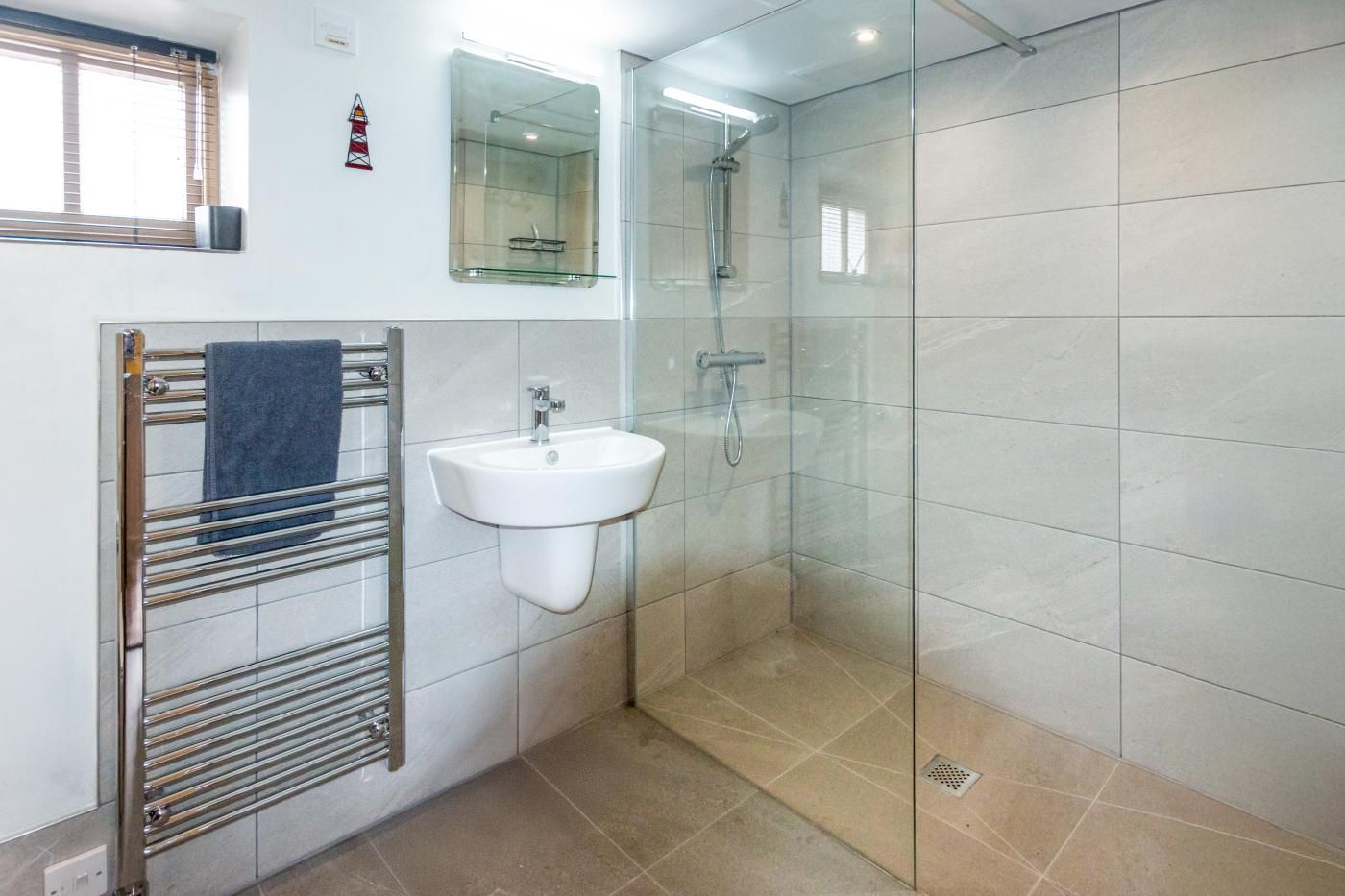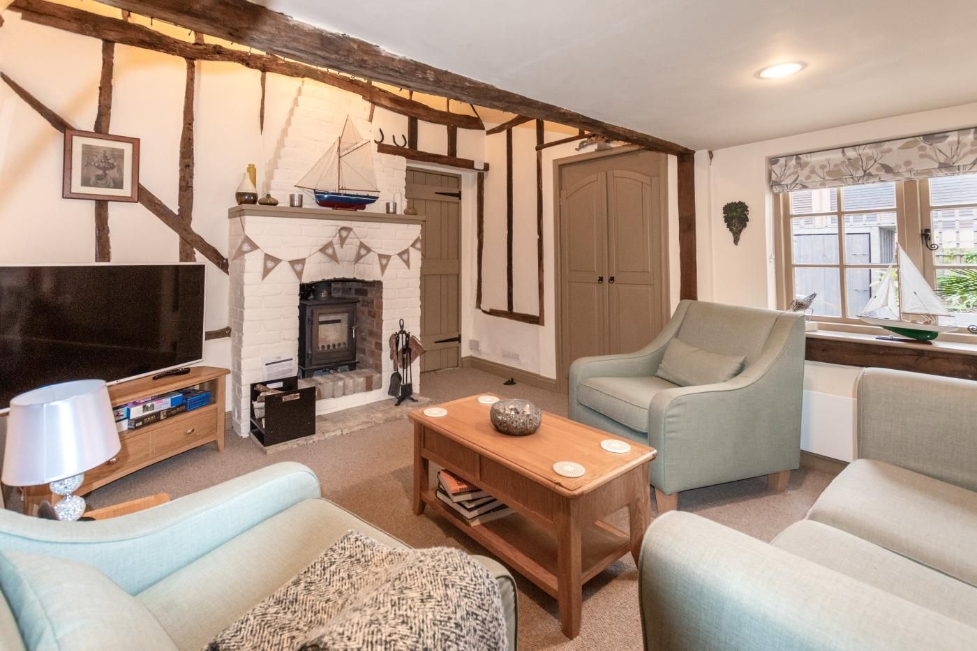 Offering a calming space to relax, the living room is decorated in pastel tones with two armchairs and a sofa and paired with a wood burner for the cooler months of the year.
