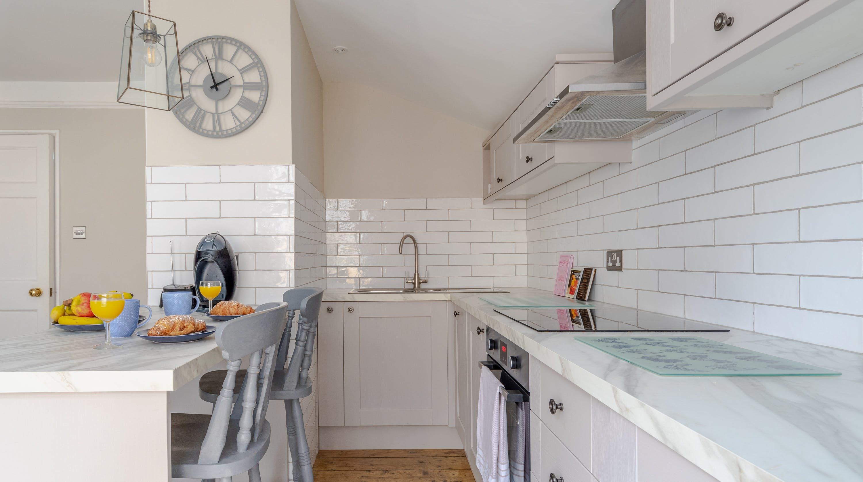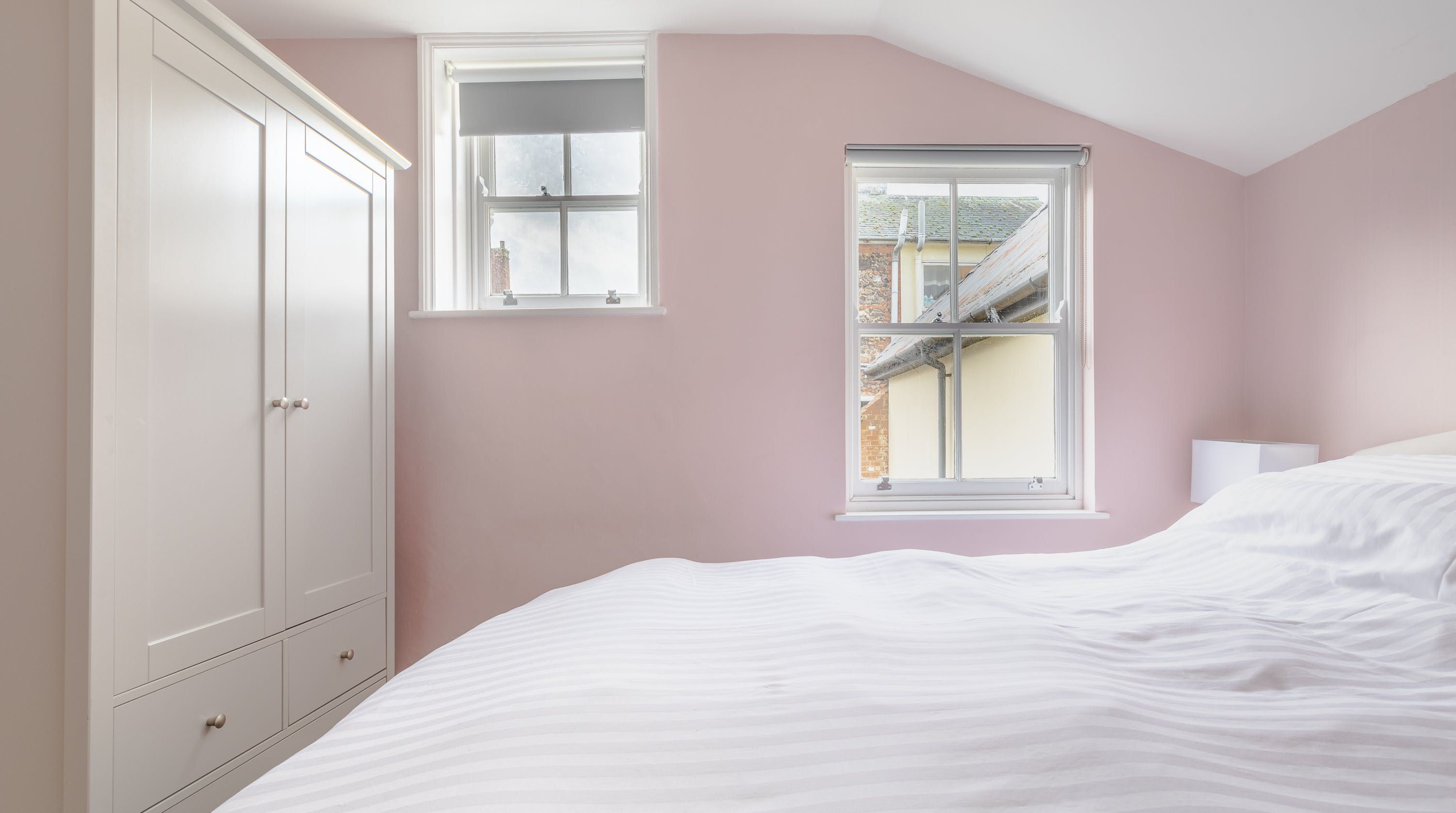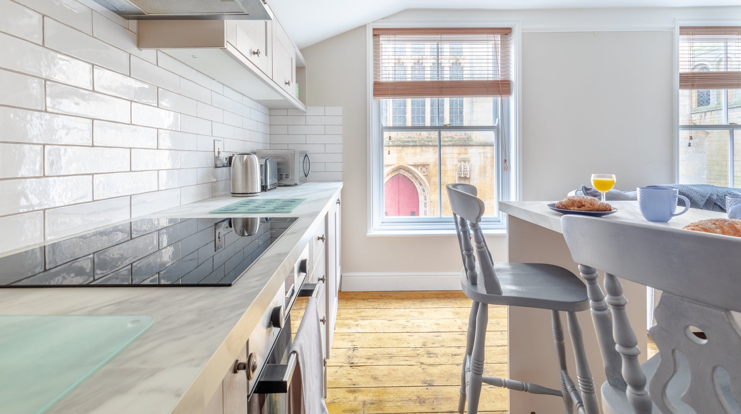 The town of Bury St Edmunds is perhaps most famous for its cathedral and former abbey, and this apartment puts you as close as can be to these landmarks. In fact, the historic Norman Tower and Cathedral Gate can be seen out the window. Inside, the newly refurbished interior living quarters feel suitably smart, from the wooden floorboards and mid-century inspired furnishings to the stark white walls and the sleek surfaces in the kitchen. The bedroom has been painted in a soothing shade of pastel pink and there's even a bathtub for enjoying long soaks after a day of taking in all that this quaint town has to offer. As well as the ecclesiastical attractions just across the street, Moyse's Hall Museum can be reached in six minutes' walk, while the Italiante Ickworth House is only eighteen minutes away in the car.