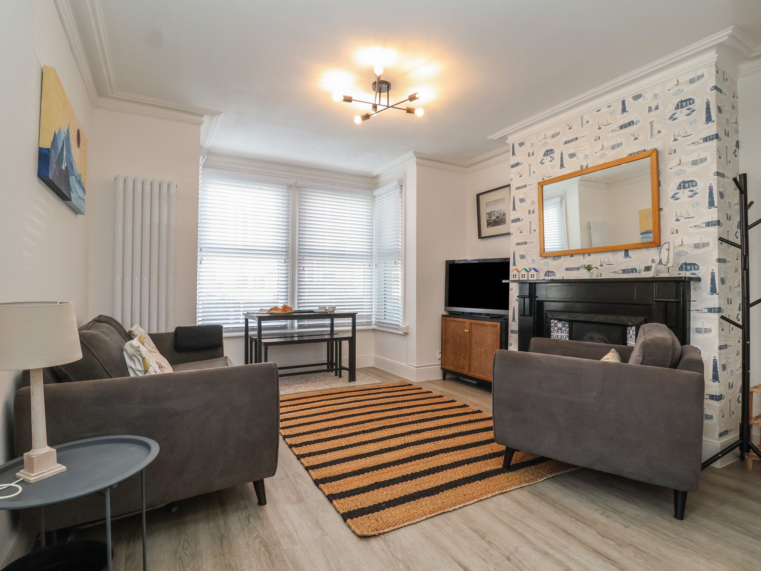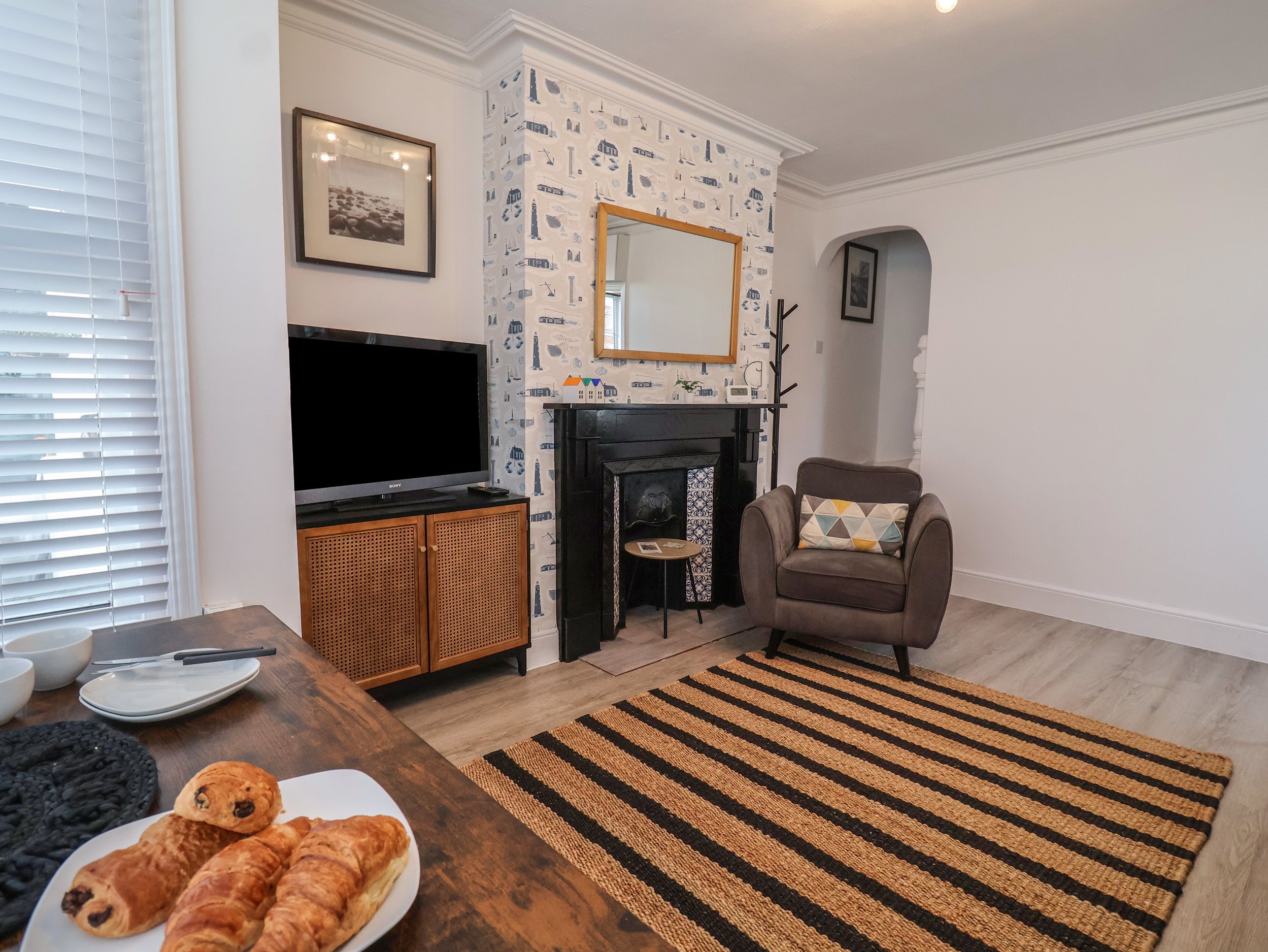 A perfect spot to retreat too after a busy day, with a two-seater sofa and arm chair positioned to make the most of the feature fire place and TV with Roku.