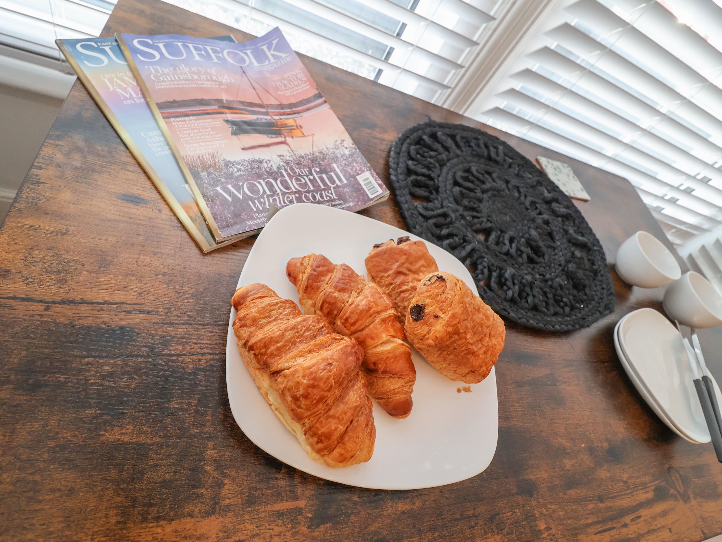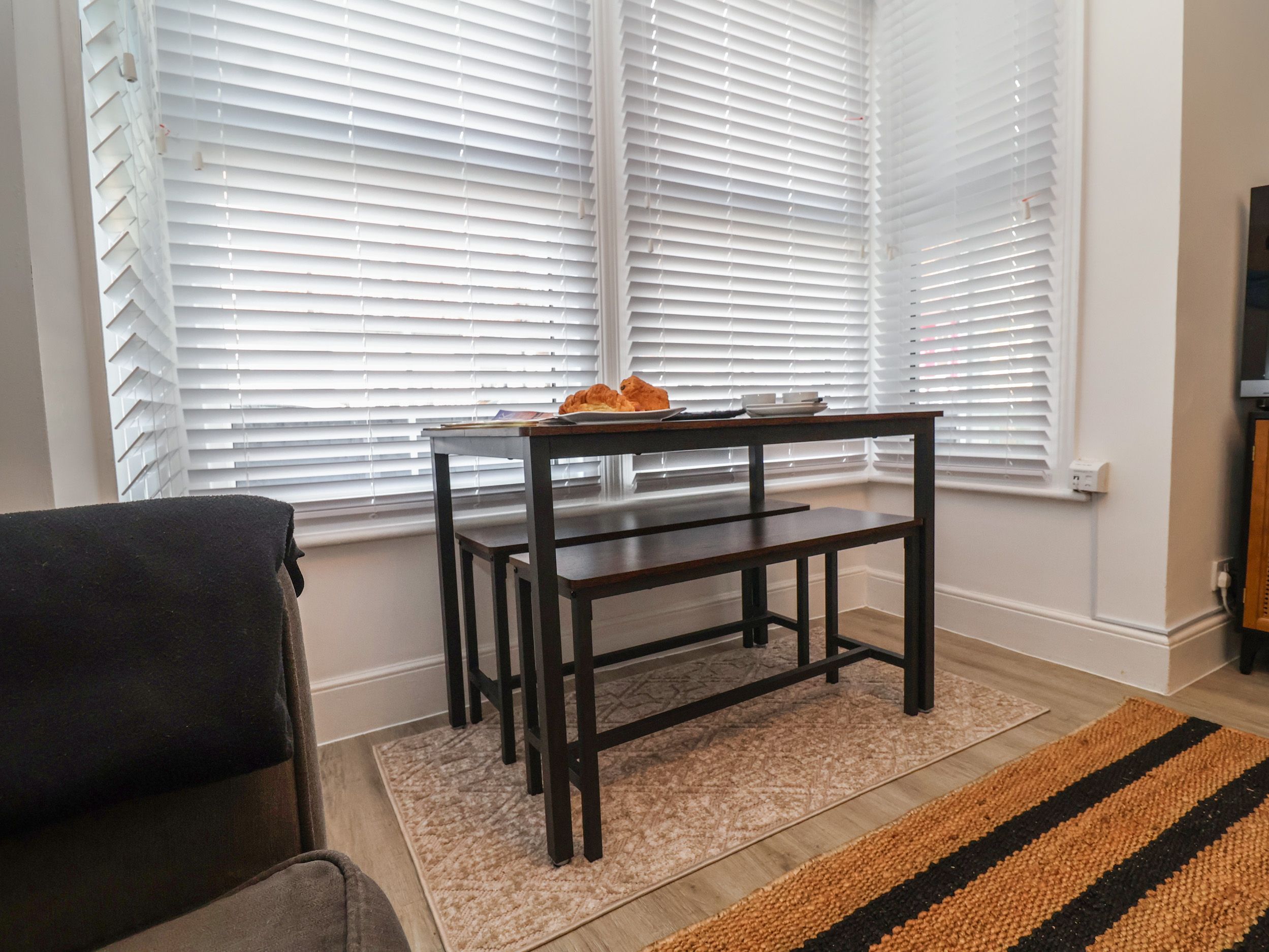 There is a dining table with two bench seats positioned in the bay window.