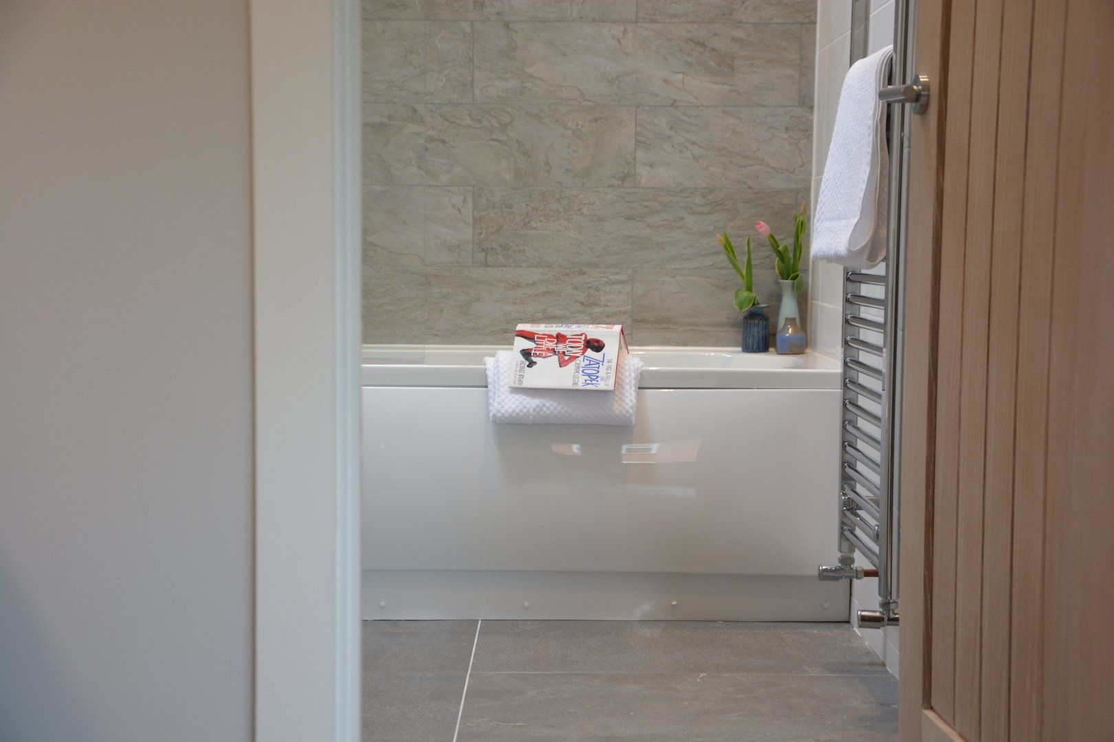 Light modern bathroom with Velux window allowing natural light. There’s a bath with rain shower over with hand shower, washbasin, WC and heated towel rail.