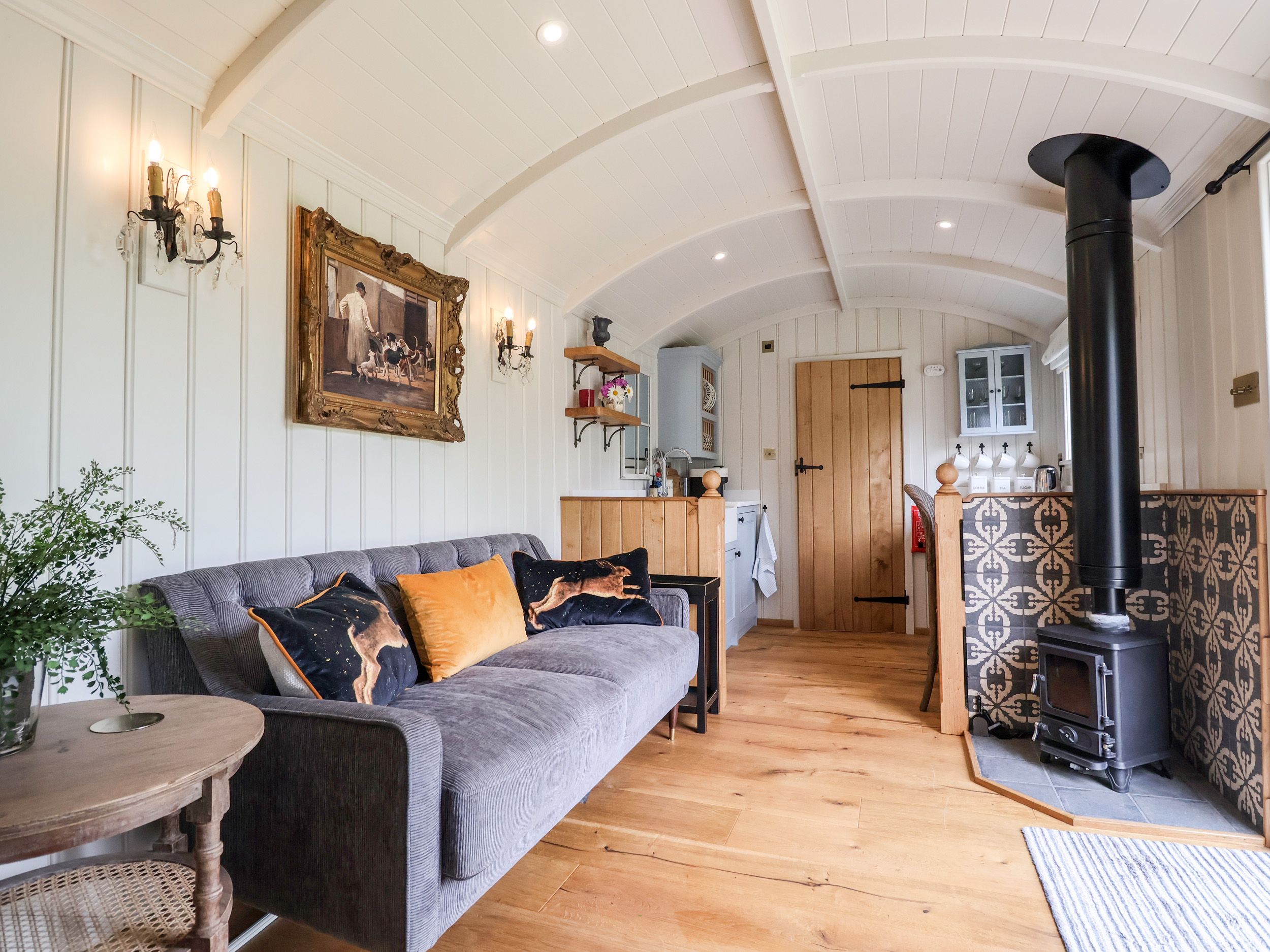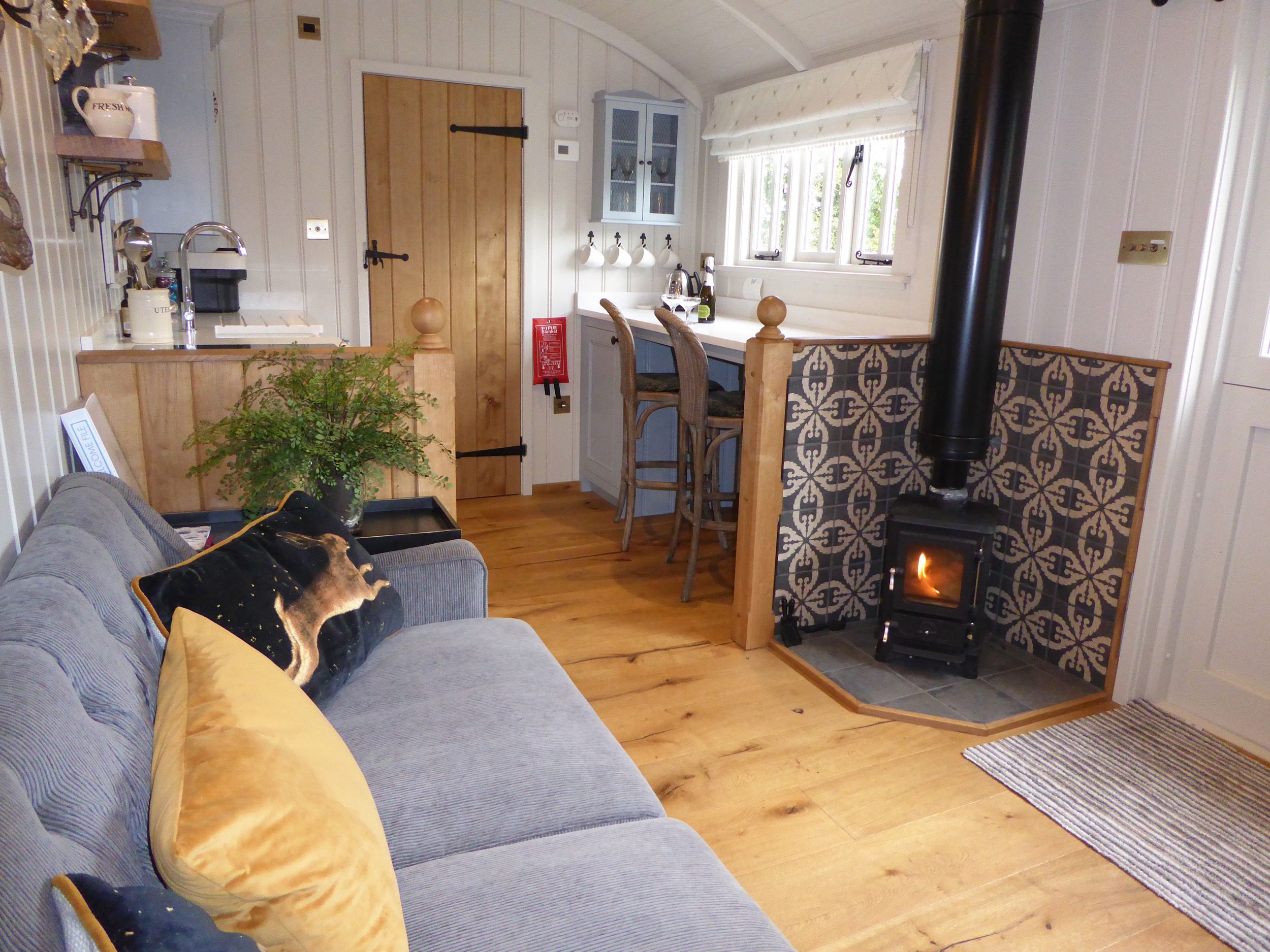 Wooden steps lead up into the spacious shepherds hut accommodating two guests, with living/dining/bedroom area, and a separate shower room. No expense has been spared with this luxurious holiday home, with beautiful oak flooring throughout, Quartz kitchen worktops, antique furnishings and Emma Bridgewater tablewear.