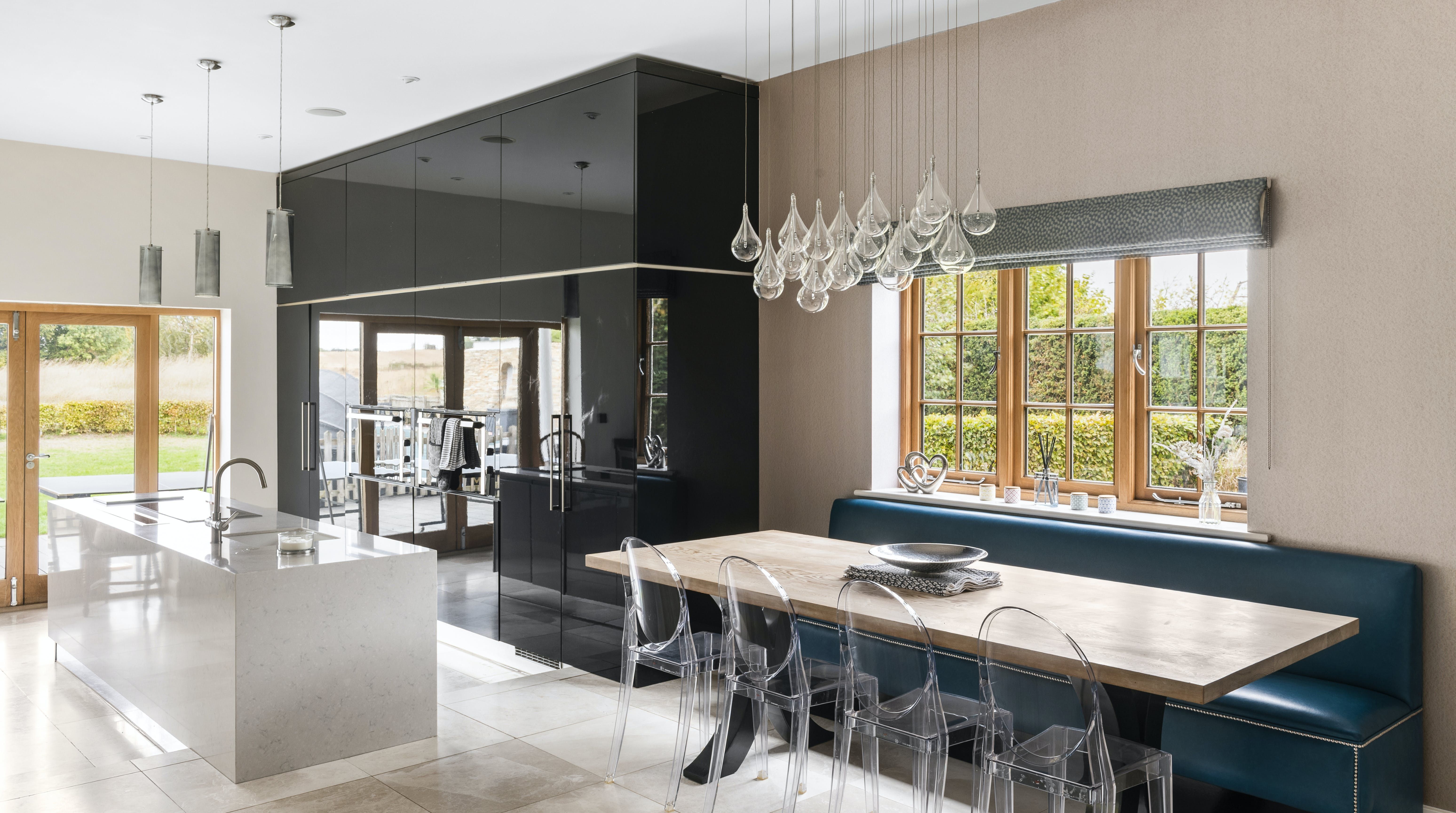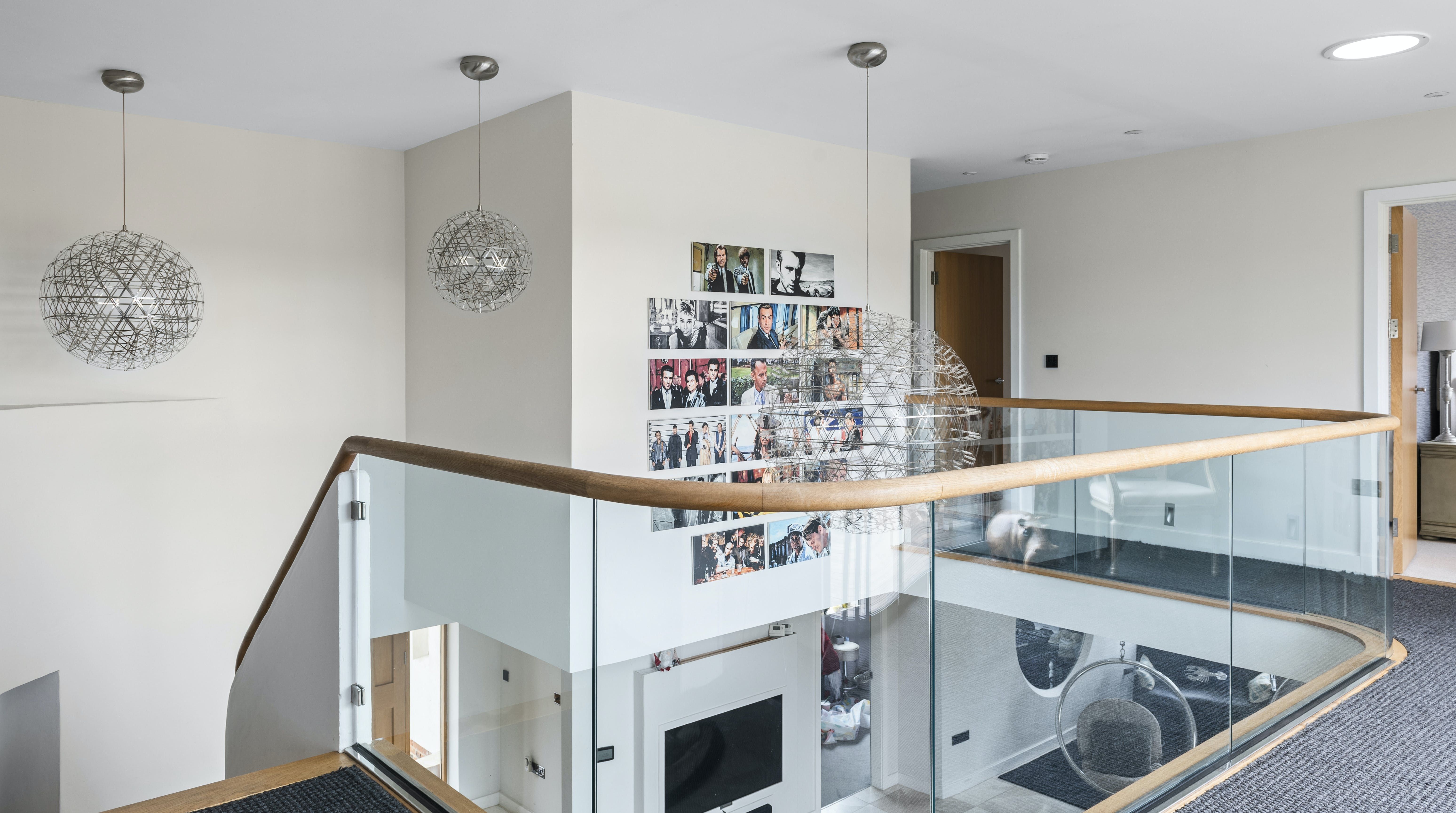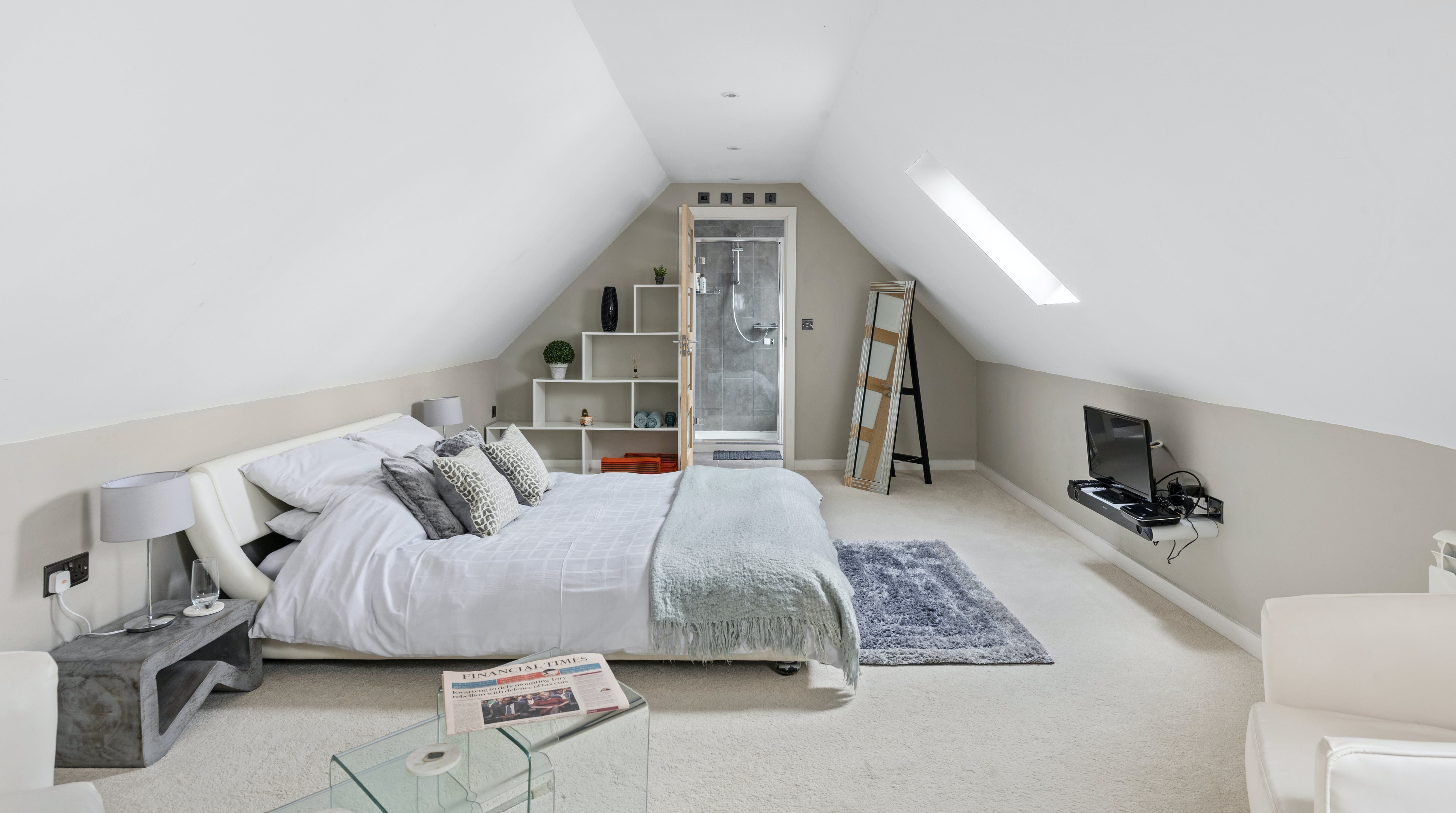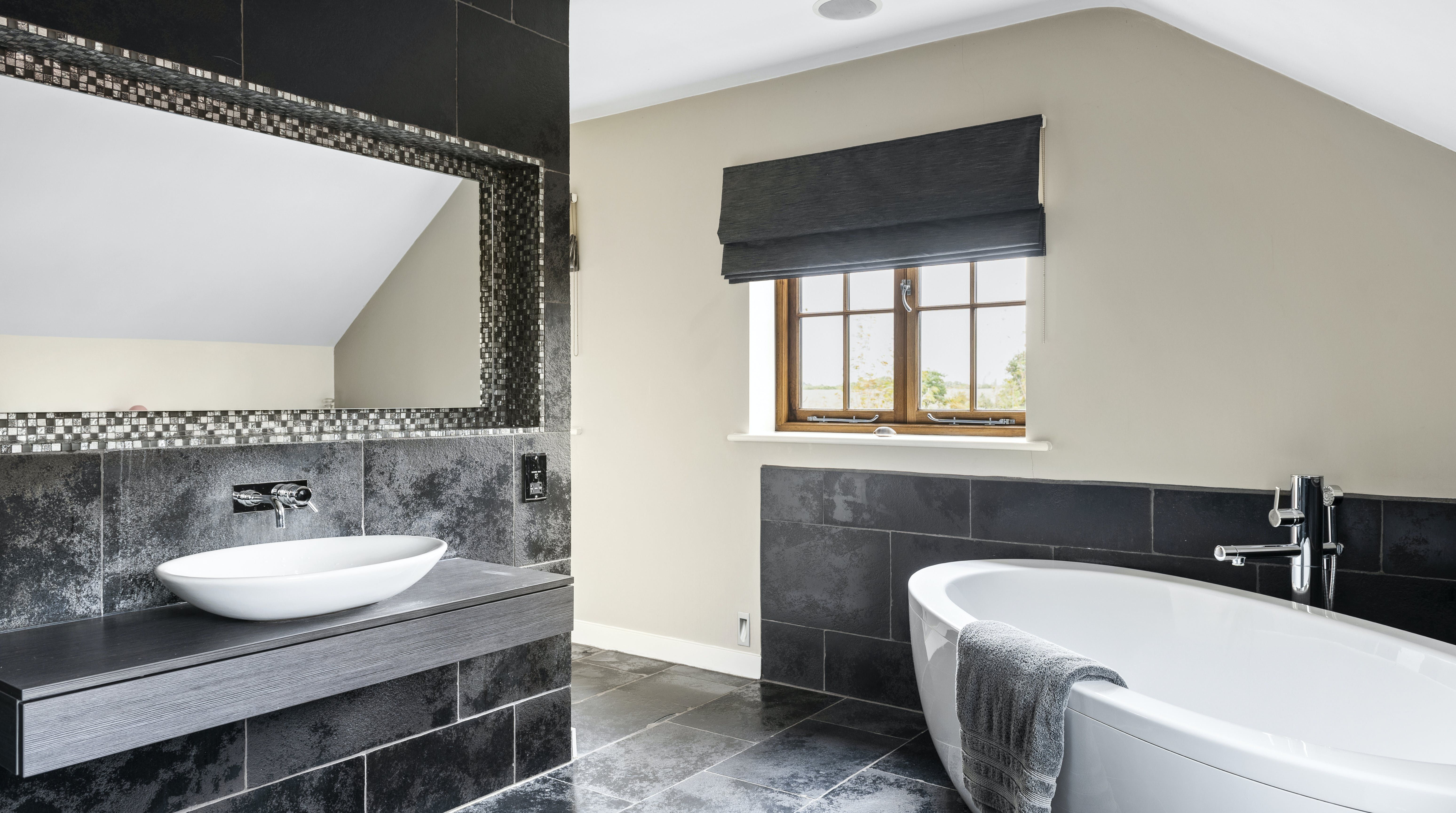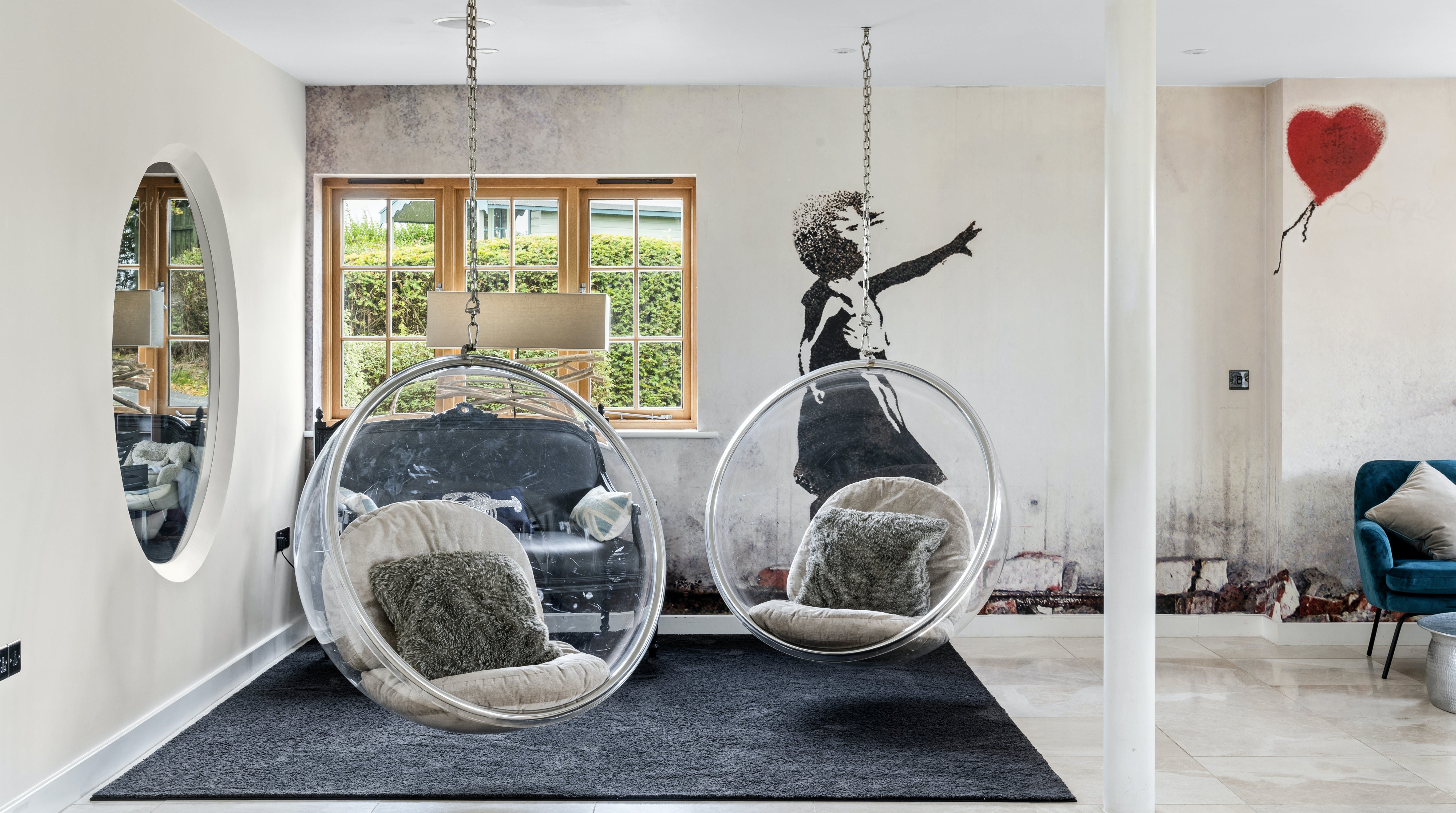 The interior is more in keeping with the home's modern rear, with strikingly contemporary design fully embraced. In the double-height living room, several features vie for your attention, from the circular sofa pit and hanging egg chairs to the Banksy-inspired wall art and rustic wood burner. The deliciously sleek kitchen and neighbouring dining table overlooked by chic hanging lighting both belong in the pages of a glossy magazine, as do the spa-standard bathrooms.