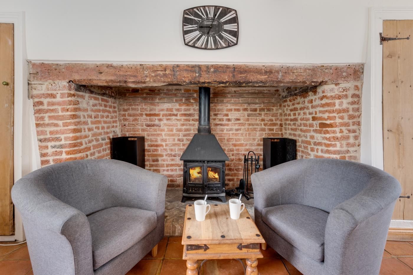 The heart of this holiday home is the wide-open kitchen/diner with a fantastic, exposed, brick fireplace filling one wall.