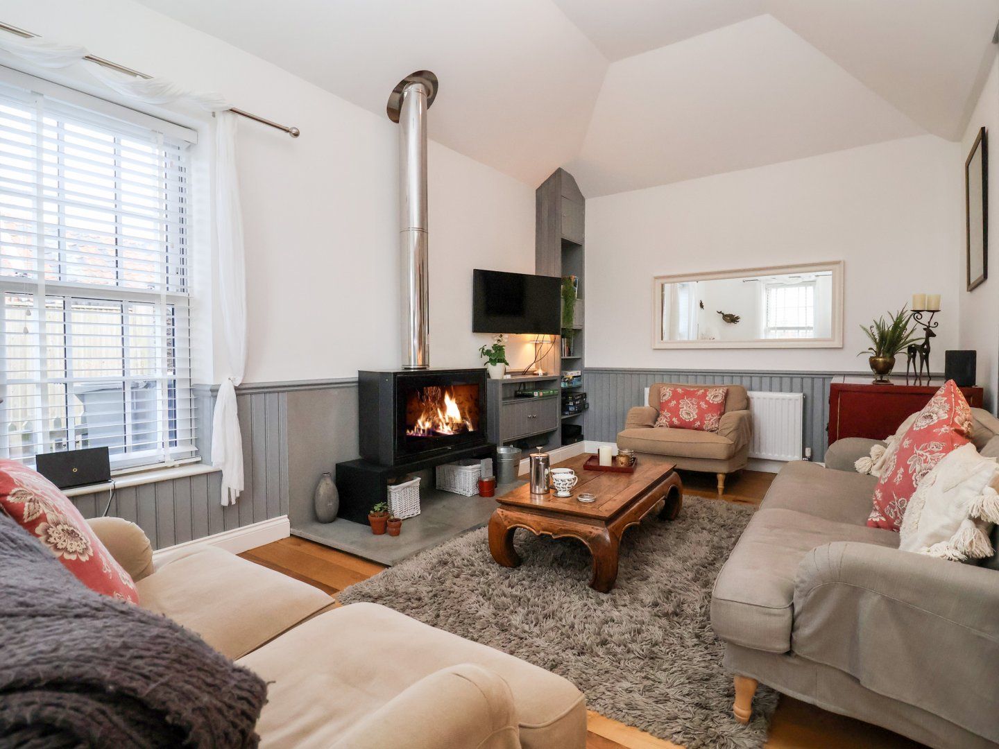 Large sofas surround the massive modern wood burner in the sitting area, with a long coffee table waiting for your drinks or snacks. There's a wall-mounted TV and bluetooth speaker for your entertainment, and shelves are stacked with games, and books.