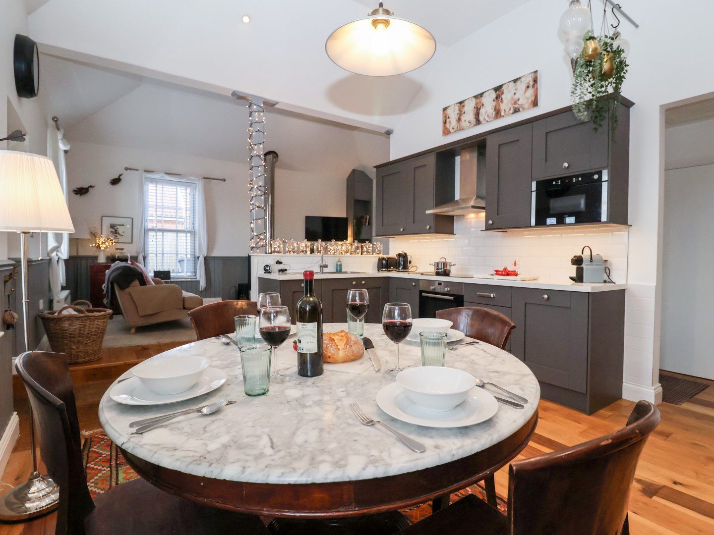 Holiday home This beautifully converted Methodist chapel sits directly on Knodishall Common. You are welcomed directly into the reception room in this modern detached self-catering cottage, with the bedrooms and family bathrooms following on to the right. Interiors are decorated in a classy palette of white and greys with comfort and practicality throughout. The well-equipped kitchen sits next to the dining area, followed by the raised living space with generous sofas, coffee table and a beautiful big wood burner. Zip and link beds give you the choice of a king or twin in the guest bedroom, with a designer king size bed in the master that has an en suite shower room. A luxury family bathroom and utility cupboard sit at the back of the property.