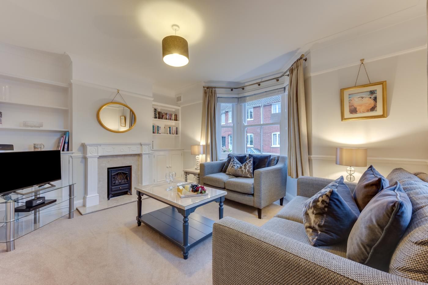 The living room welcomes you with its homely ambience, furnished with comfortable sofas alongside large bay windows that bathe the space in natural light.