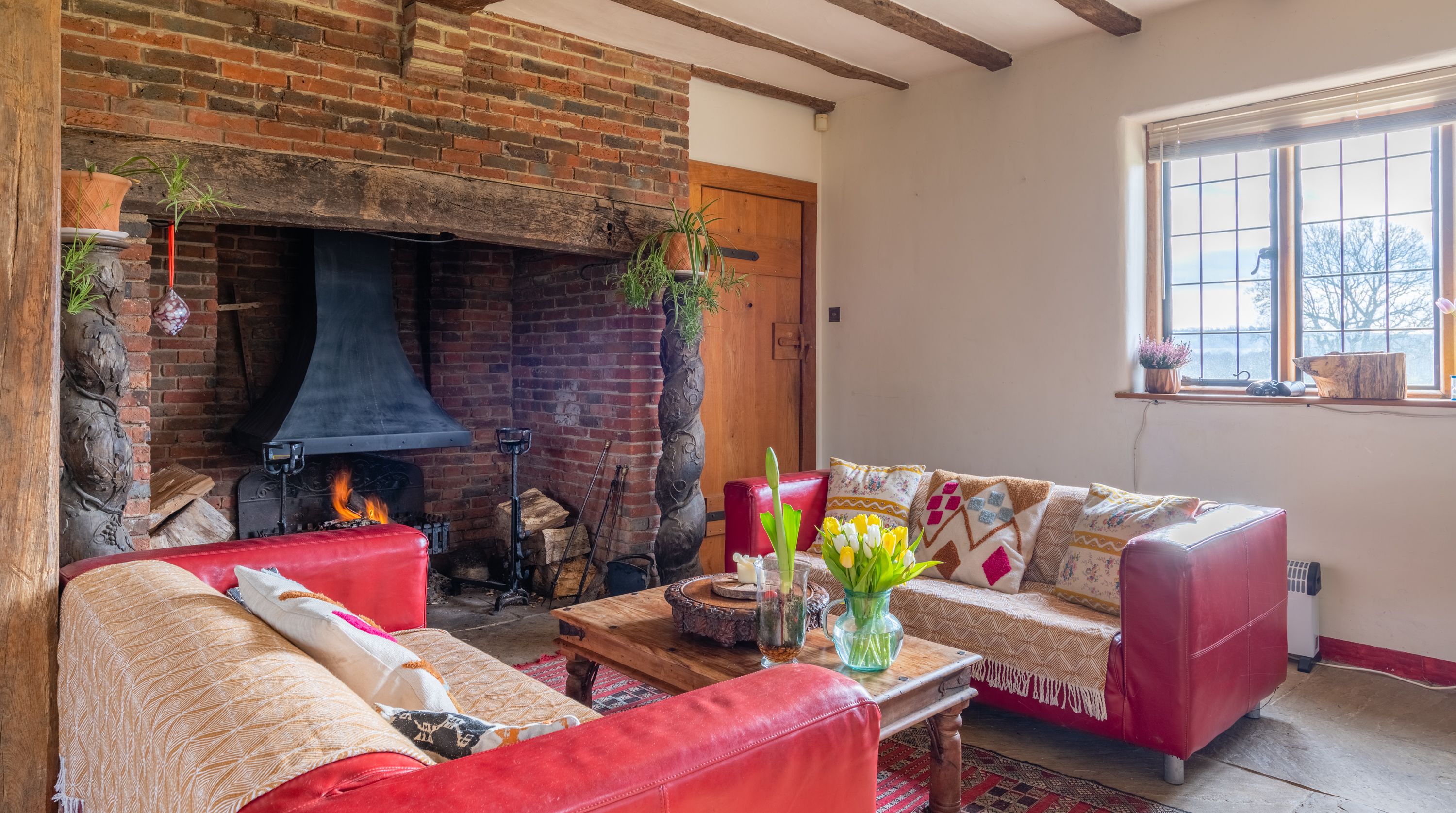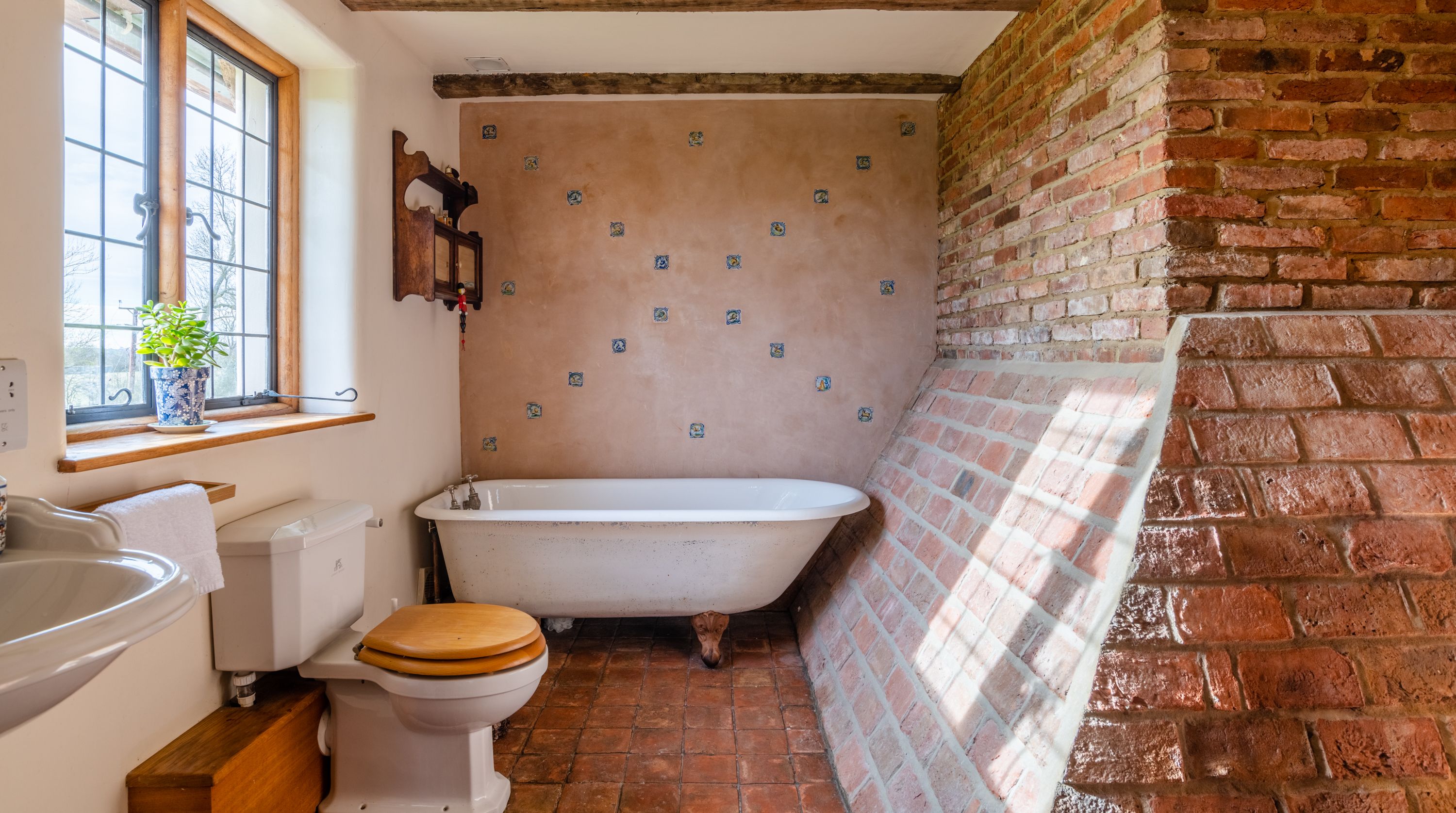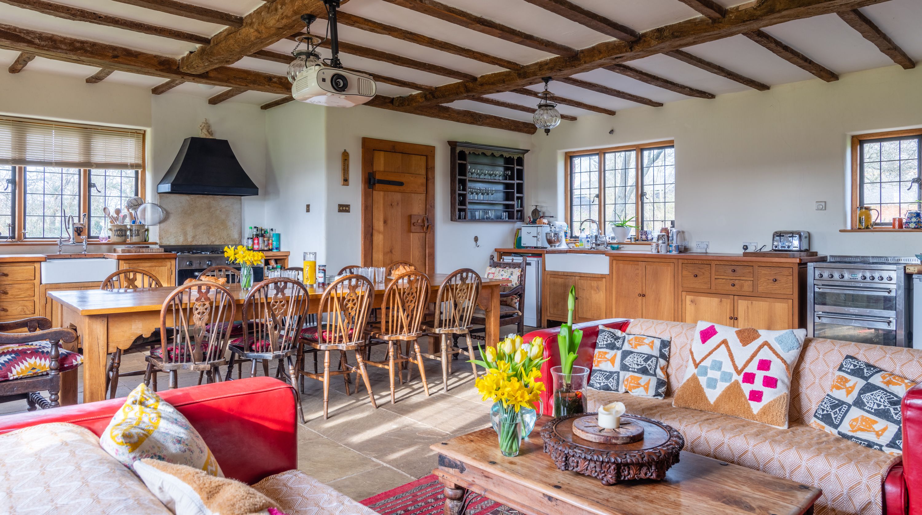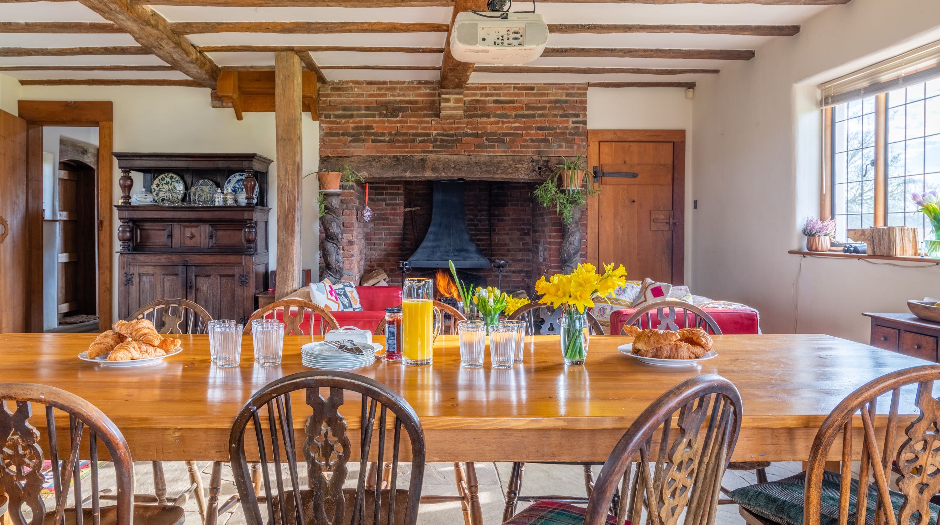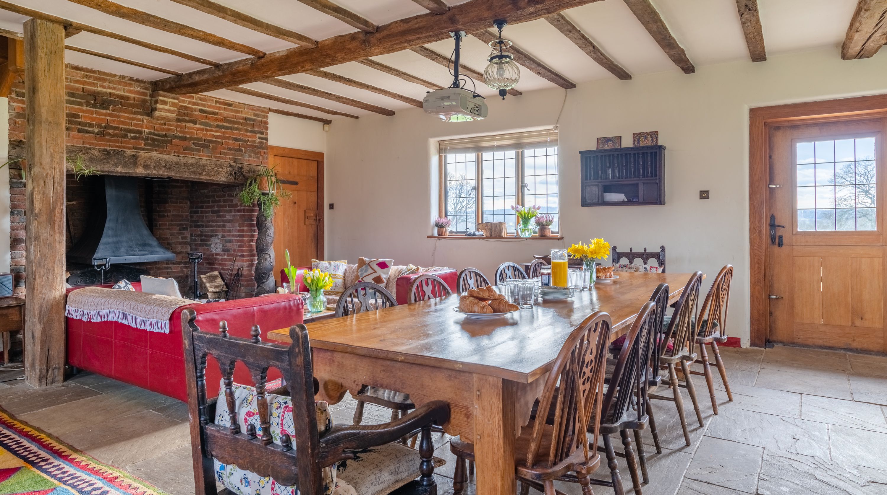 The interior feels particularly rustic too, from the wooden ceiling beams and the plethora of exposed brickwork to the inglenook fireplace. That being said, there are all the modern comforts you could want here. Above the fireplace, a projection screen comes down for movie nights, while there are also tubs in all the bathrooms so you can start the day off at a super-slow pace.