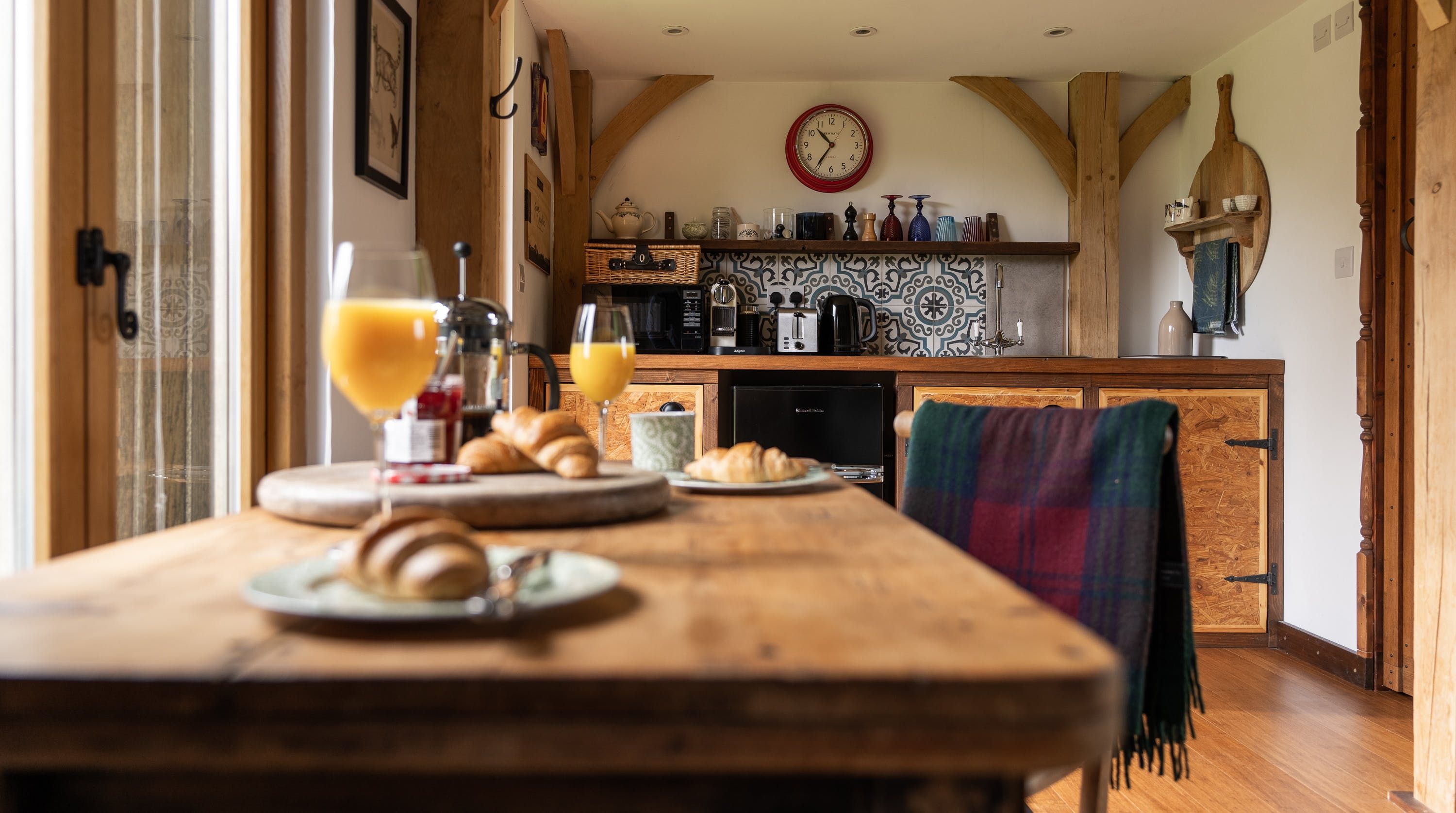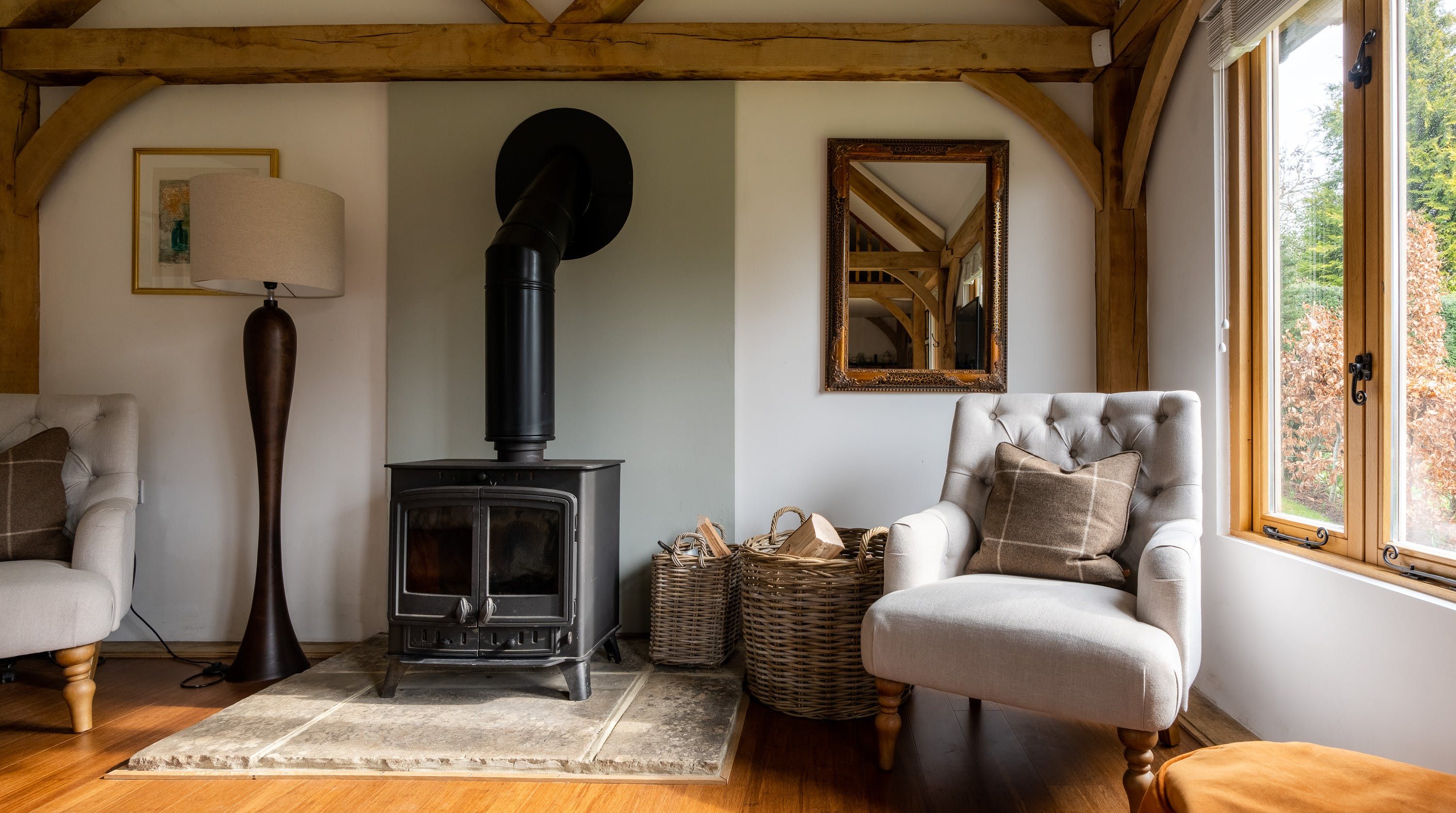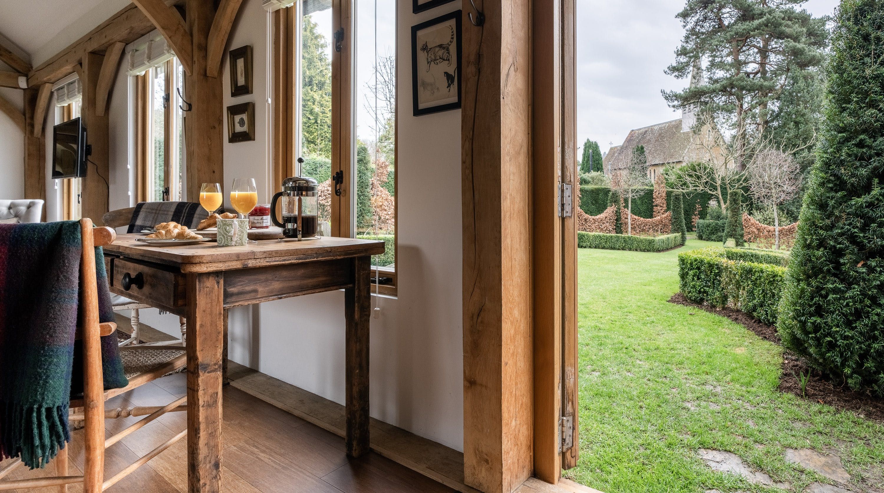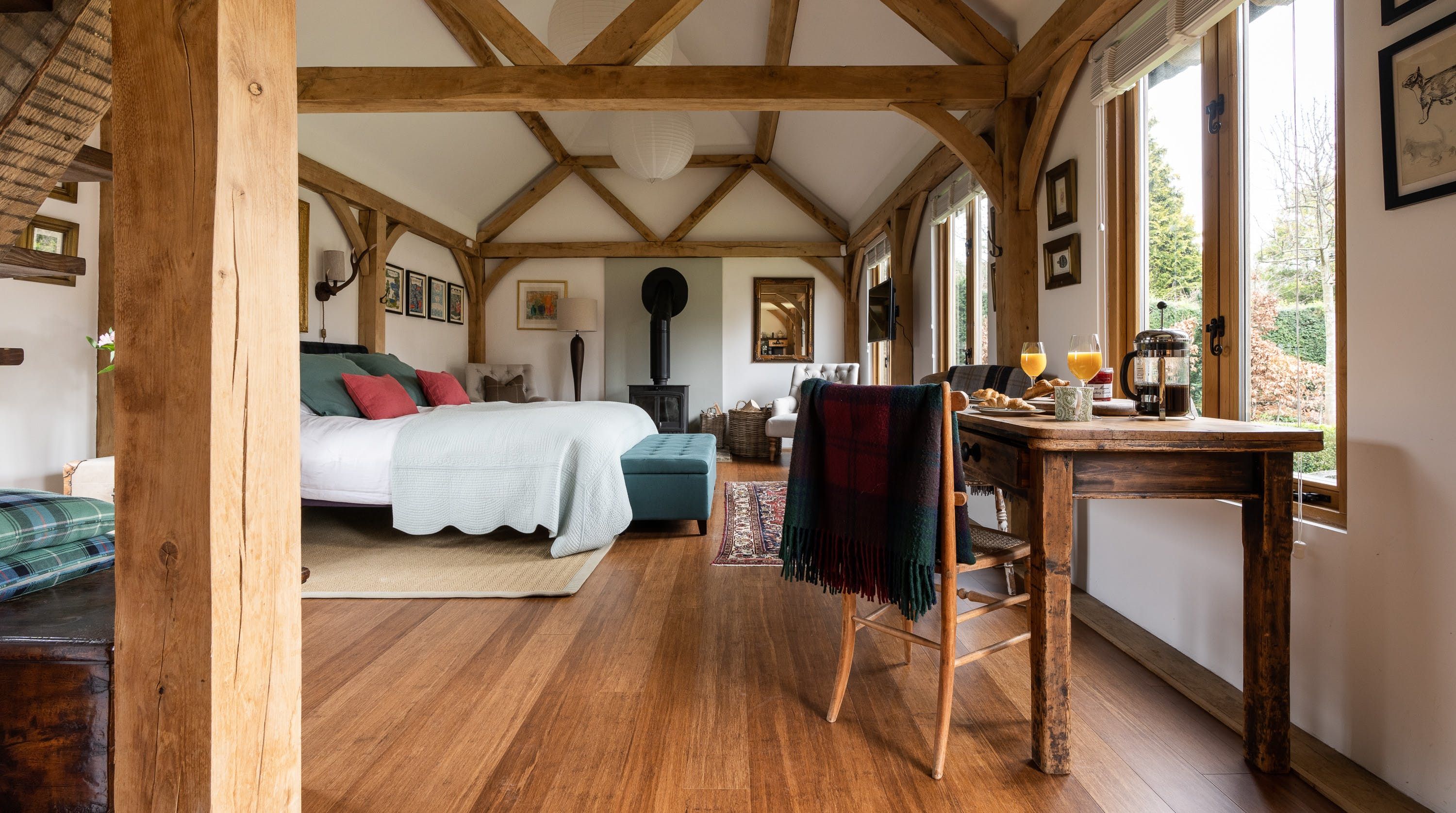 Inside, vaulted beamed ceilings and country chic decor create a warm and cosy welcome. Make yourself at home on one of the armchairs by the wood-burning fire and enjoy a glass of wine and some quiet reading in the warmth of its glow. The king-size bed beckons a blissful night’s sleep in its sumptuous sheets and wonderful wake-ups to views of the grounds before tucking into the fresh breakfast delivered to your door each morning.