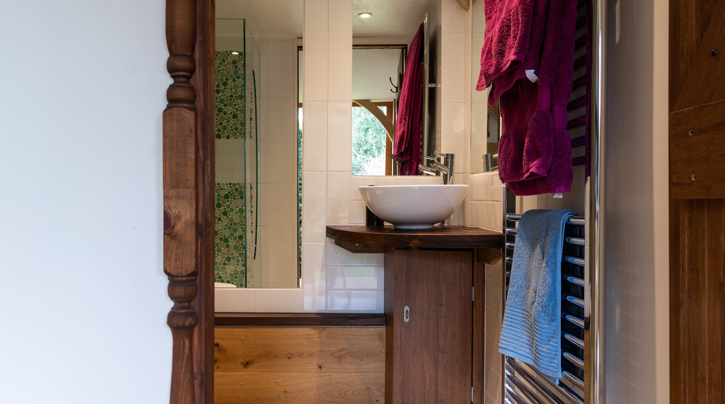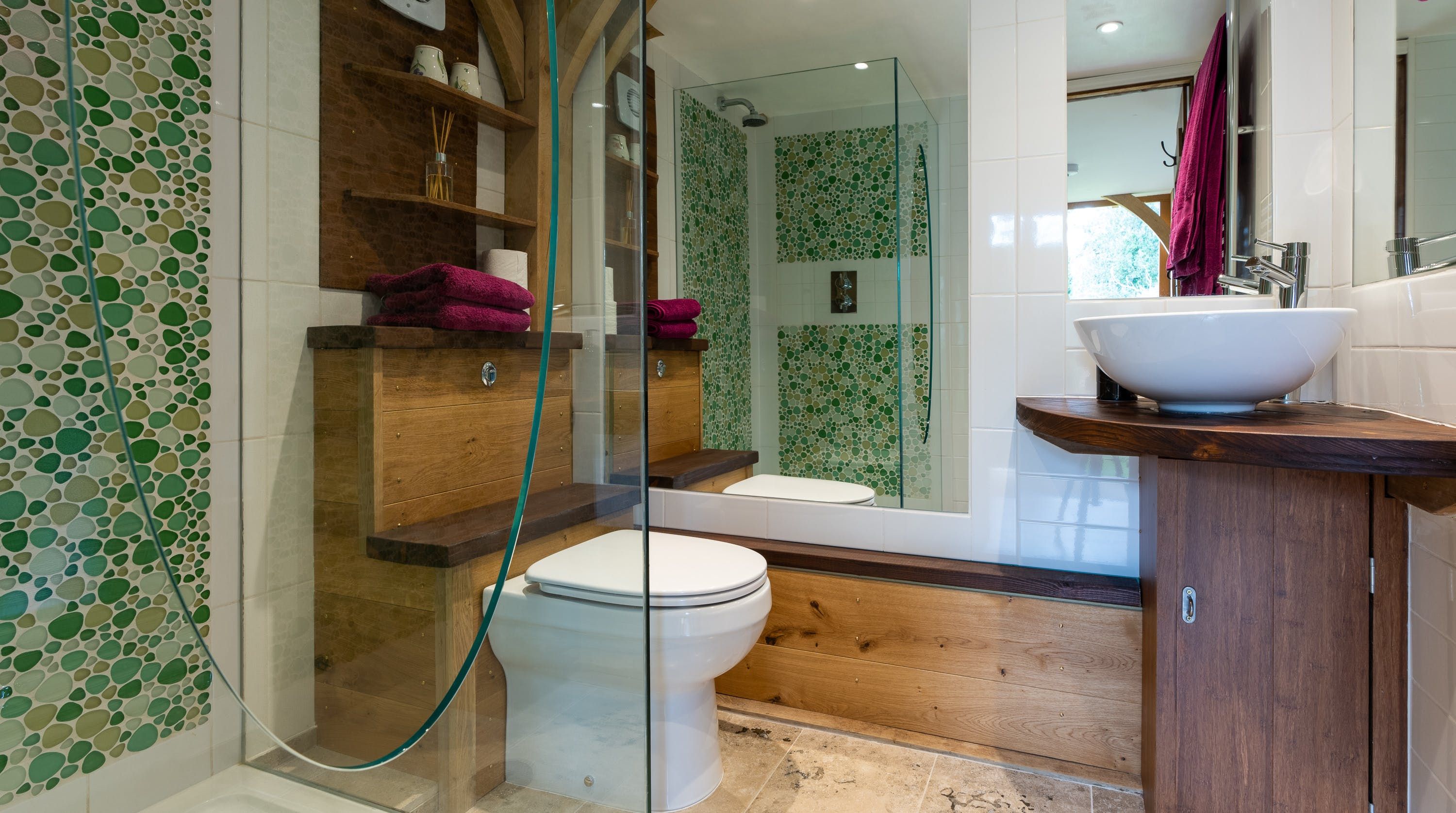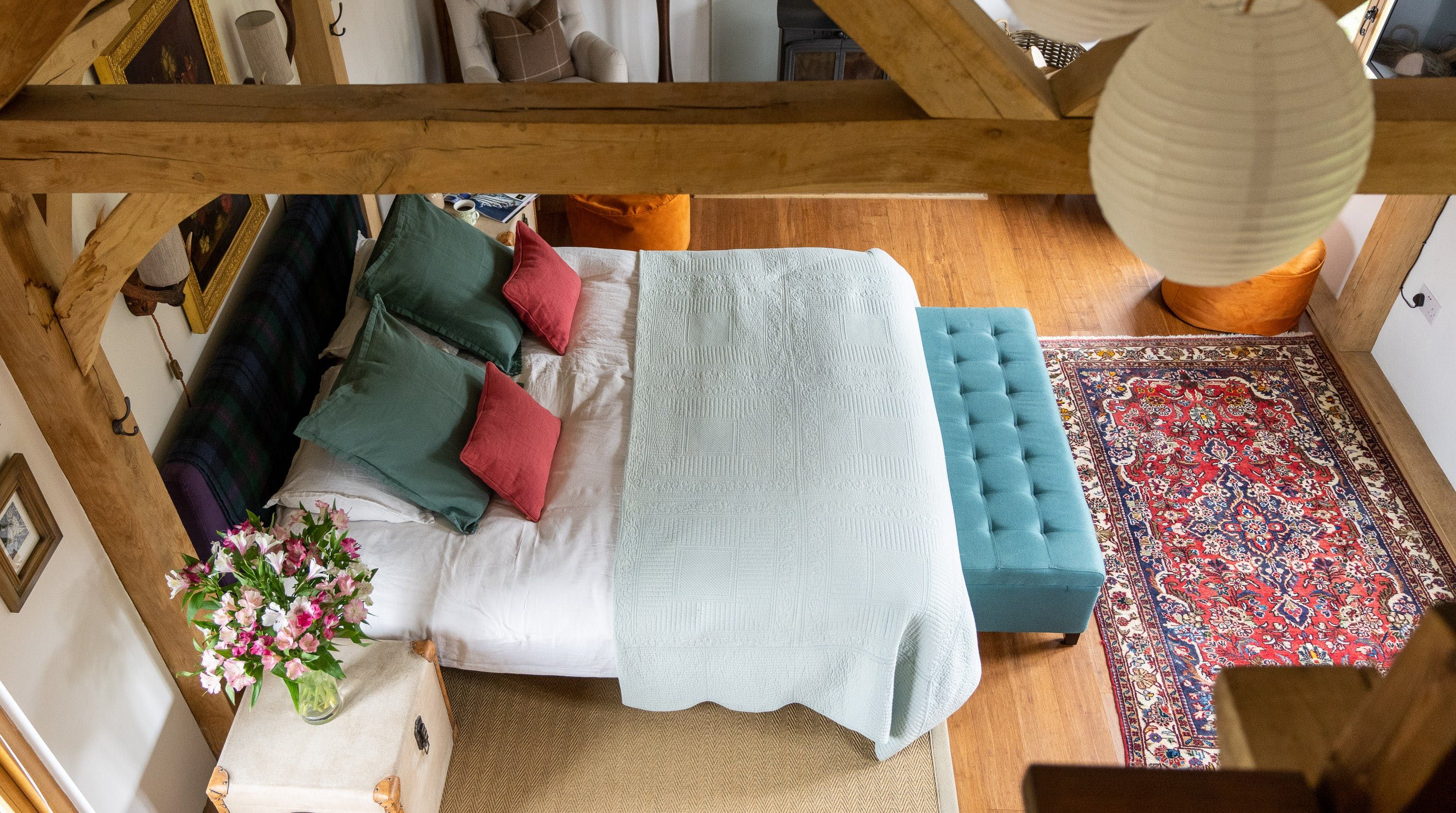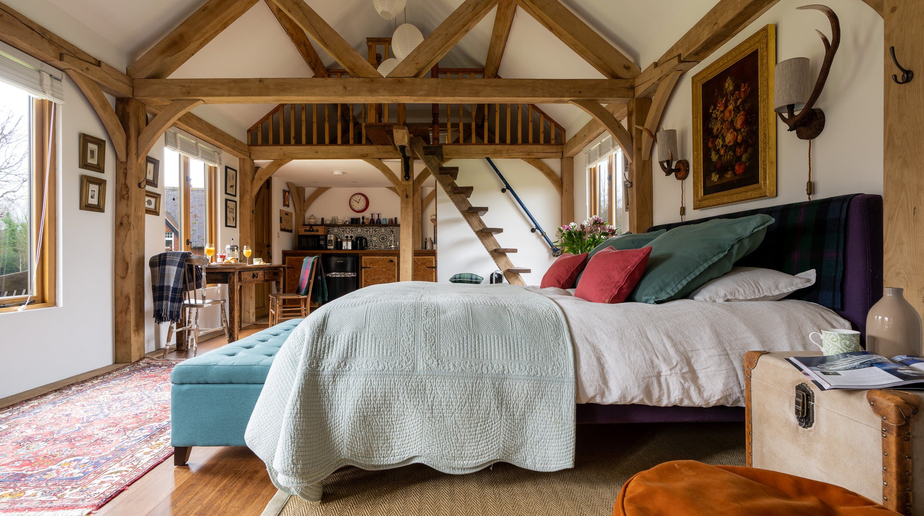 Inside, vaulted beamed ceilings and country chic decor create a warm and cosy welcome. Make yourself at home on one of the armchairs by the wood-burning fire and enjoy a glass of wine and some quiet reading in the warmth of its glow. The king-size bed beckons a blissful night’s sleep in its sumptuous sheets and wonderful wake-ups to views of the grounds before tucking into the fresh breakfast delivered to your door each morning.