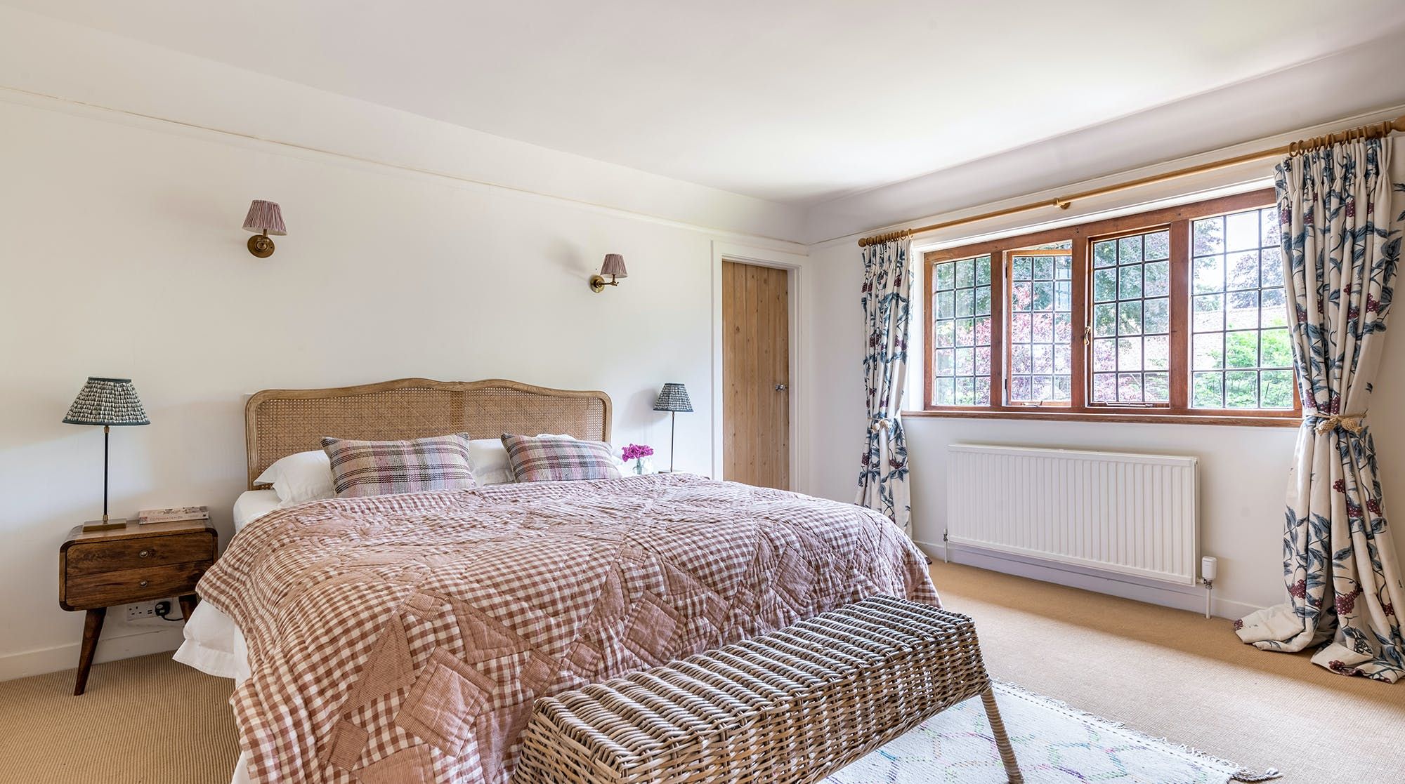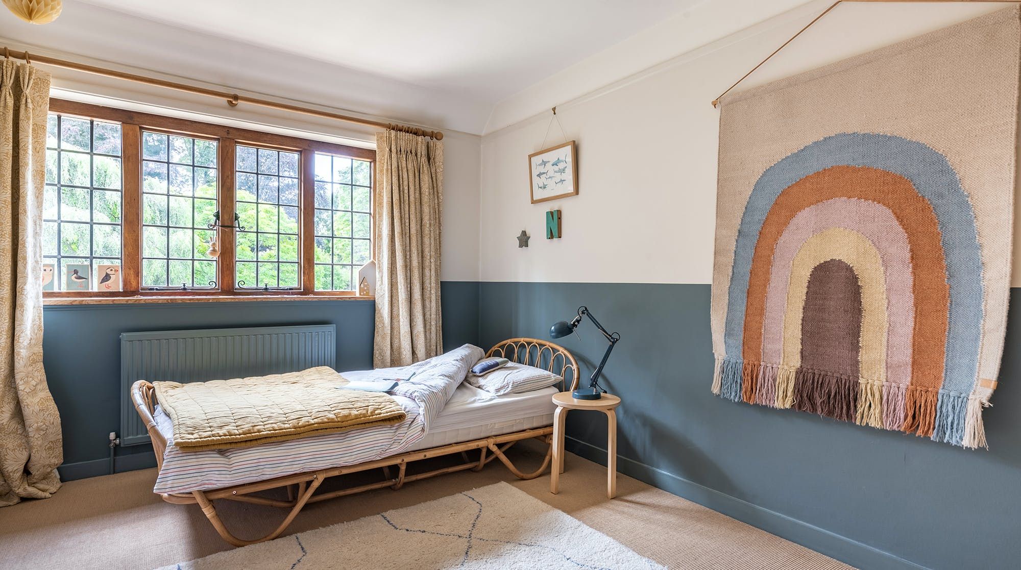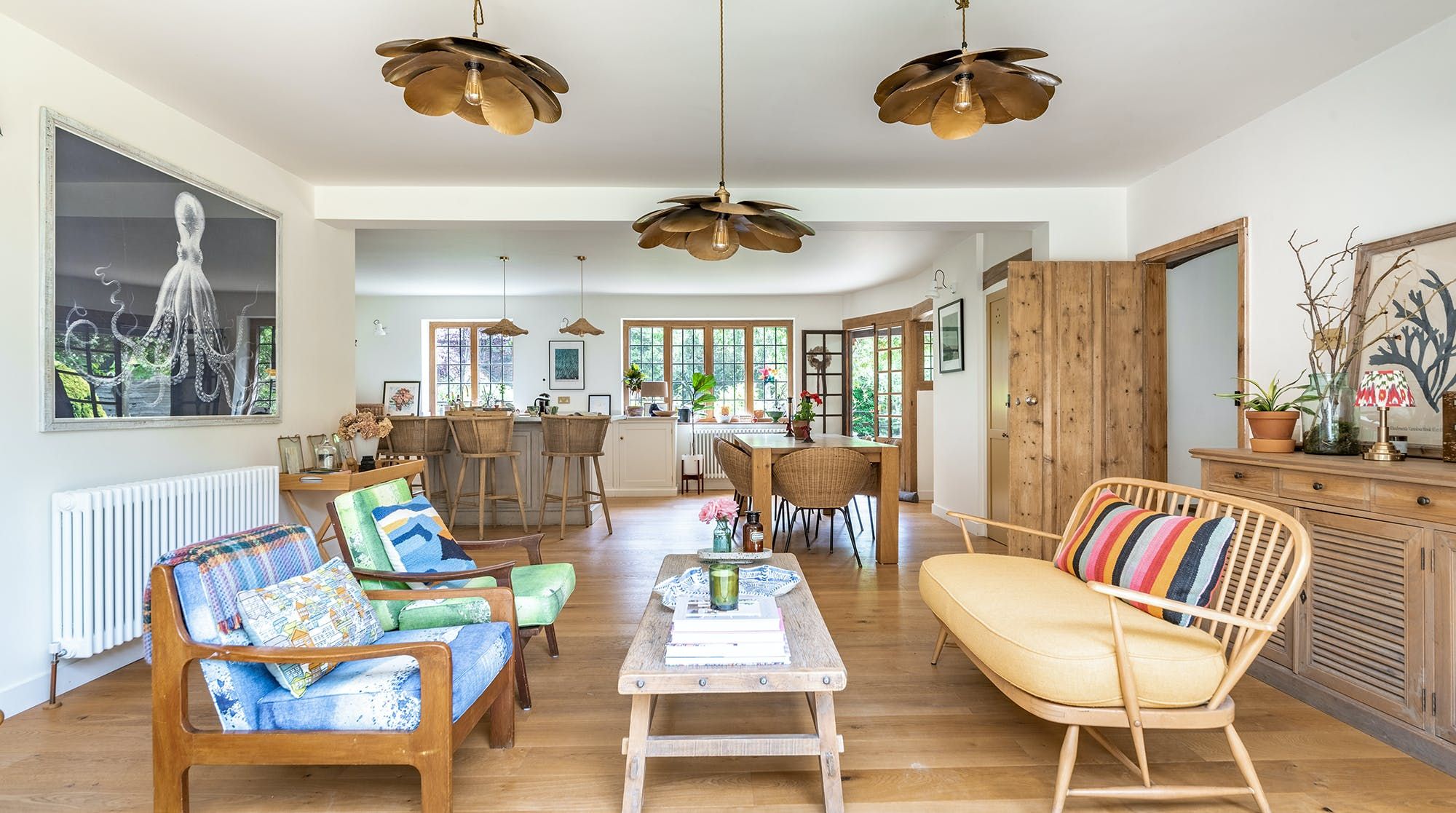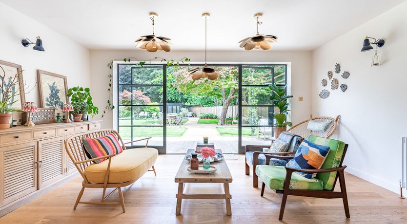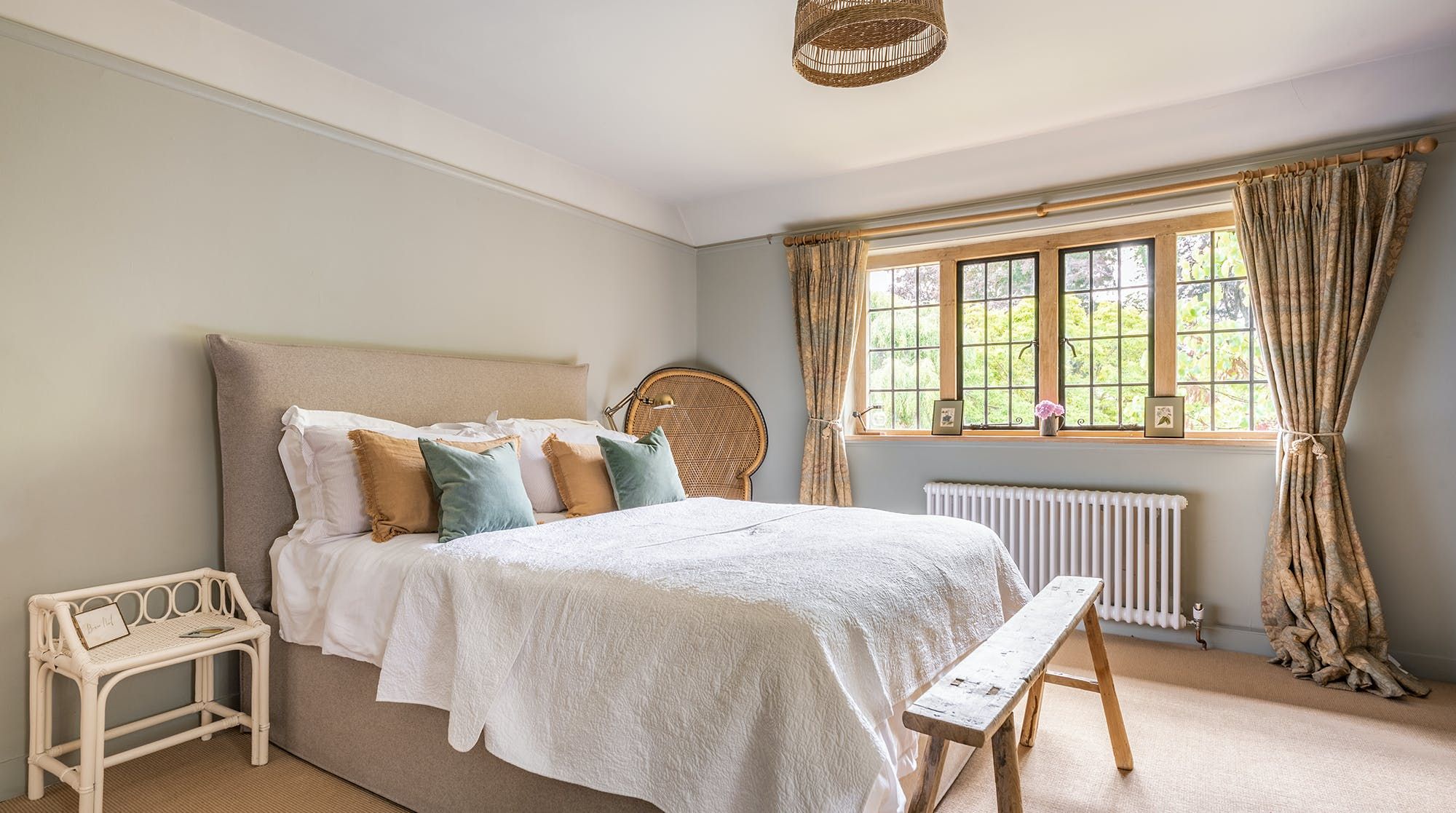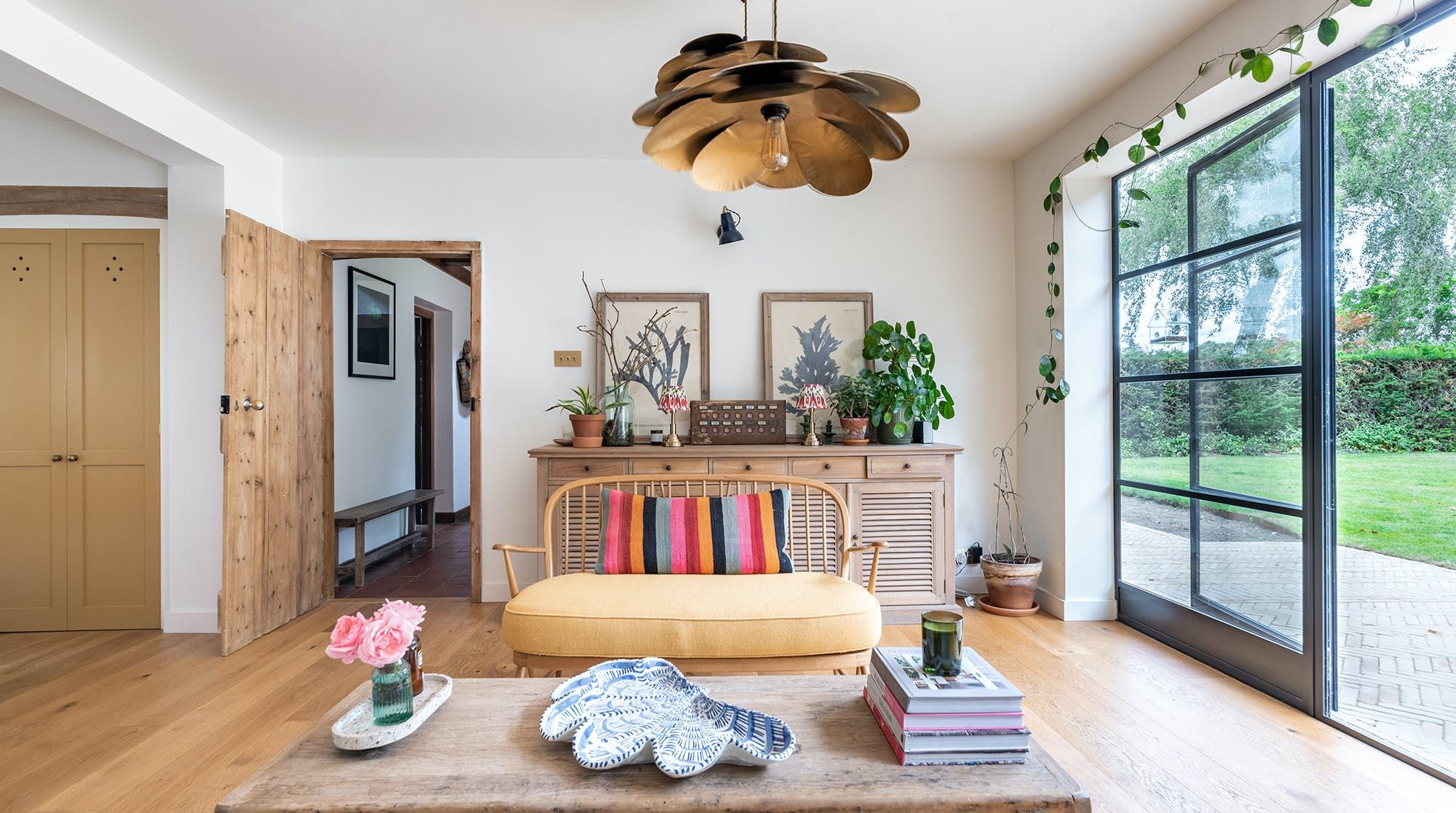 A masterclass in colour theory, the interior exudes an artisan ambience with its vibrant aesthetic, art-clad walls and eclectic array of stylish decor and vintage touches. Crittall doors usher in floods of sunlight while offering perpetual glimpses of the leafy exterior, and we love the open-plan living space. With its free-flowing layout and contemporary comforts, including an equipped farmhouse-style kitchen, it's primed for relaxation. Here, floor-to-ceiling sliding doors reveal the patio. After a restful night's sleep in the sumptuous bedrooms, step outside and sip your morning coffee here, awakening from your slumber to birdsong and the symphonic rustling of leaves.
