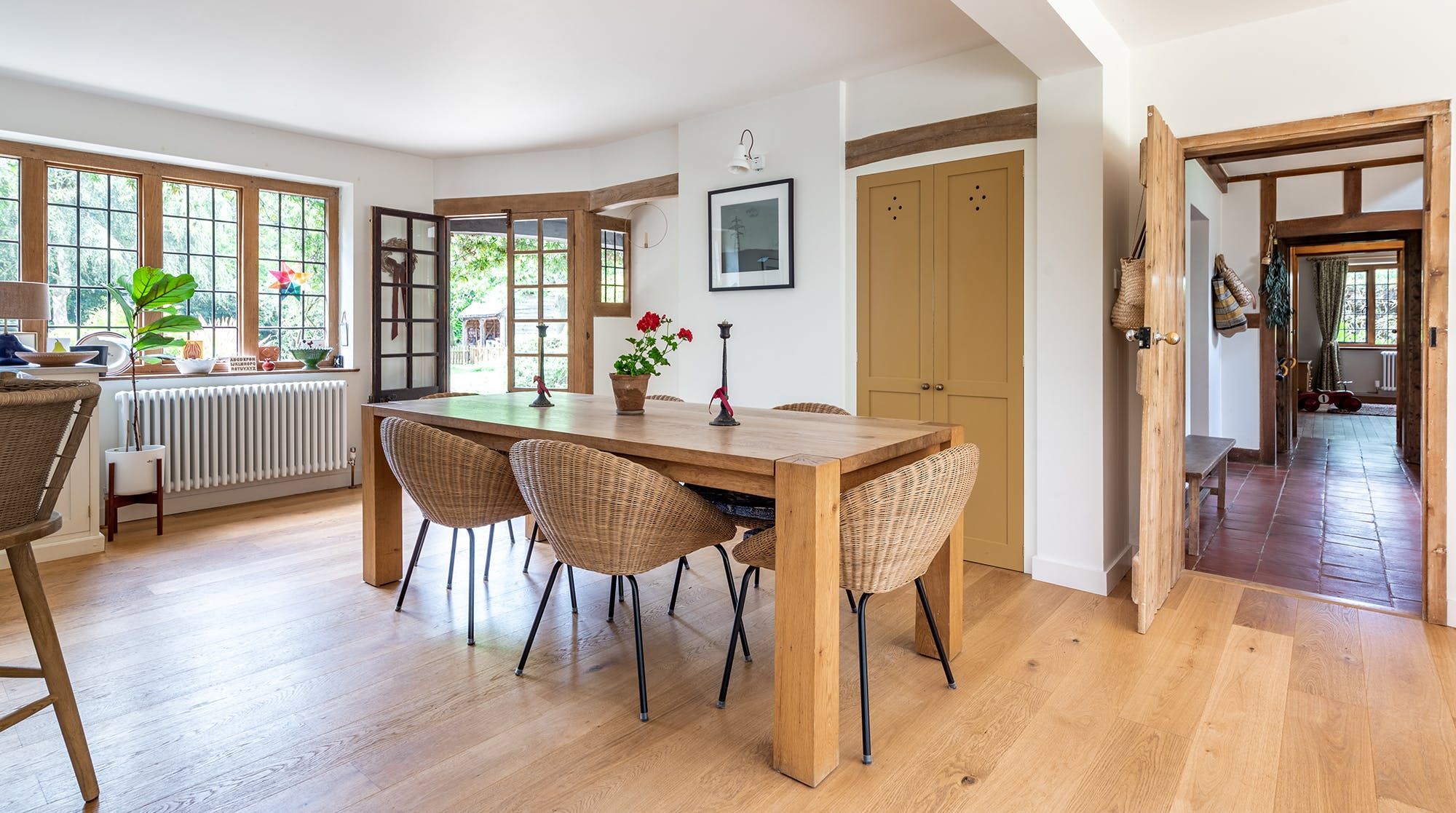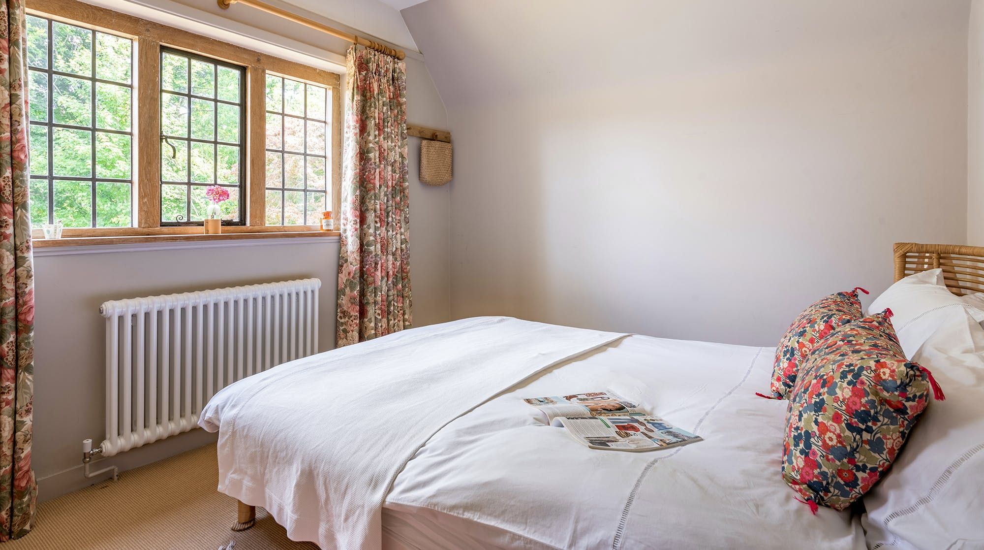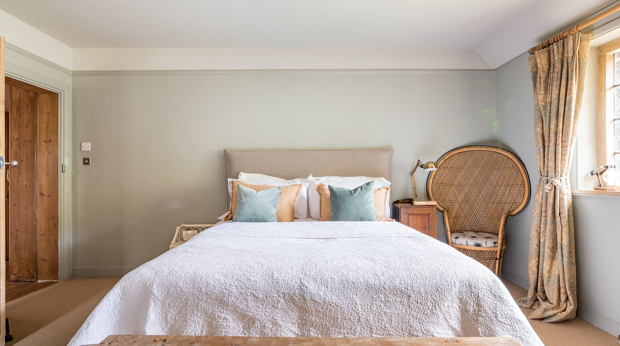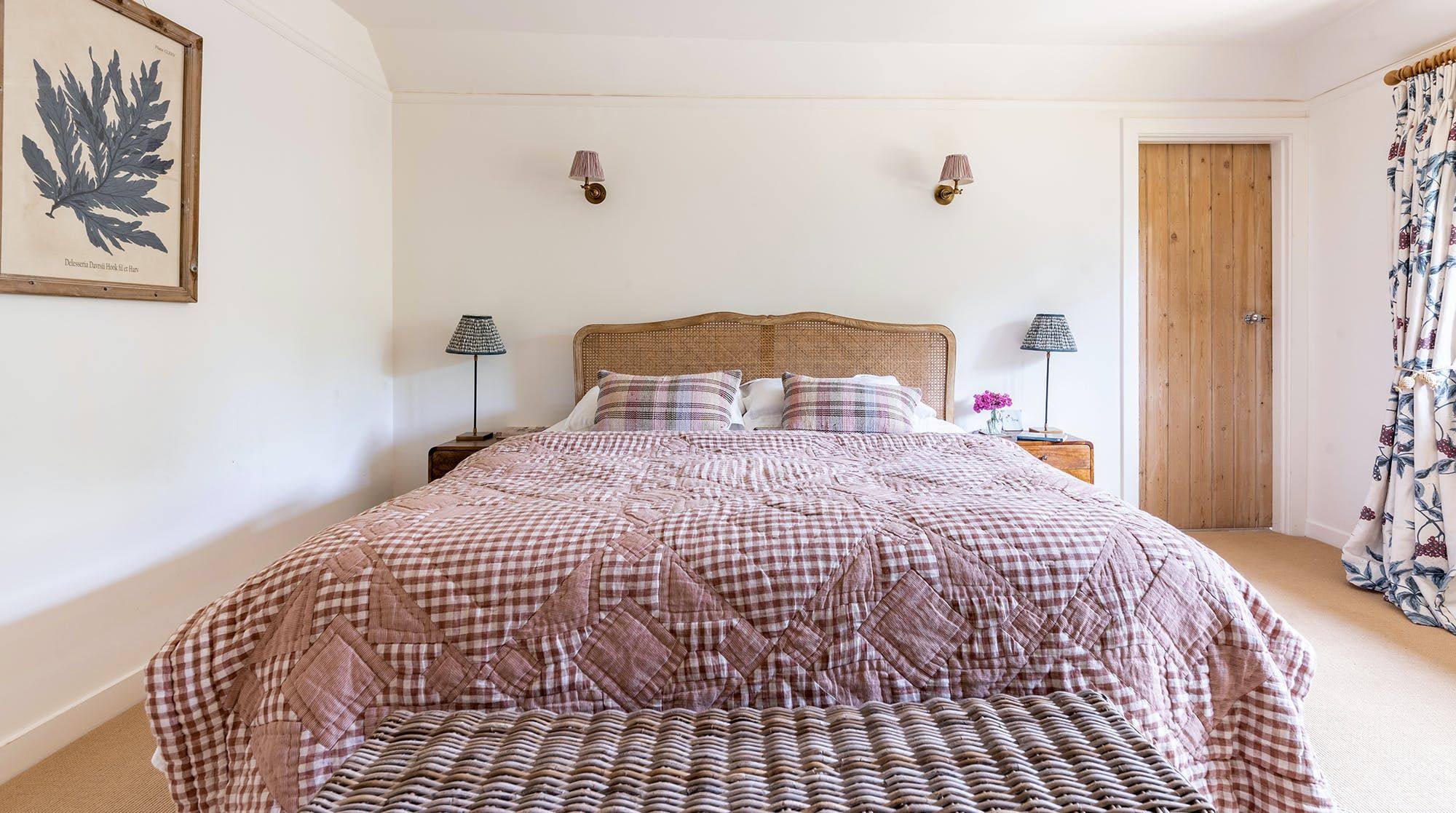 A masterclass in colour theory, the interior exudes an artisan ambience with its vibrant aesthetic, art-clad walls and eclectic array of stylish decor and vintage touches. Crittall doors usher in floods of sunlight while offering perpetual glimpses of the leafy exterior, and we love the open-plan living space. With its free-flowing layout and contemporary comforts, including an equipped farmhouse-style kitchen, it's primed for relaxation. Here, floor-to-ceiling sliding doors reveal the patio. After a restful night's sleep in the sumptuous bedrooms, step outside and sip your morning coffee here, awakening from your slumber to birdsong and the symphonic rustling of leaves.