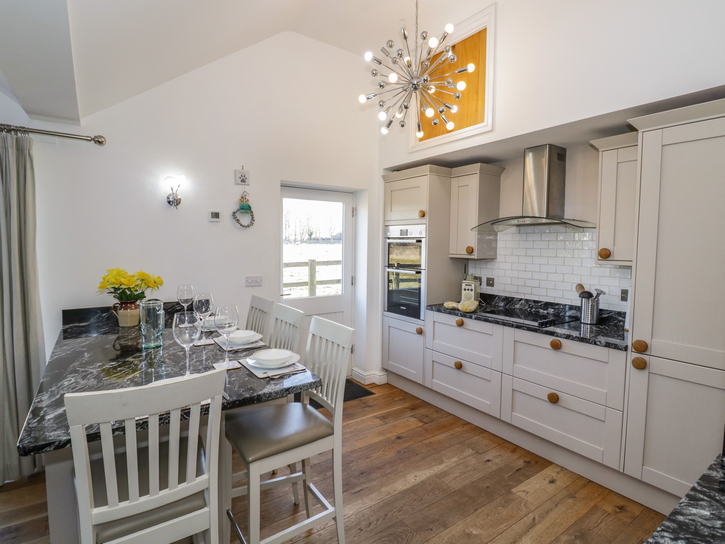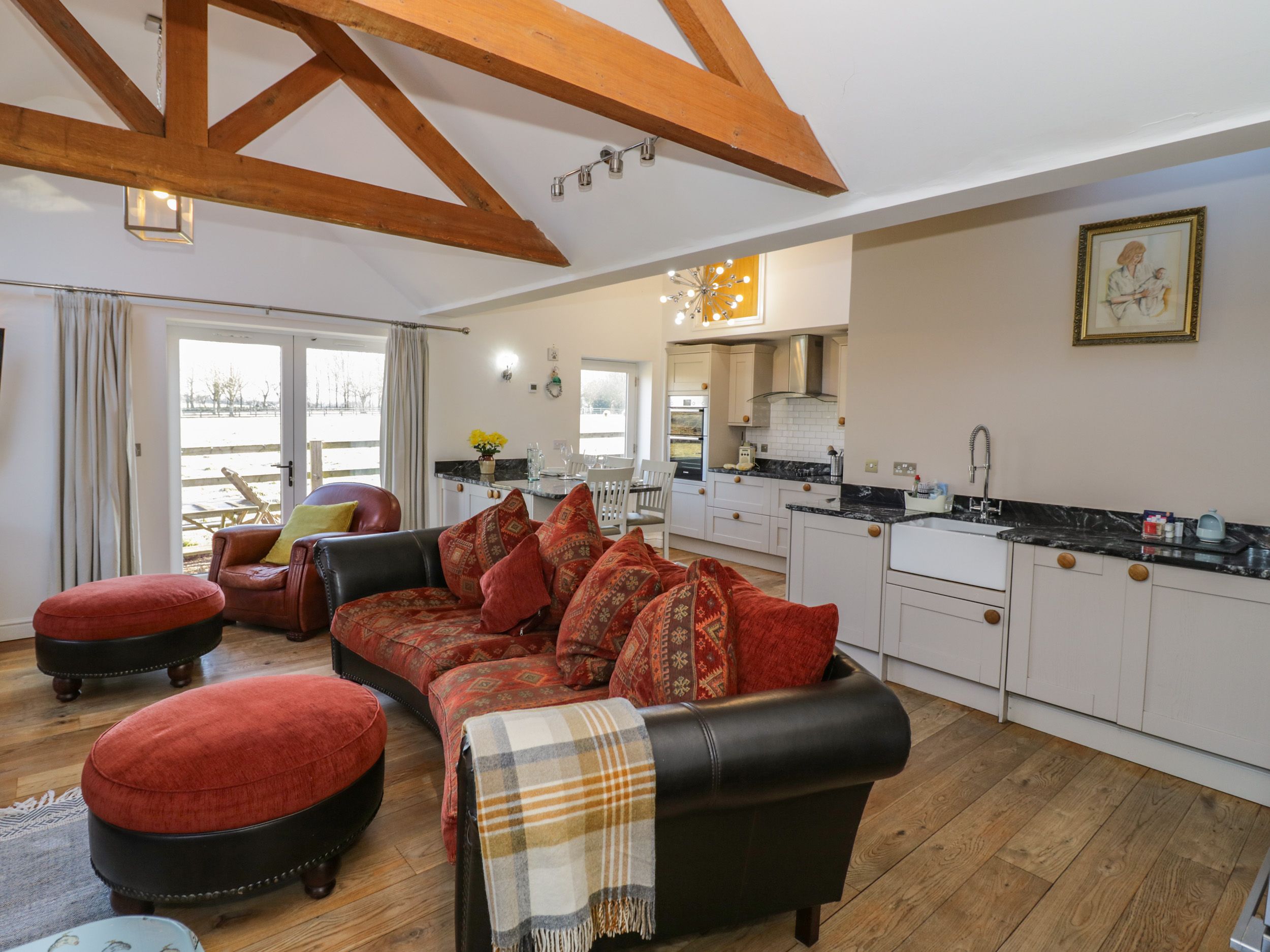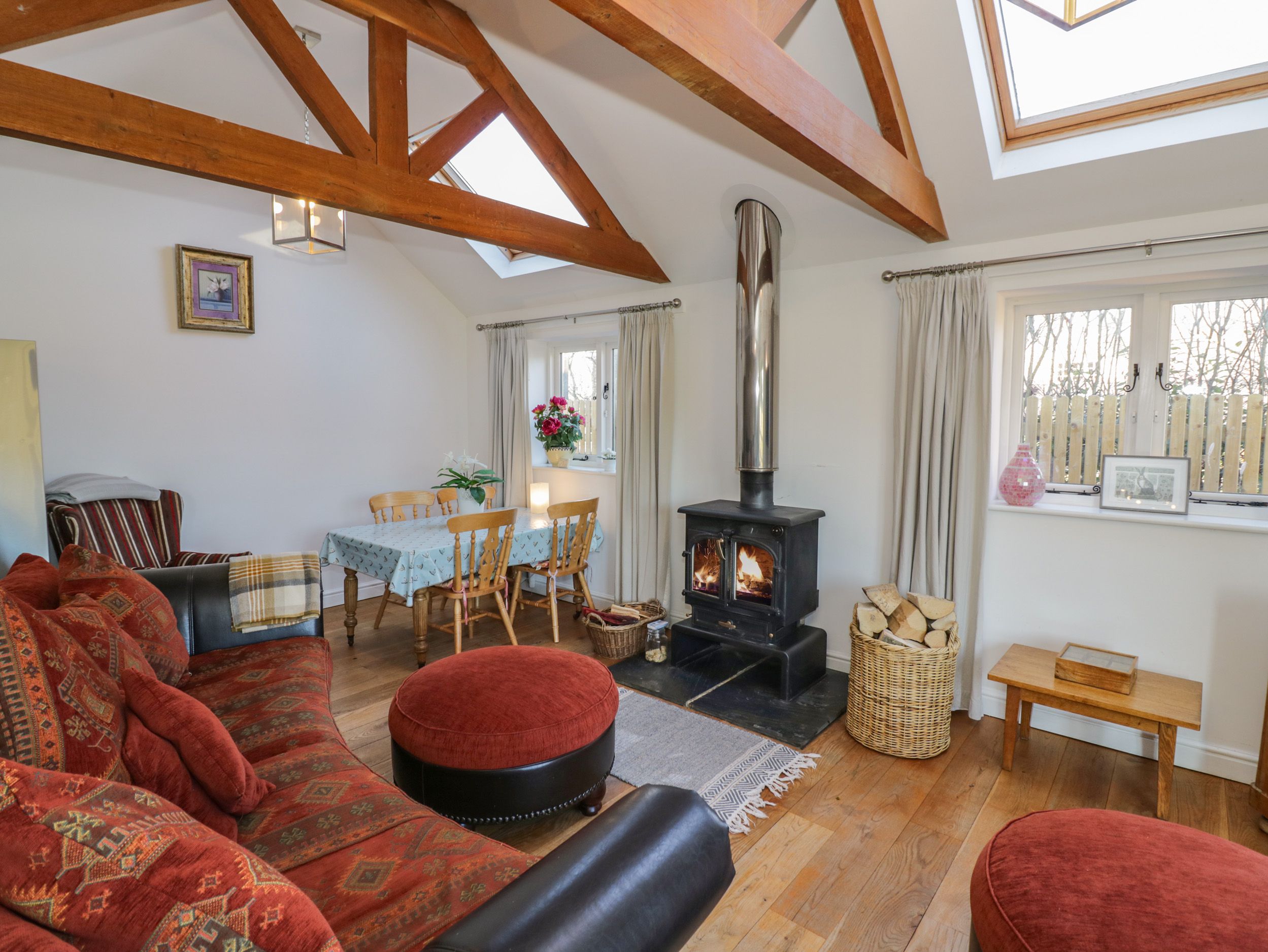 All ground floor. Two bedrooms: 1 x king-size double, 1 x super king-size. Shower room with shower, basin and WC. Open plan living area with sitting area, kitchen and dining area with wood burner, and breakfast bar.
