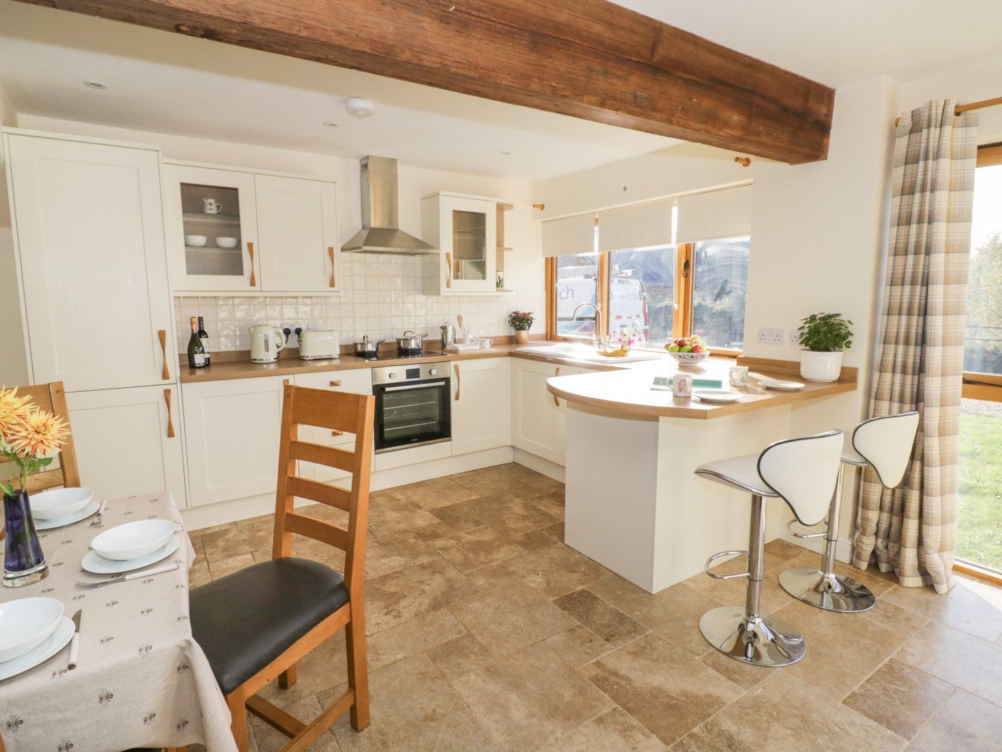 The living areas in the property consist of an open-plan living area with a kitchen with electric oven and hob, microwave, fridge/freezer, washing machine, dishwasher, dining seating for four, breakfast bar for two, and a sitting area with Smart TV. The bedrooms consist of a double and a twin, along with a shower room. Outside, there is a small patio with furniture, as well as off-road parking for two cars. Within 0.7 miles, you will find a shop, and within 2.5 miles, a pub, and please note that this is a non-smoking property. WiFi, fuel, power, bed linen and towels are all included in the price. One well-behaved dog welcome. Note: The garden is not enclosed. Adventure awaits at Granary Cottage No. 2.