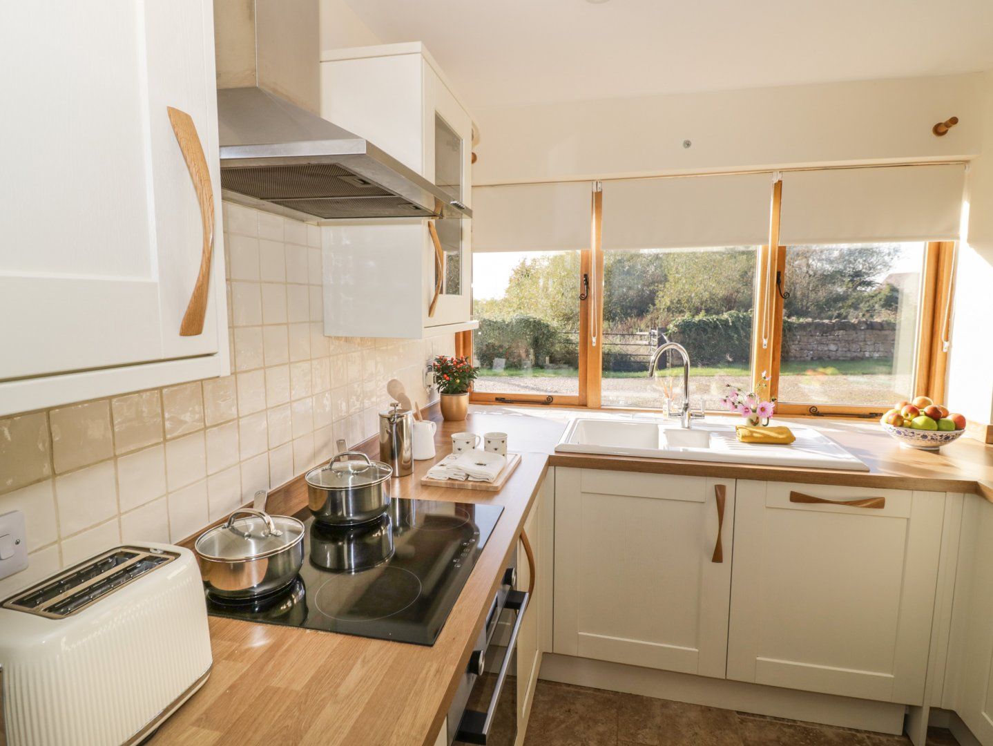 Two bedrooms: 1 x double, 1 x twin. Shower room with walk-in shower, basin, heated towel rail and WC. Cloakroom with basin and WC. Open-plan living space with kitchen, dining and sitting area