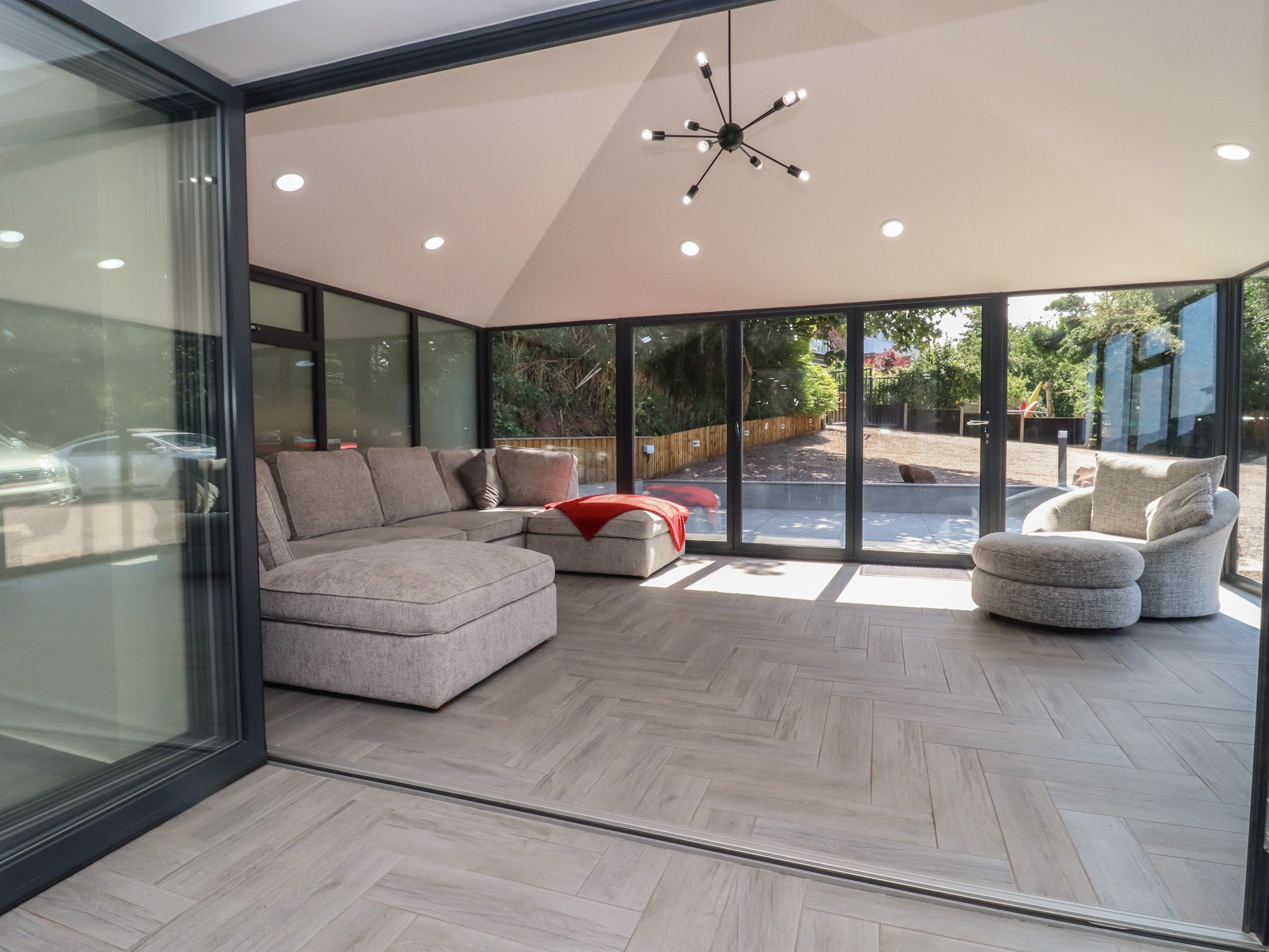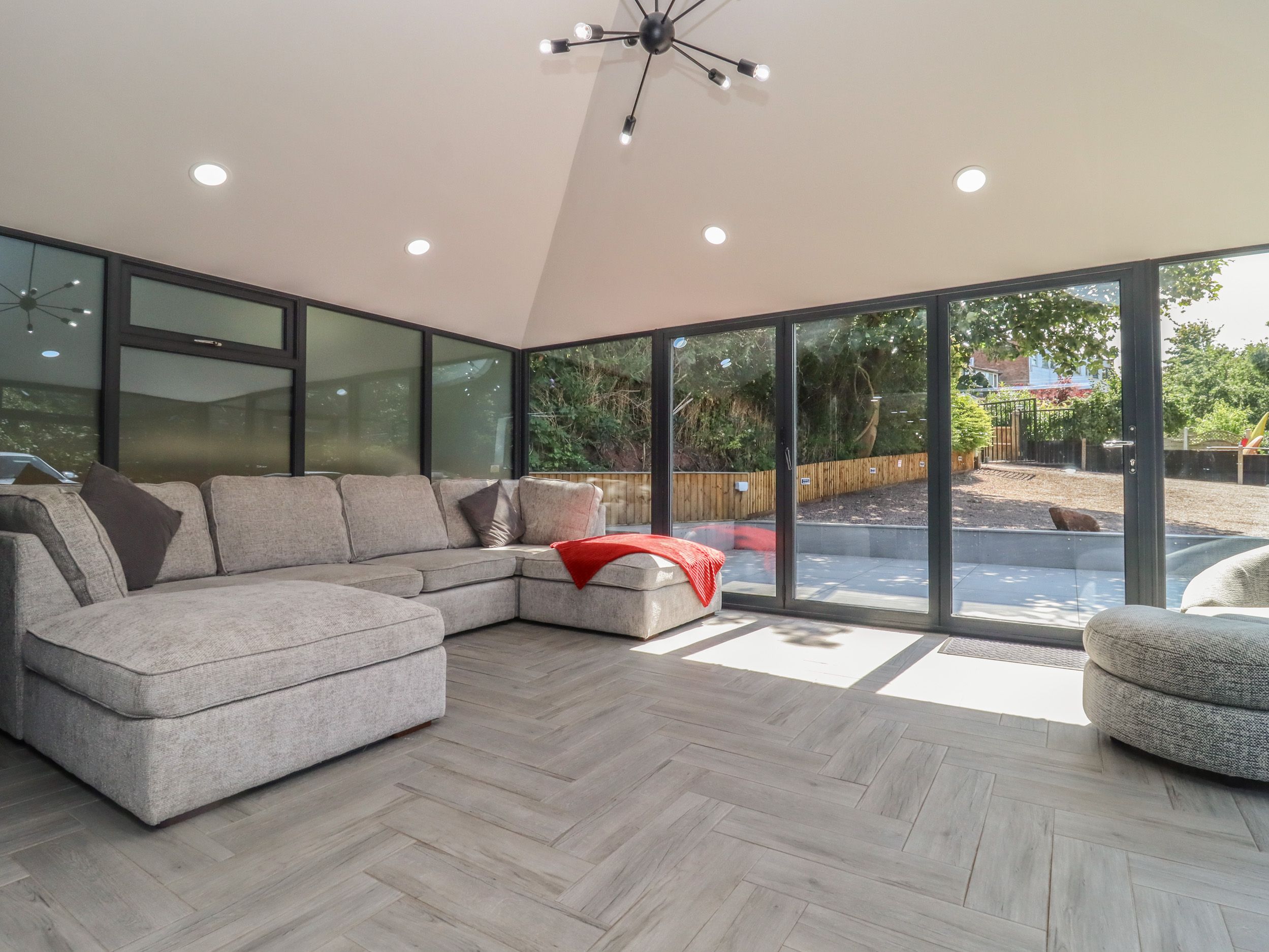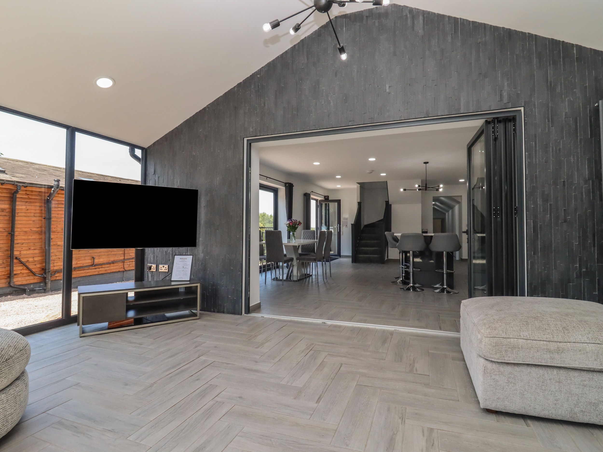 Four bedrooms: 1 x ground-floor king-size with TV and Juliet balcony, 2 x ground-floor double with Juliet balcony, 1 x king-size with en-suite walk-in shower, basin, and WC. Open-plan living space with kitchen, dining area, and sitting area