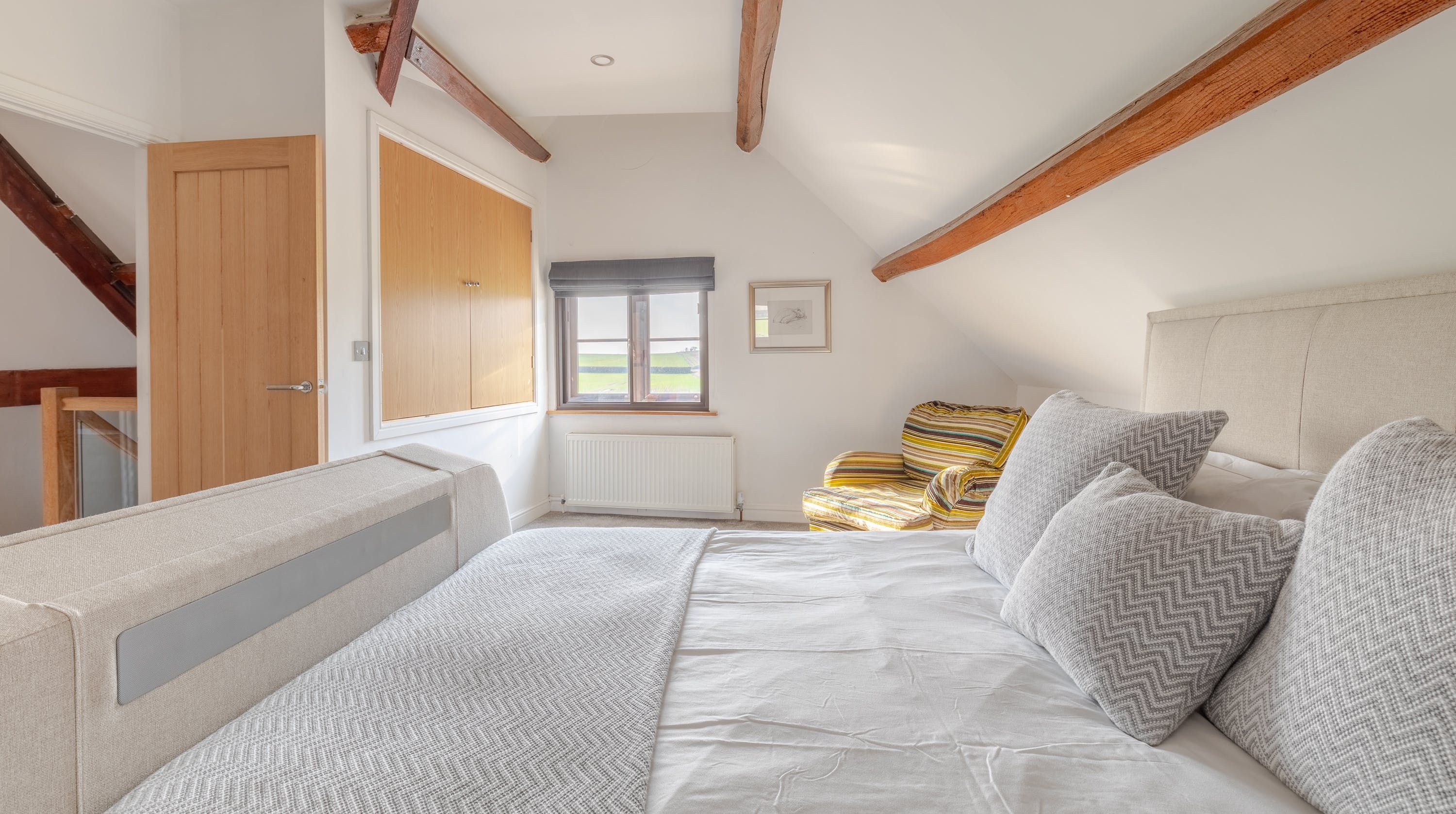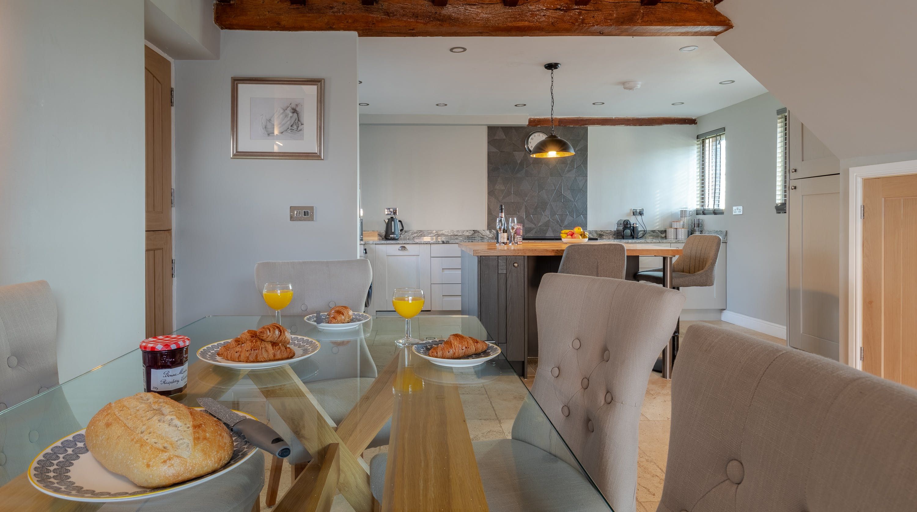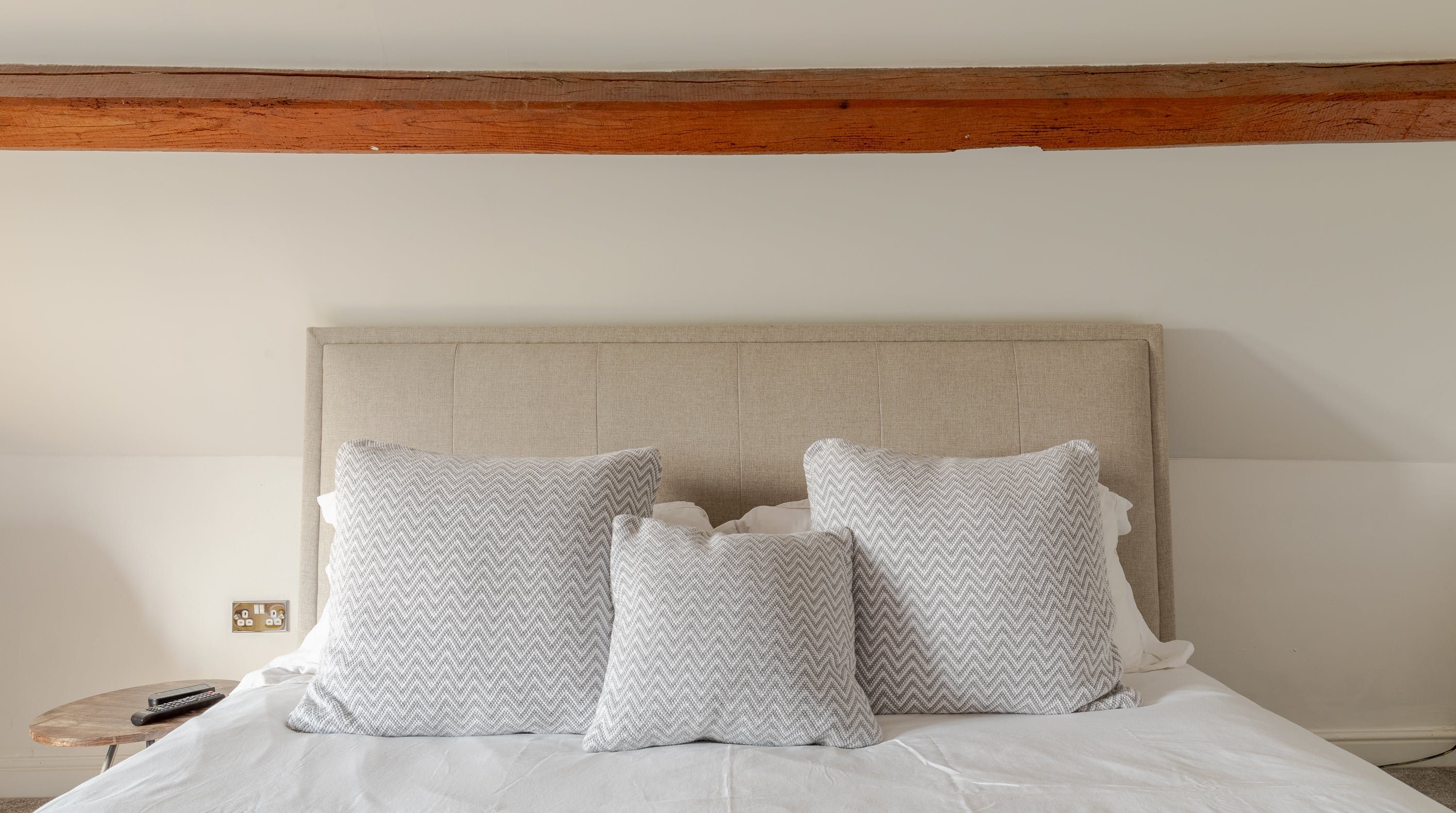 Aside from the wooden ceiling beams, you would hardly be able to work out this home's former life if you didn't already know. The colour palette leans heavily upon sleek muted greys, all illuminated by subtle spotlighting, while the kitchen has bountiful amounts of surface space for whipping up country feasts.