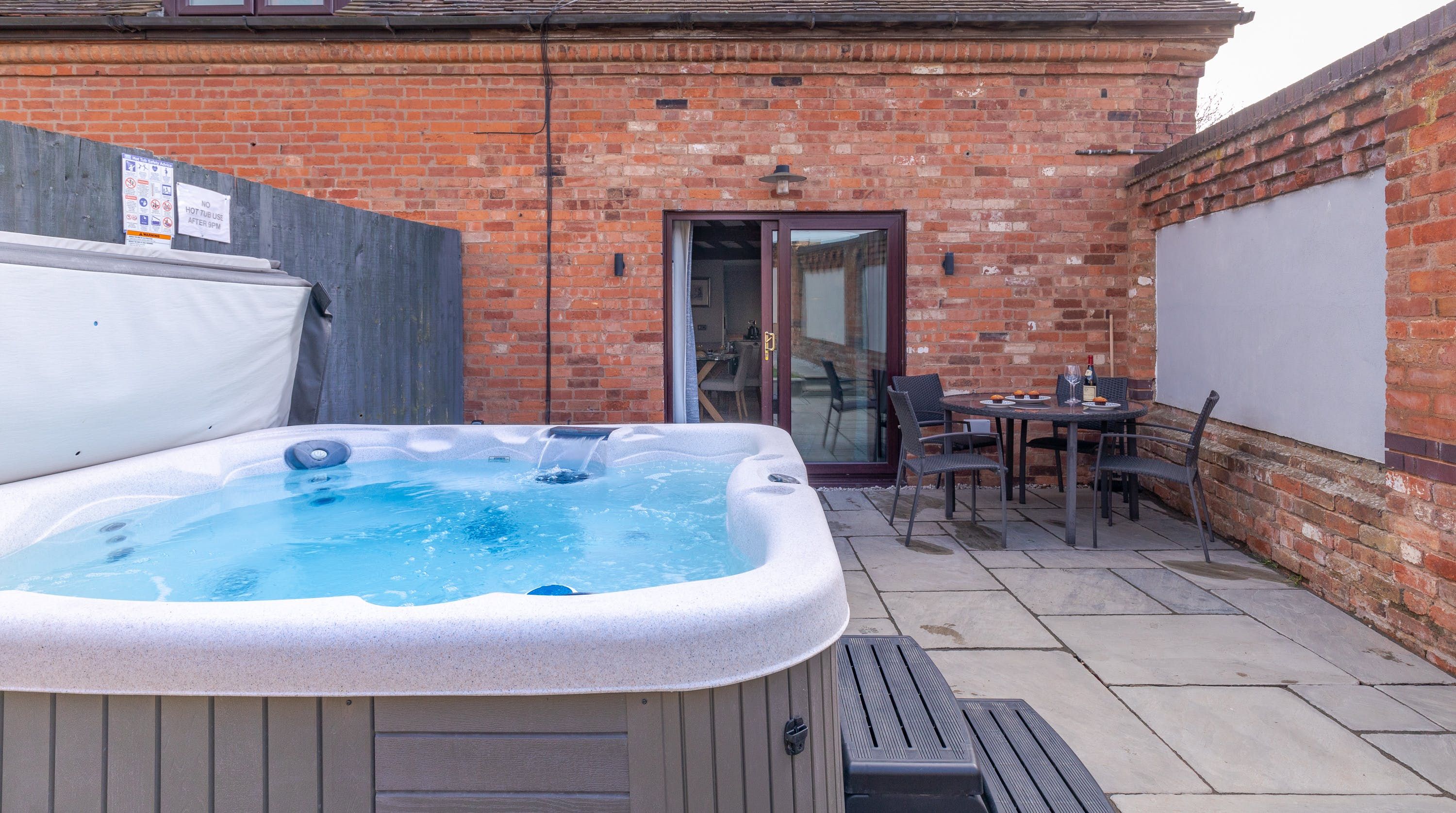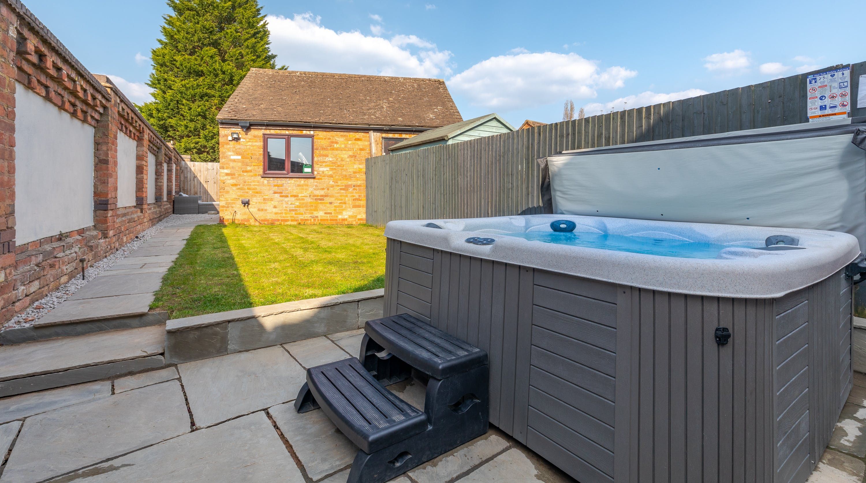 Out through the back door, there's a private garden with seating so you can enjoy bursts of sunshine, as well as a hot tub that's ideal whatever the weather. At the end of this space is a garage that has also been converted and packed full of gym equipment.