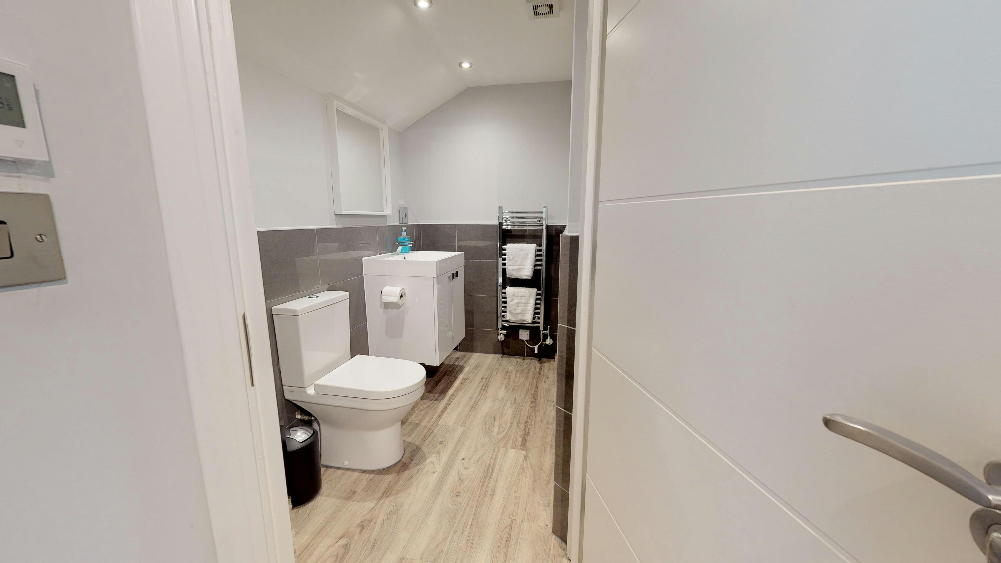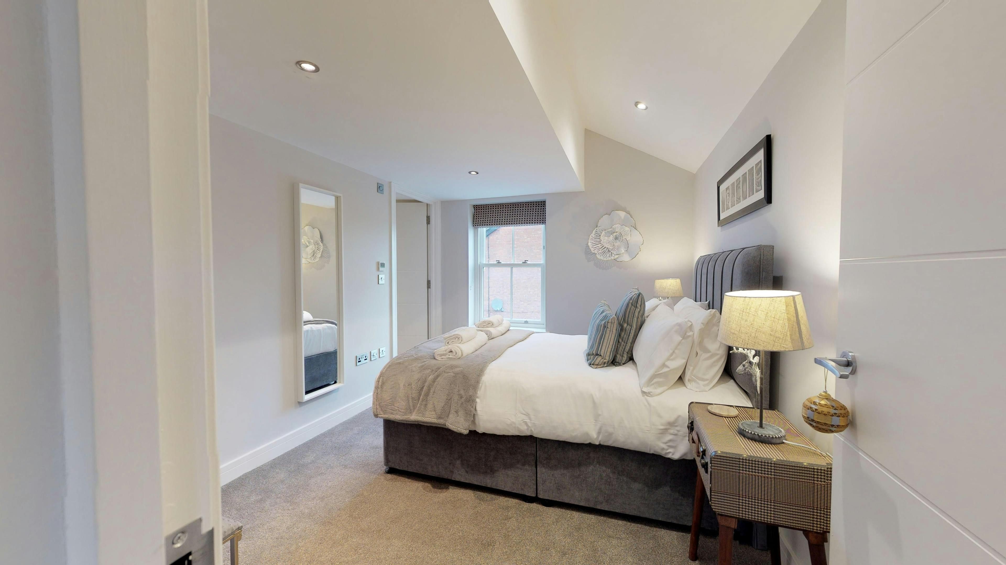 You’ll find this well-placed apartment just a few minutes’ walk from the heart of Leamington Spa with all of its chic boutiques, restaurants and bars. Other attractions nearby include Warwick Castle and Stratford-Upon-Avon, the birthplace of William Shakespeare (Leamington Spa railway station is 2 miles away). If you’re arriving by car, there’s private parking for one car here, but we’d say don’t pack heavy bags, as there’s no lift and the apartment is on the second and third floors. This modern and spotless home with both bedrooms en-suite, is up in the eaves too, so there may be some limited head height if you’re on the taller side.