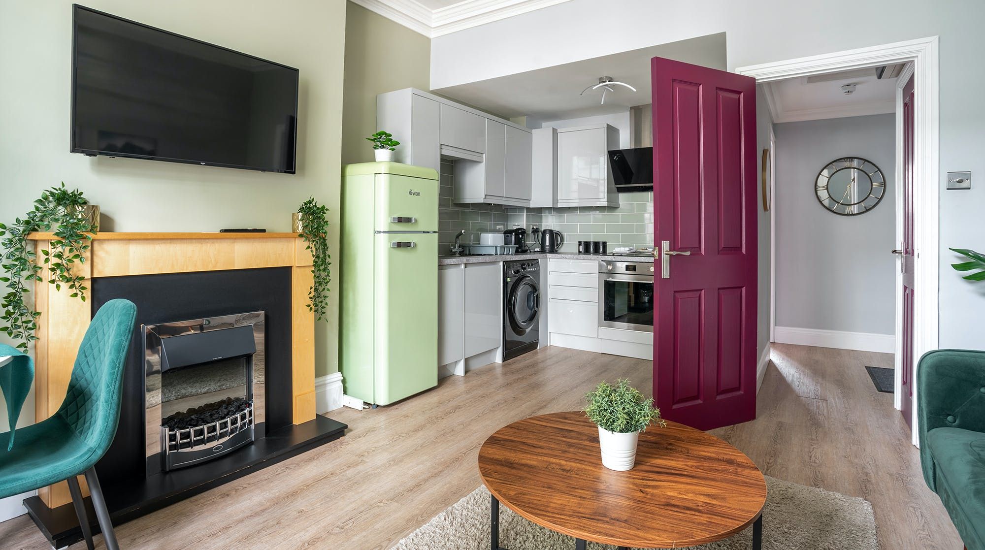 The tasteful decor continues into the double bedroom, which is located at the back of the building, promising a restful night's sleep. Wake up each morning and prepare a hearty breakfast to enjoy at the bright dining table – the pistachio-coloured fridge is a particular highlight for us.
