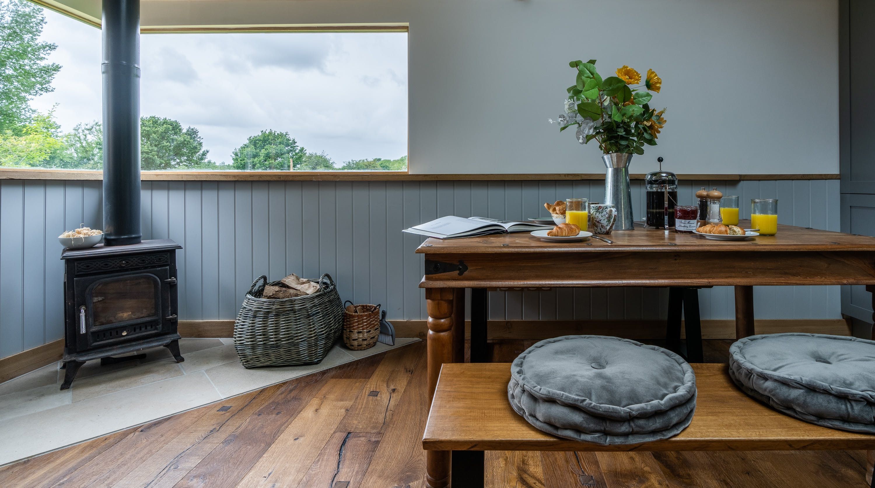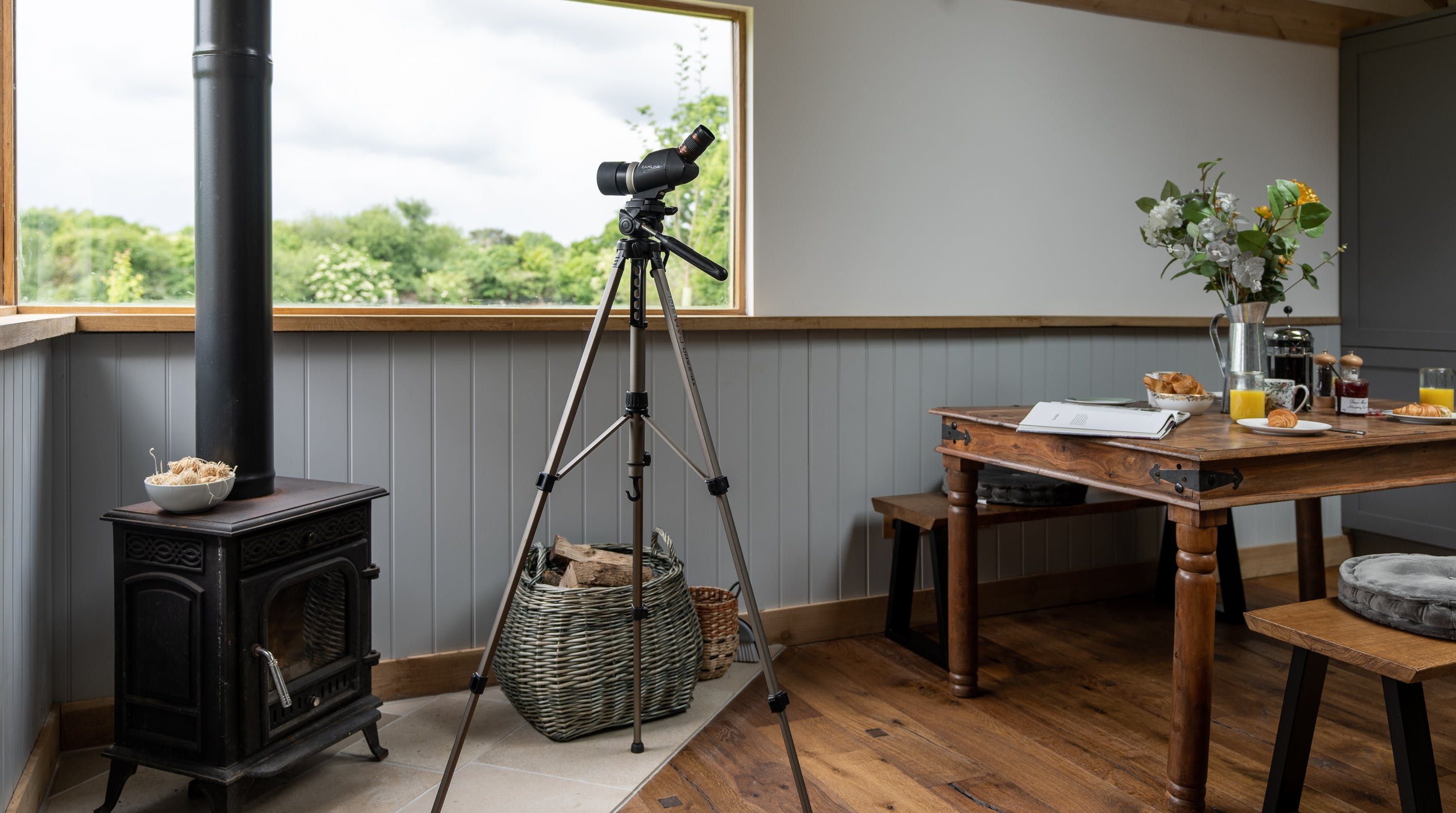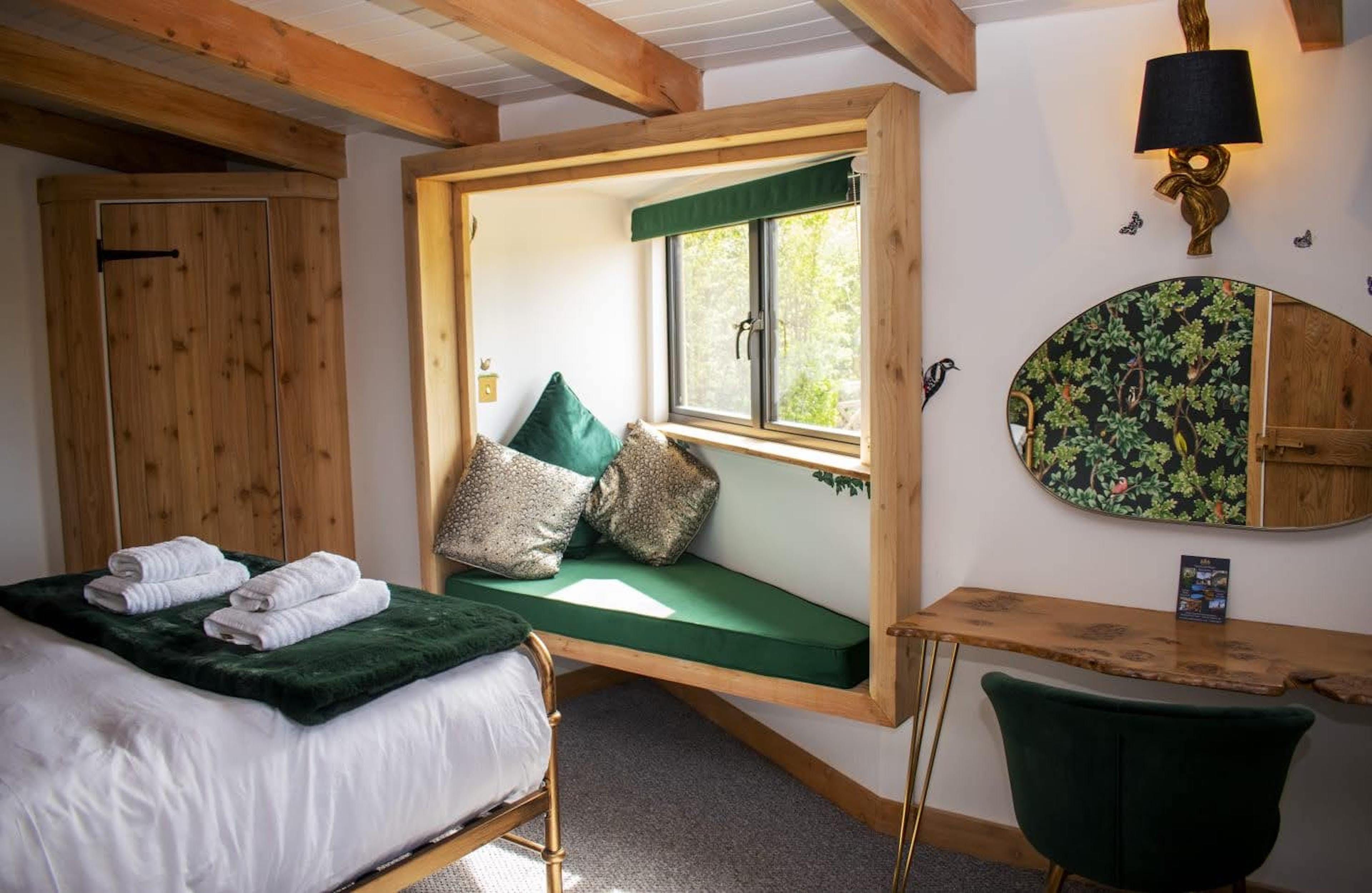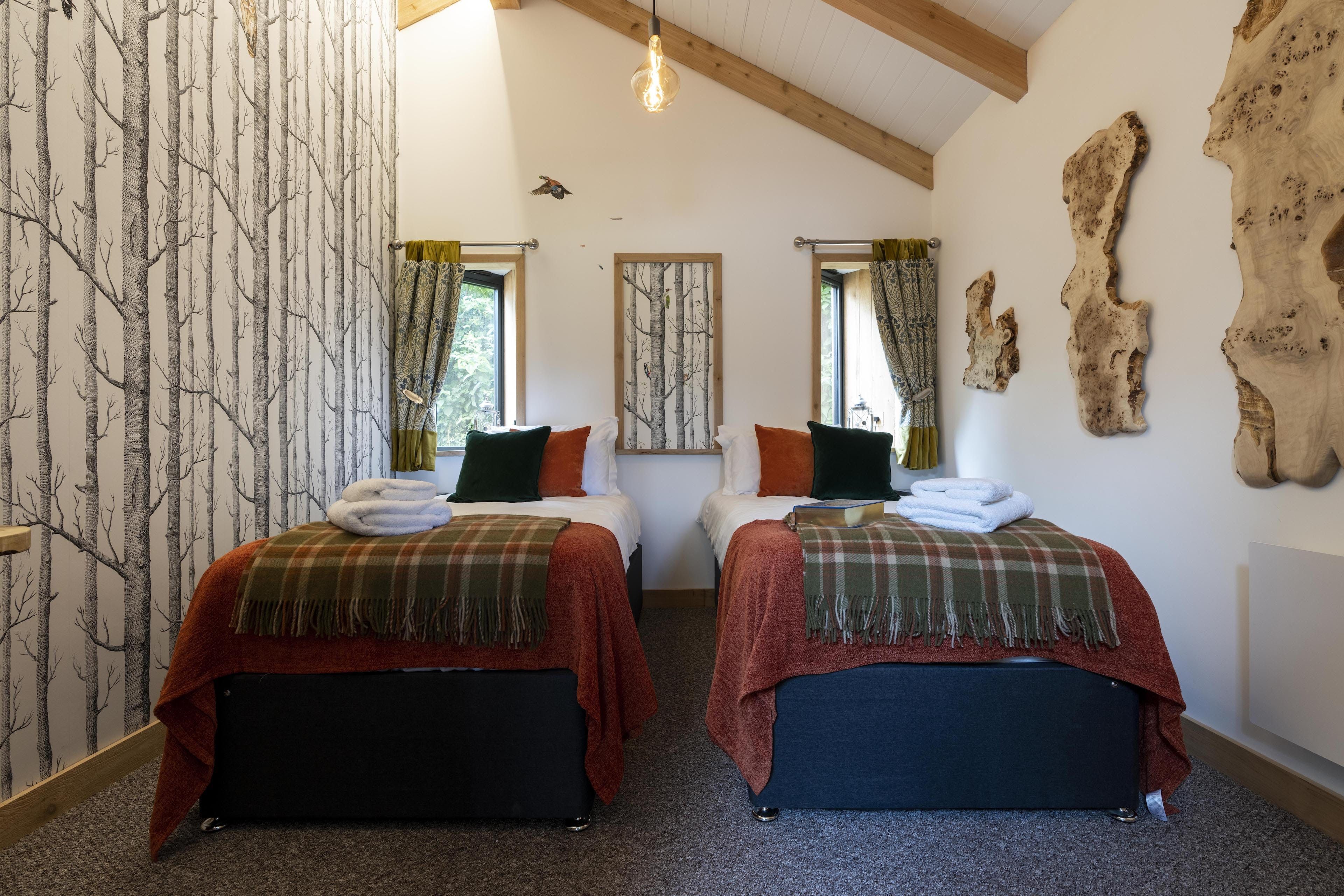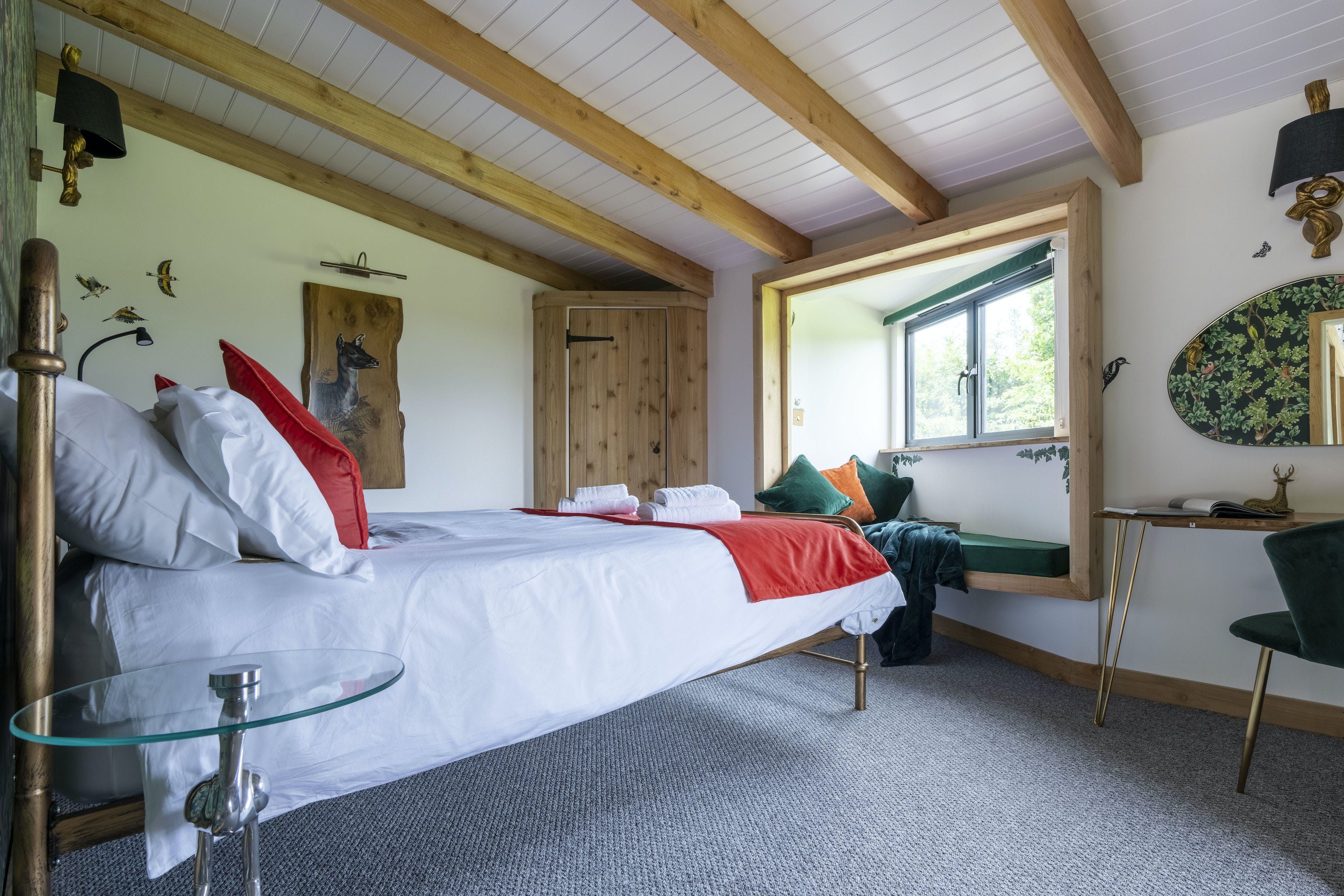 The interior is a reflection of the wilderness location, with wooden artworks featuring fawns and birdlife on display in the cosy bedrooms. The window seat in the master makes for the perfect reading nook, overlooking the meadow, and there’s a desk in here should you need to work remotely. The vaulted, wood-beam ceiling is twisted with stringed lights for a fairytale effect and there’s plenty of room at the rustic wooden table for the group to dine inside (if you’re not enjoying an alfresco meal on the terrace, that is). Come evening time, the plush sofas in the living room are set around a wood-burning stove.
