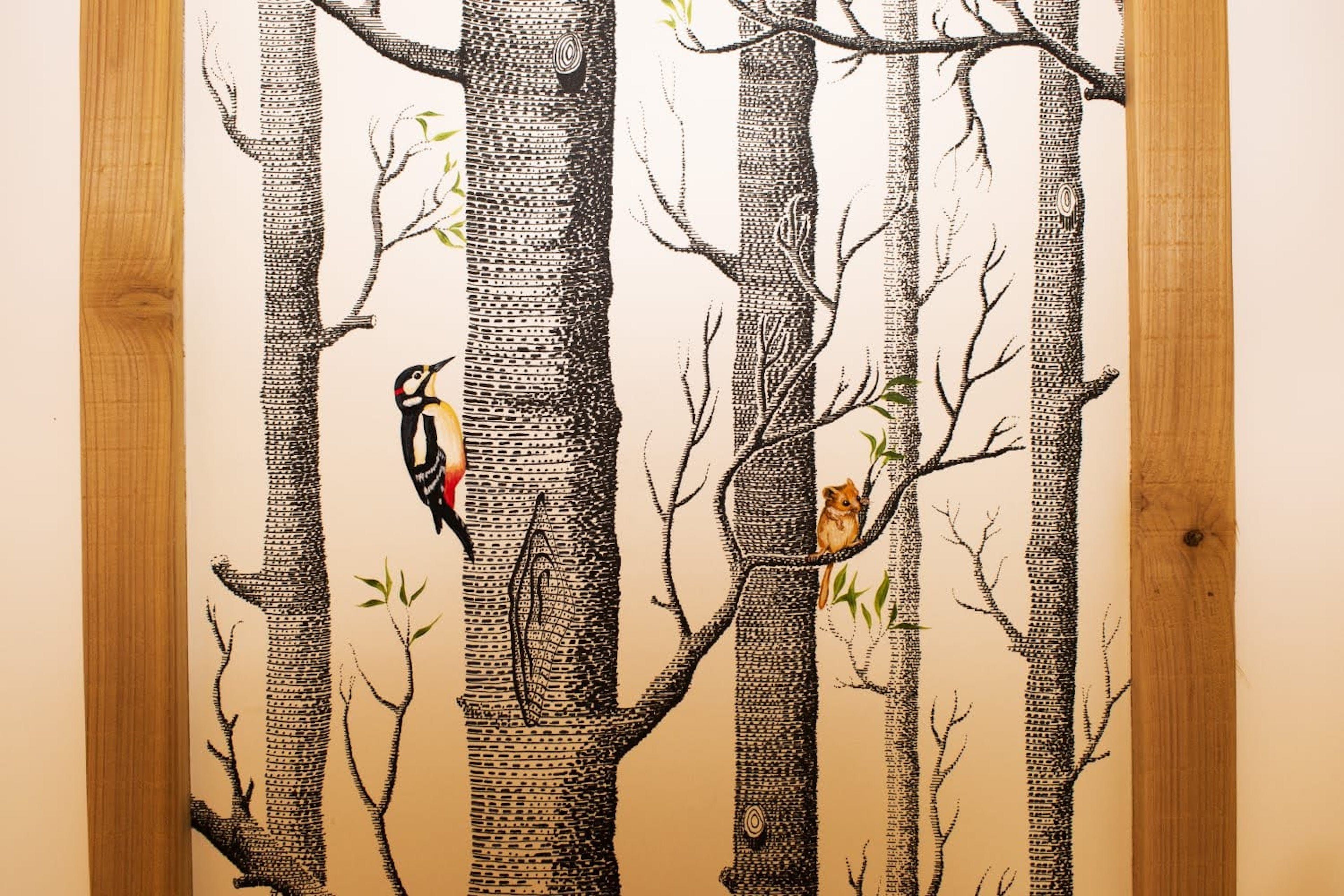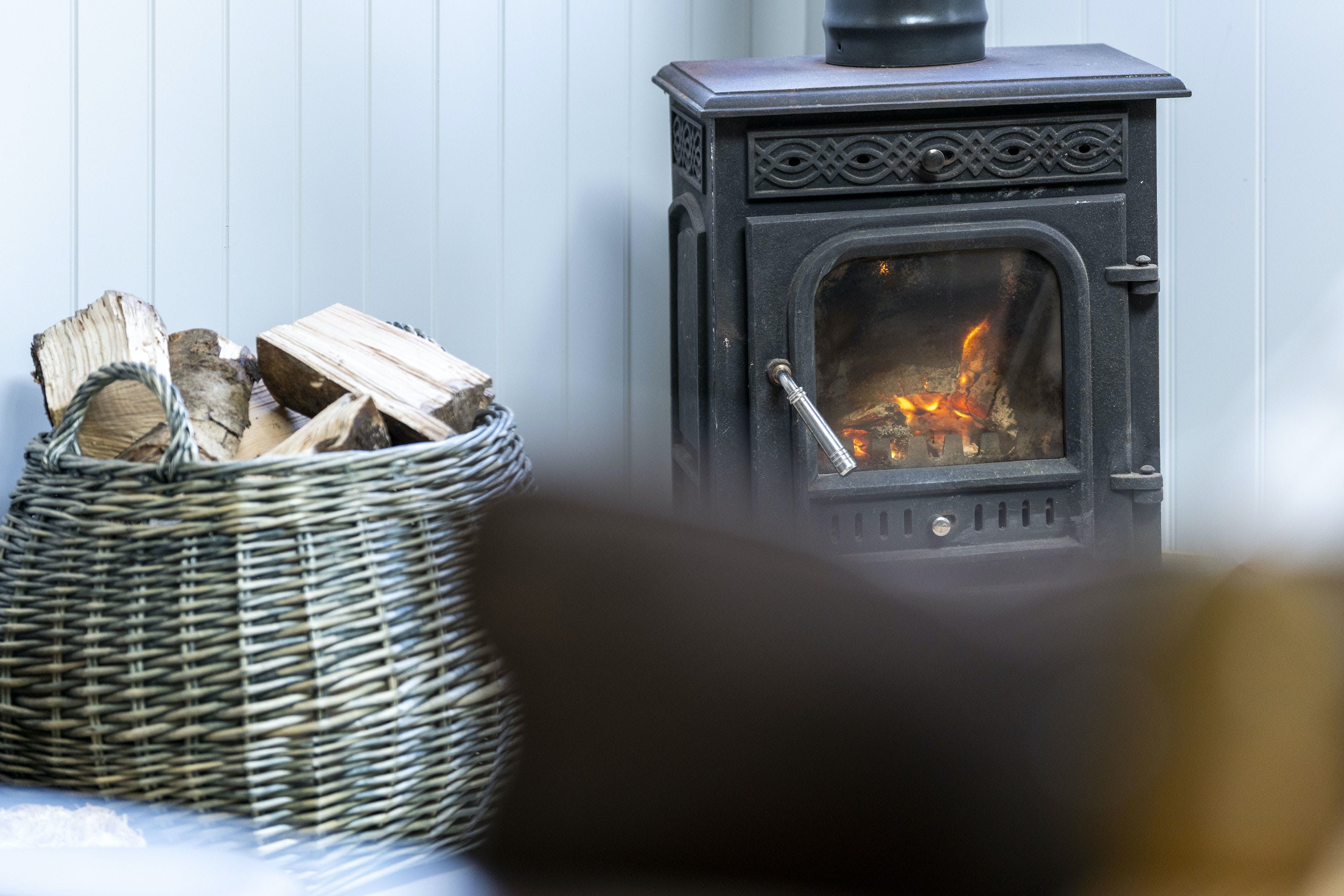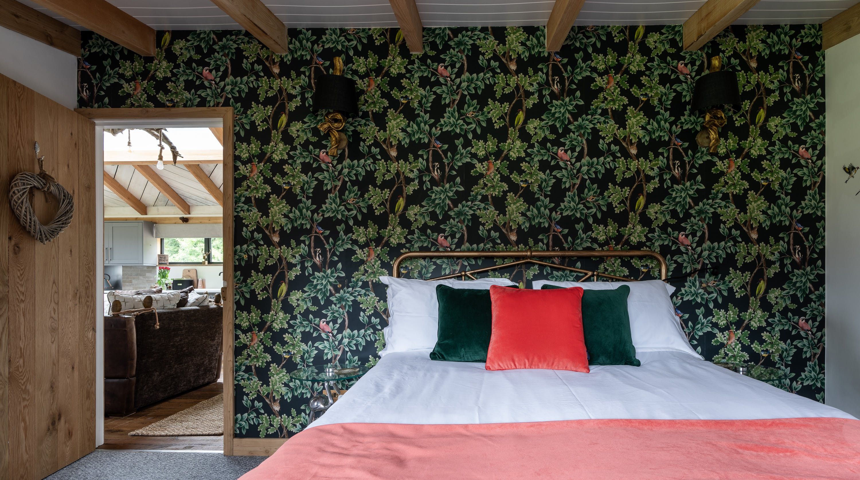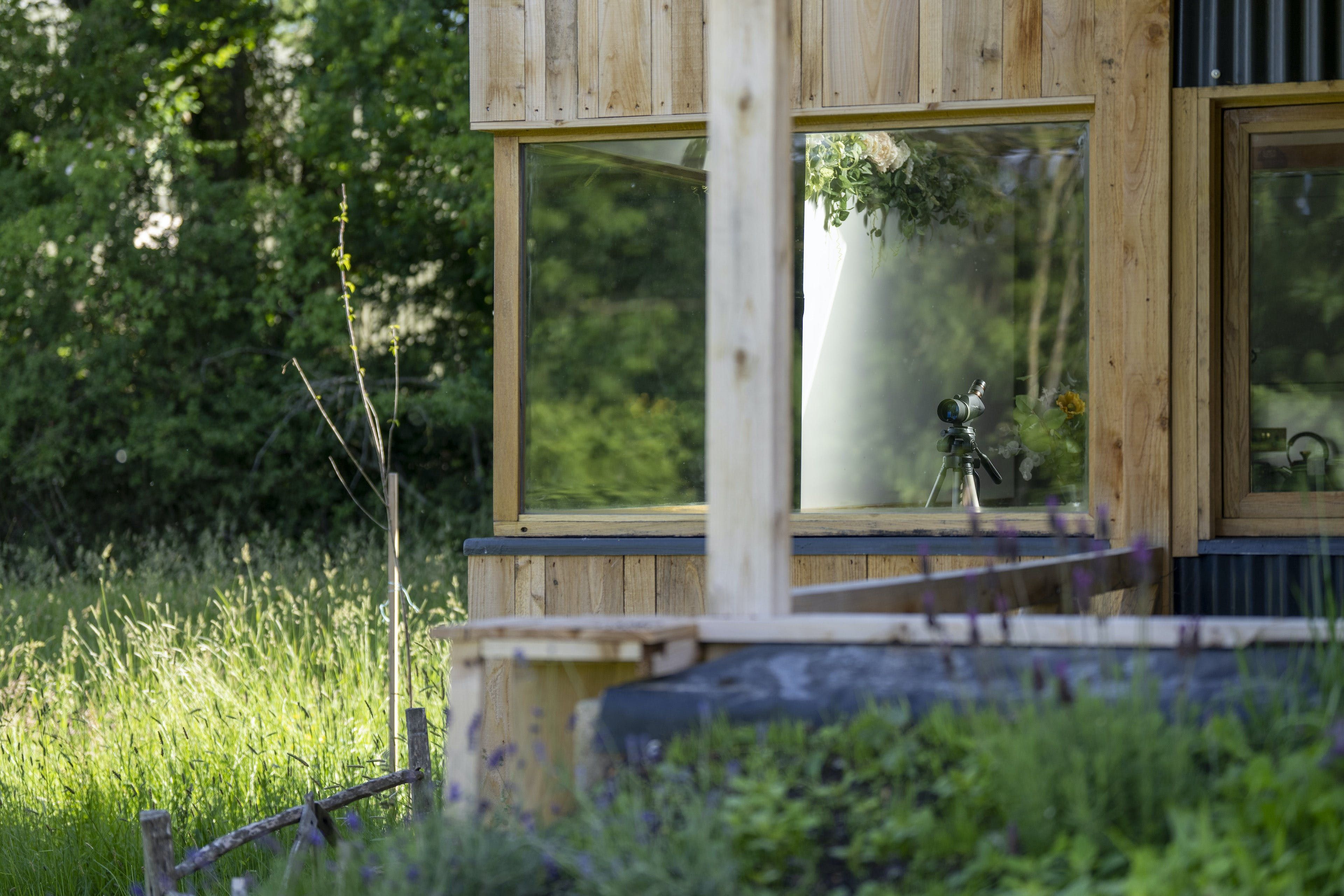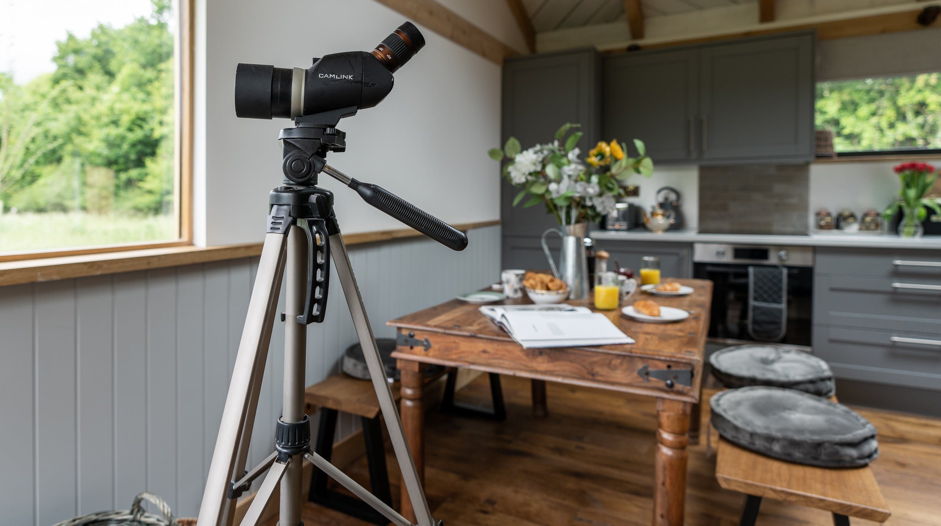 The interior is a reflection of the wilderness location, with wooden artworks featuring fawns and birdlife on display in the cosy bedrooms. The window seat in the master makes for the perfect reading nook, overlooking the meadow, and there’s a desk in here should you need to work remotely. The vaulted, wood-beam ceiling is twisted with stringed lights for a fairytale effect and there’s plenty of room at the rustic wooden table for the group to dine inside (if you’re not enjoying an alfresco meal on the terrace, that is). Come evening time, the plush sofas in the living room are set around a wood-burning stove.