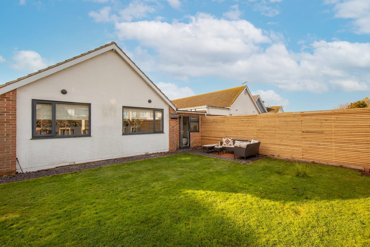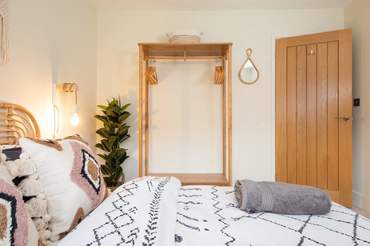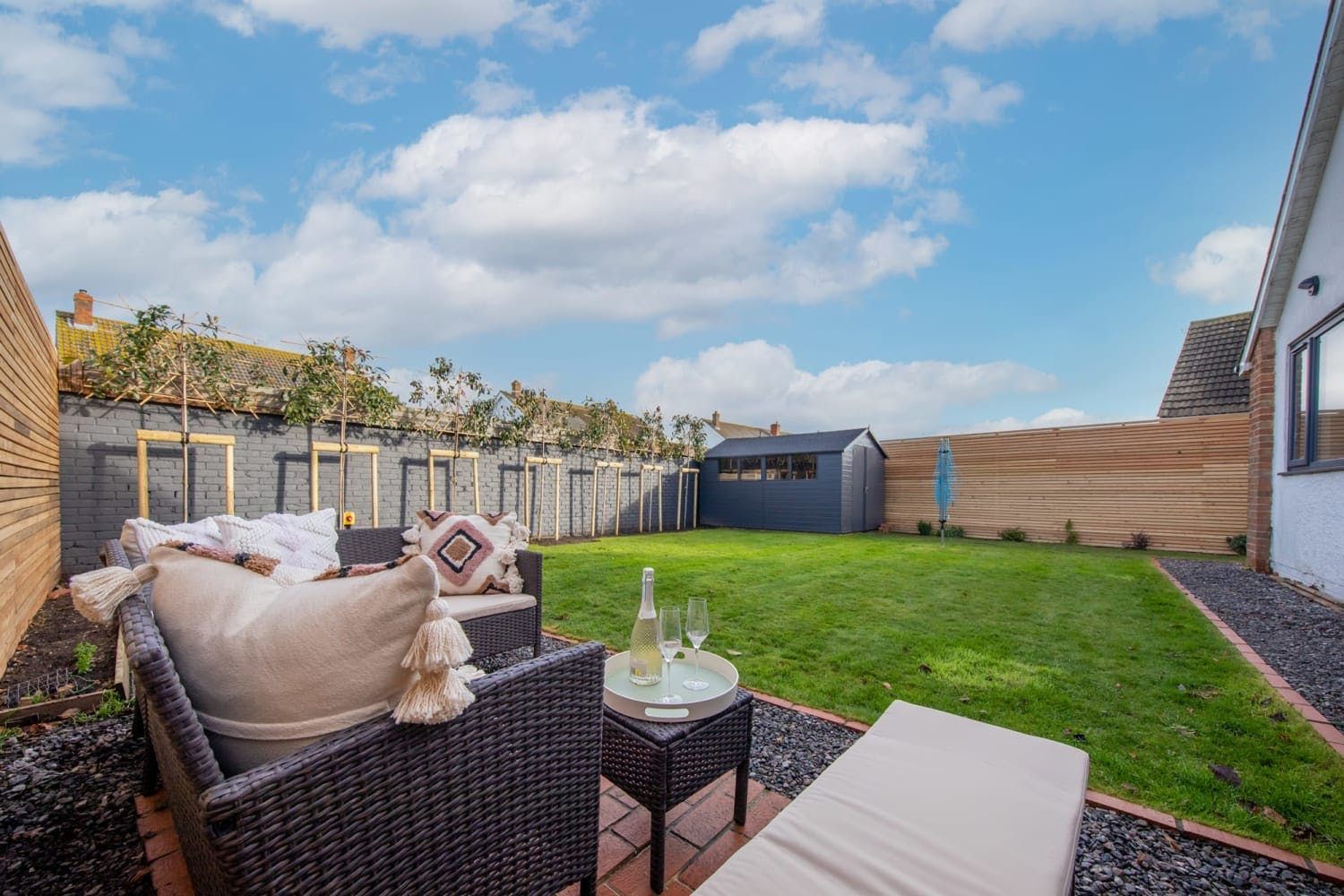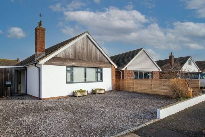 Back at this family bungalow, driftwood-hued cladding gives off an immediate beachy vibe. The back garden is a private suntrap where a wicker dining set sits on the astroturf and a hot tub awaits for a post-seaside soak. Heading inside, the open kitchen and living room is a social space, soothing in pebble-grey and white. There’s a second seating nook at the back of the house, perfect for a kids’ hang-out space. Plus, the playroom and bunkbed bedroom let you know this place has been designed with families in mind.