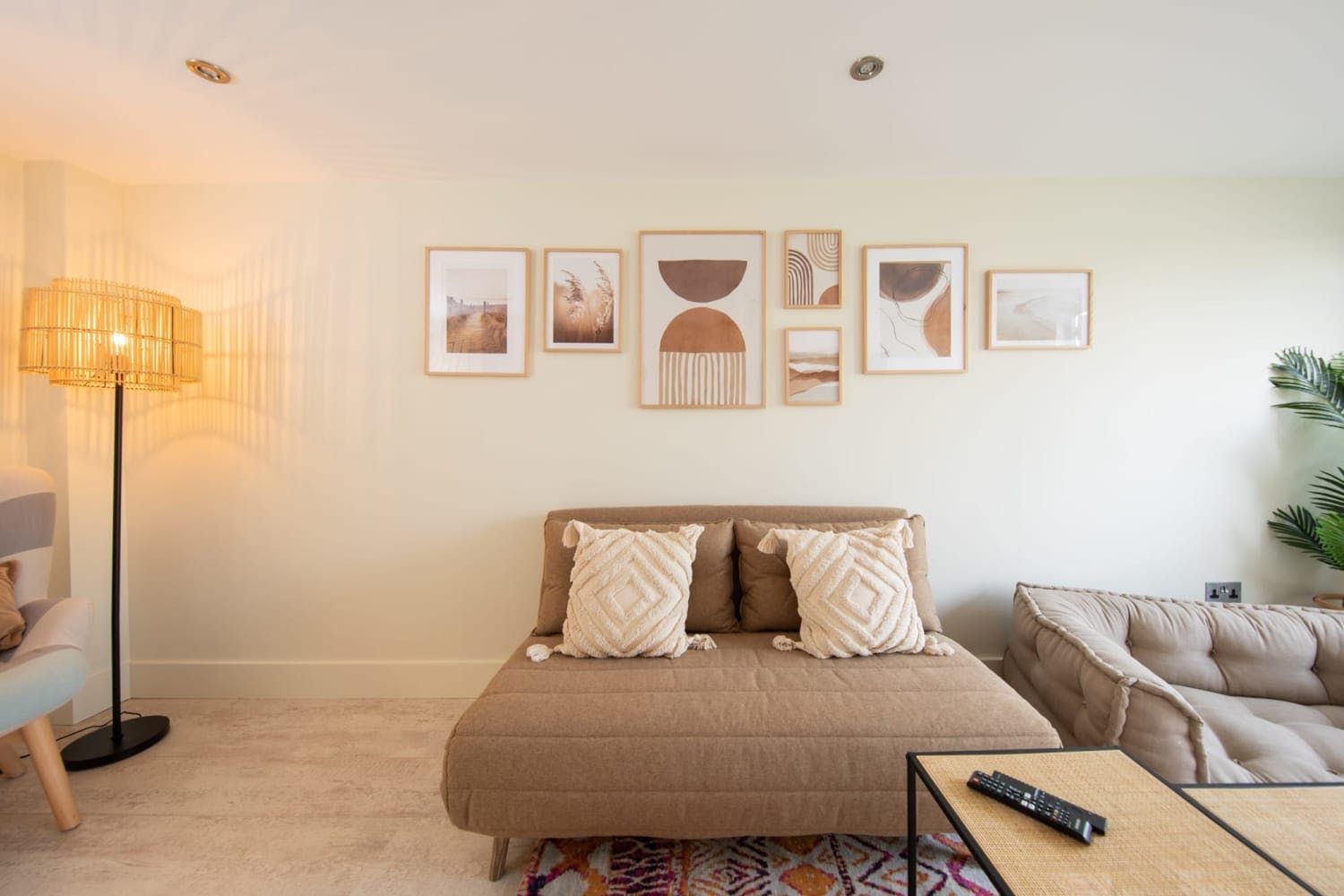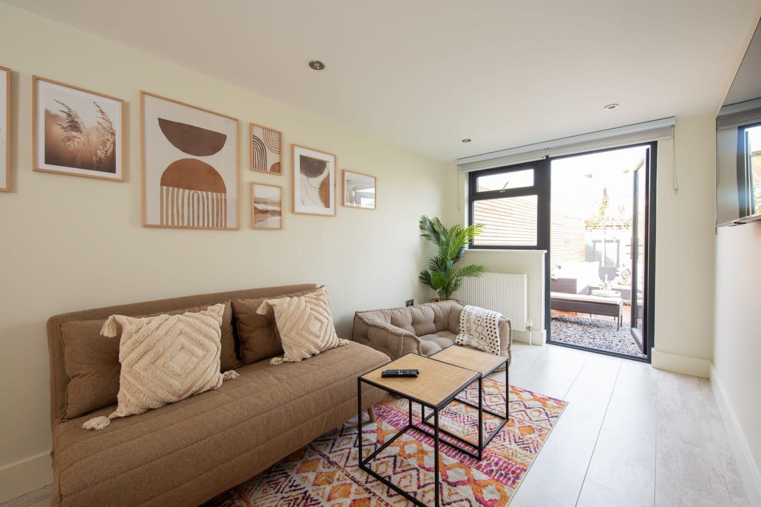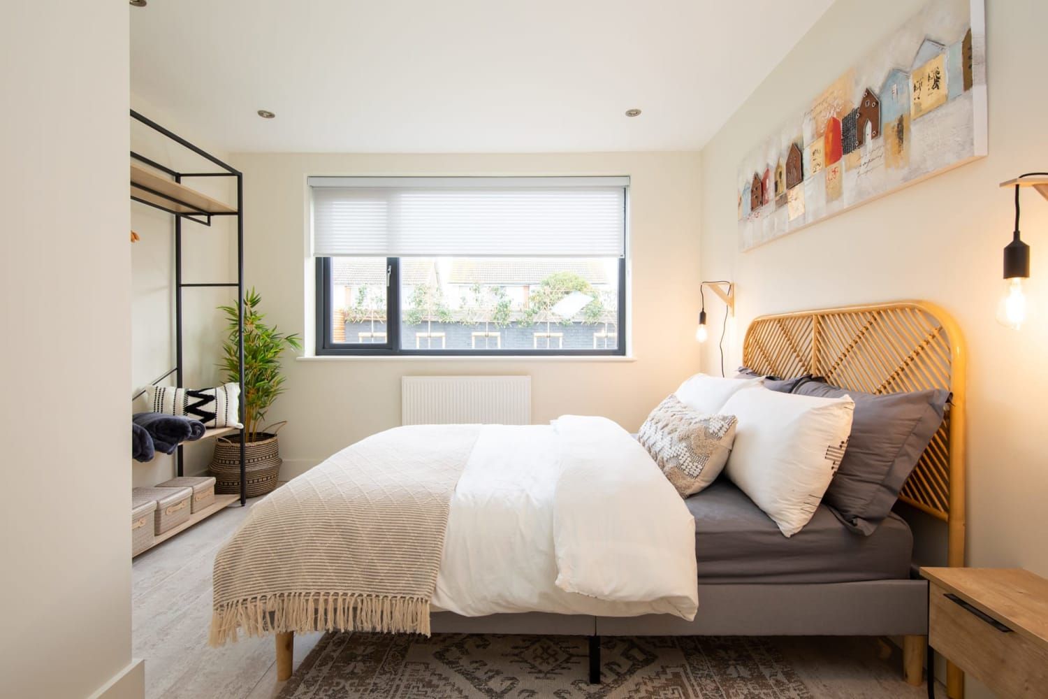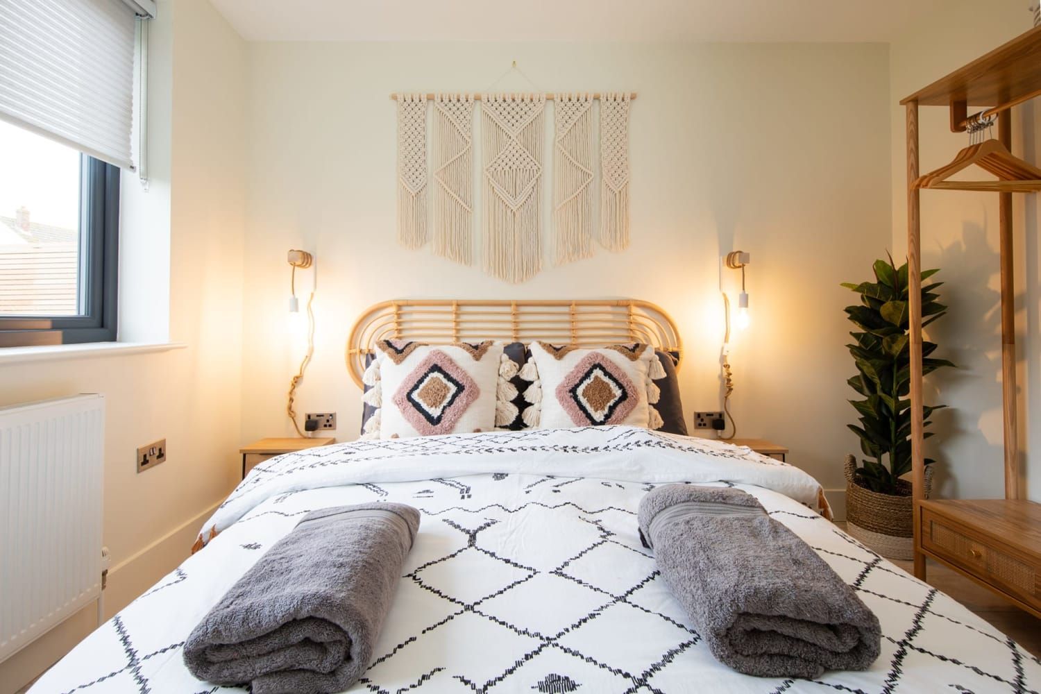 Back at this family bungalow, driftwood-hued cladding gives off an immediate beachy vibe. The back garden is a private suntrap where a wicker dining set sits on the astroturf and a hot tub awaits for a post-seaside soak. Heading inside, the open kitchen and living room is a social space, soothing in pebble-grey and white. There’s a second seating nook at the back of the house, perfect for a kids’ hang-out space. Plus, the playroom and bunkbed bedroom let you know this place has been designed with families in mind.