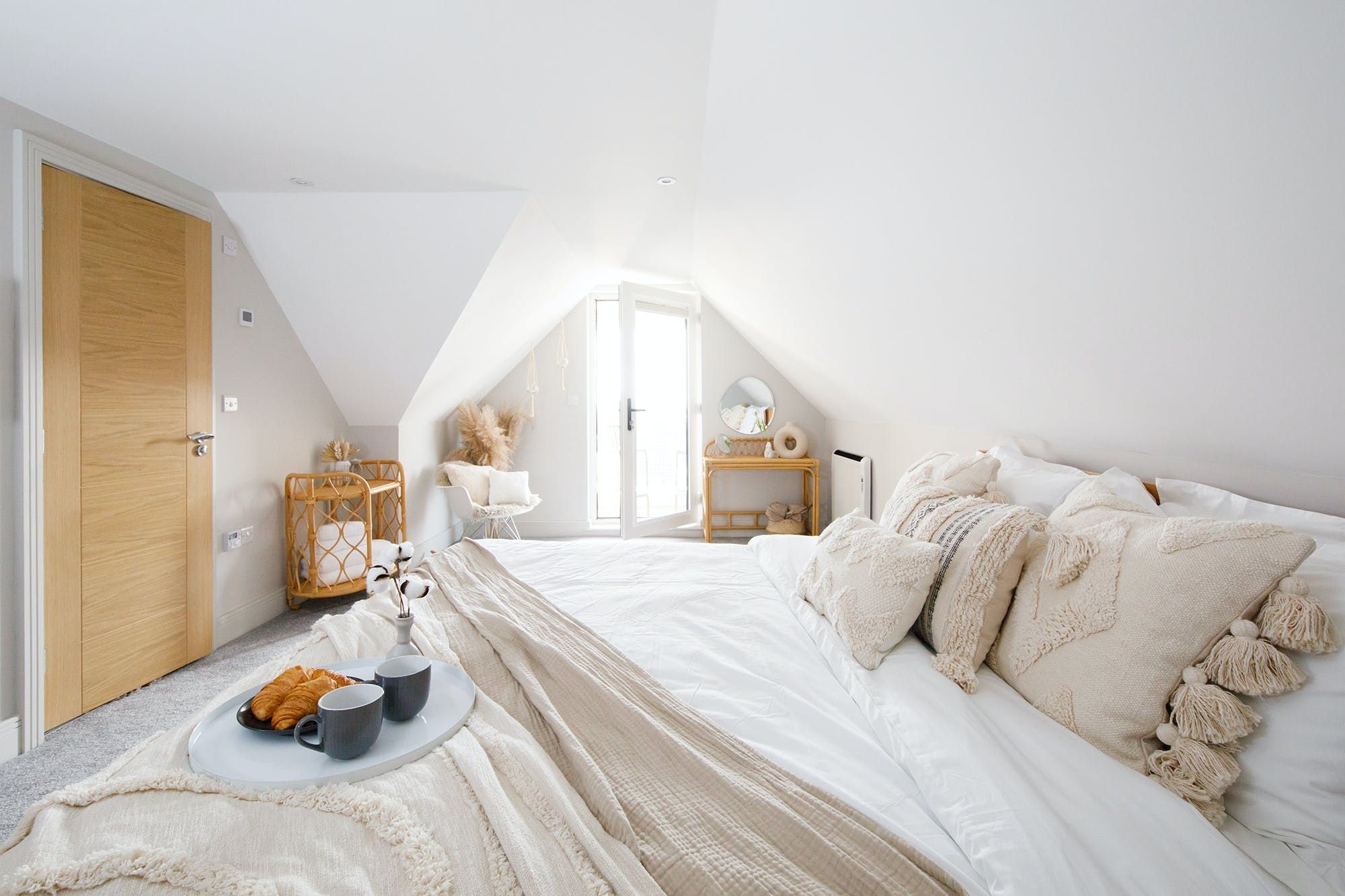 Elsewhere, the main bedroom makes clever use of soft earth tones and natural materials to create a soothing space, while the second bedroom uses a gorgeous deep blue colour palette to help you unwind before bed.
