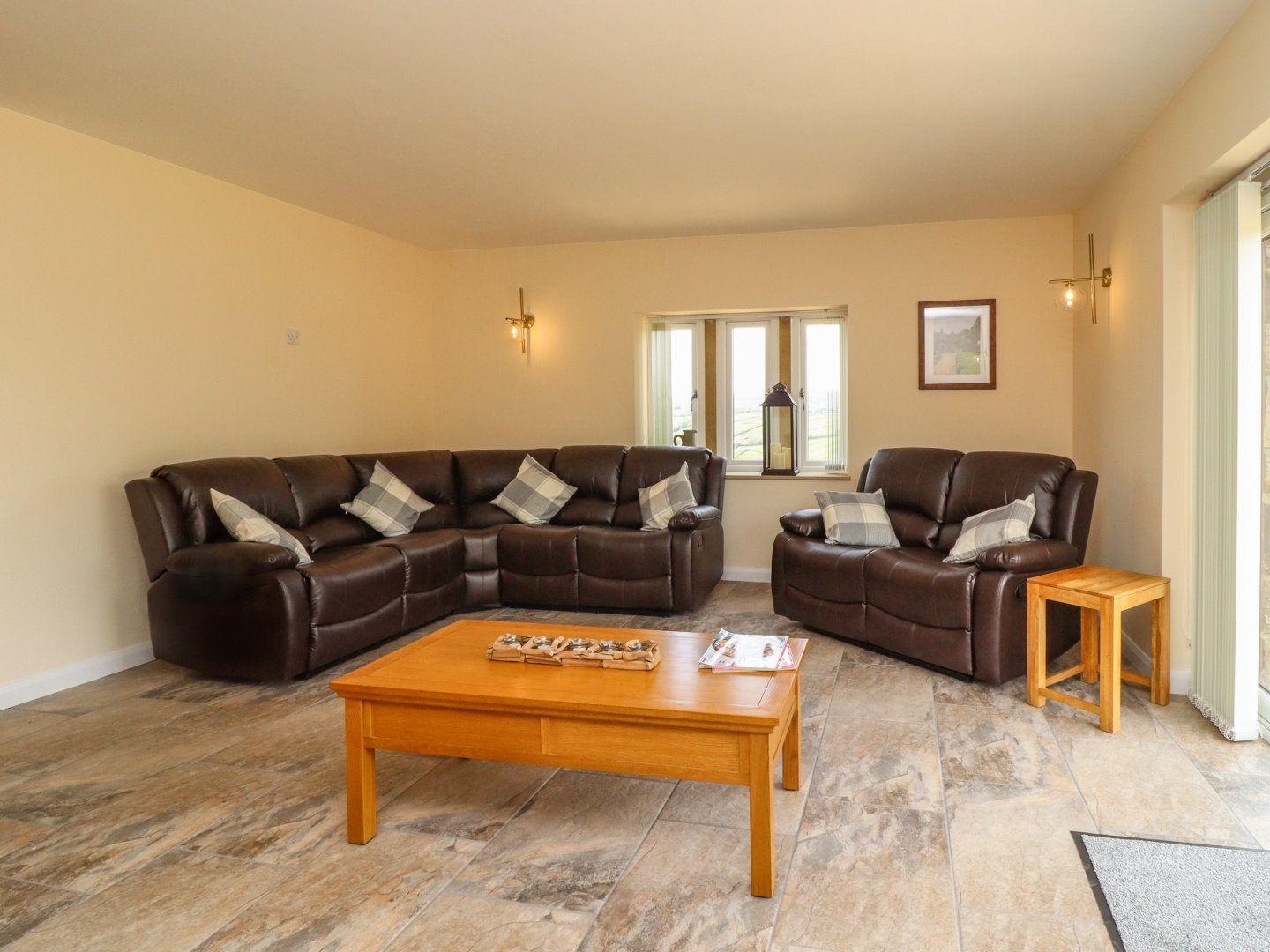 Single-storey. Three bedrooms: 2 x double, 1 x twin. Shower room with walk-in shower, basin, heated towel rail and WC. Cloakroom with basin and WC. Open-plan living space with kitchen, dining area and sitting area. Garage/utility